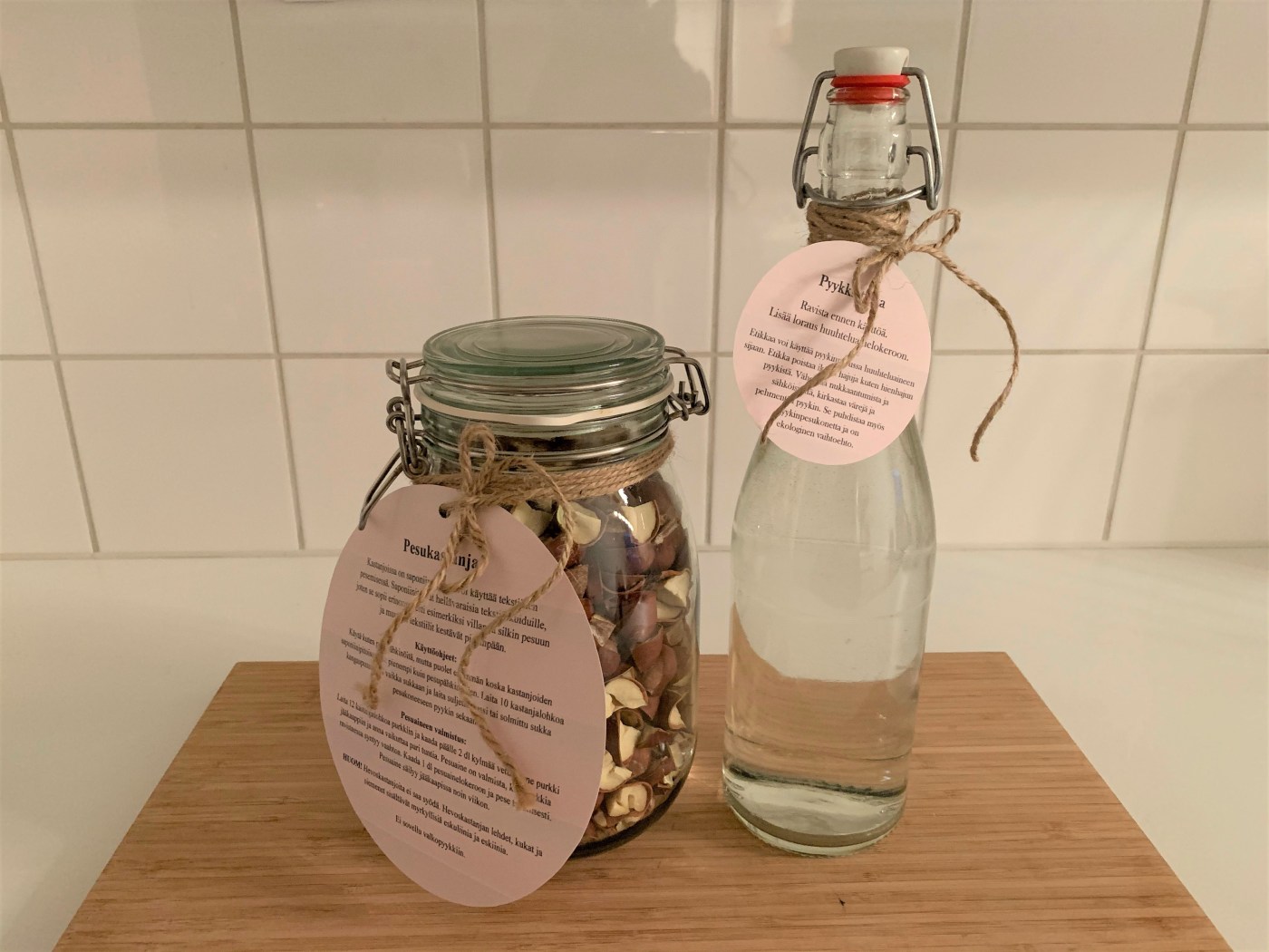 Laita 12 kastanjalohkoa purkkiin ja kaada päälle 2 dl kylmää vettä. Pane purkki jääkaappiin ja anna vaikuttaa pari tuntia. Pesuaine on valmista, kun purkkia ravistaessa syntyy vaahtoa.