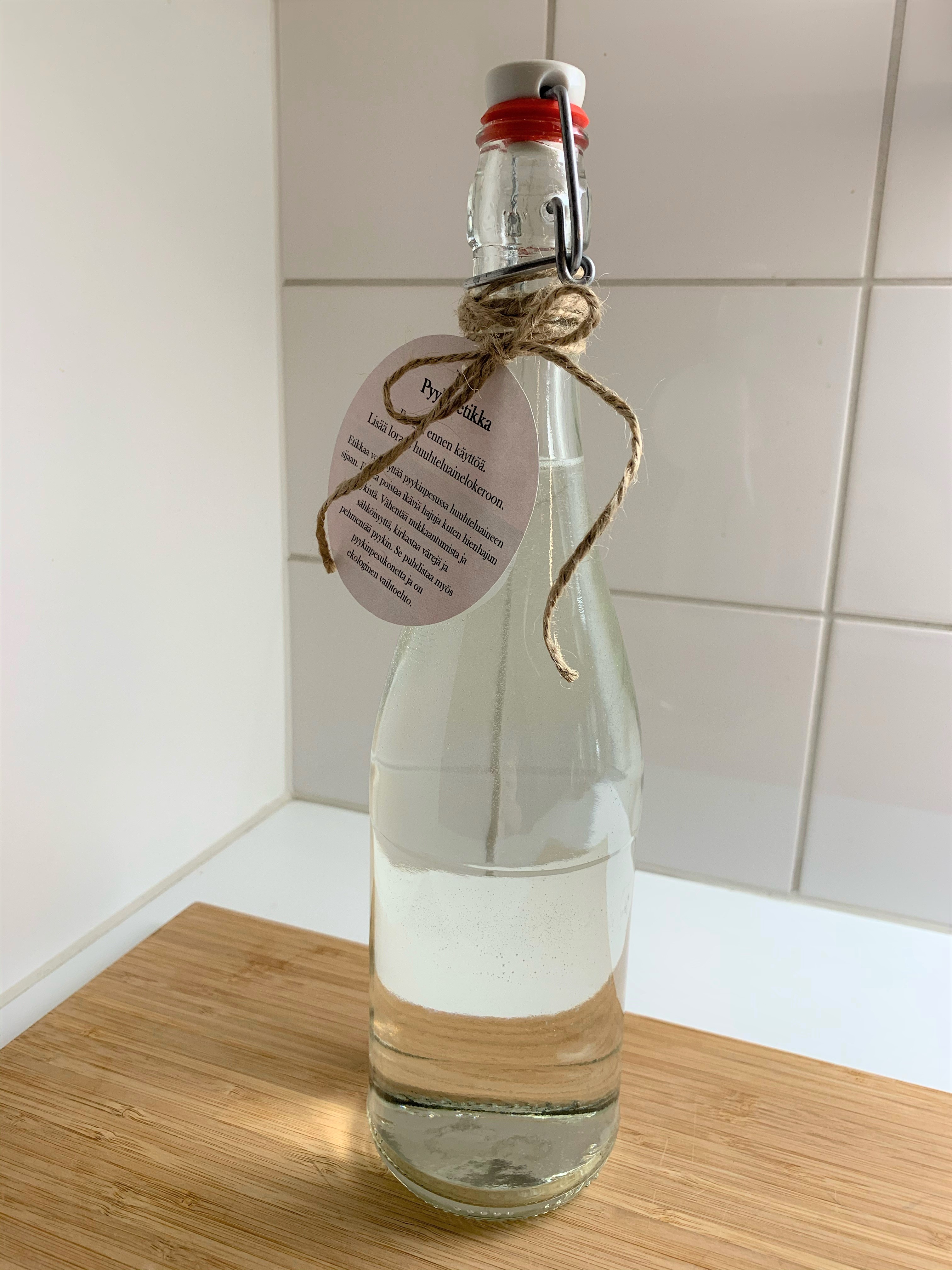 Etikka poistaa ikäviä hajuja kuten hienhajun pyykistä. Vähentää nukkaantumista ja sähköisyyttä, kirkastaa värejä ja pehmentää pyykin. Se puhdistaa myös pyykinpesukonetta ja on ekologinen vaihtoehto. Itse olen käyttänyt vuosia hienostelematta suoraan väkiviinaetikkapullosta lorauksen huuhteluaineena, mutta lahjaksi sopii tehdä laimennettu, tuoksuva ja nätissä pullossa oleva pyykkietikka.