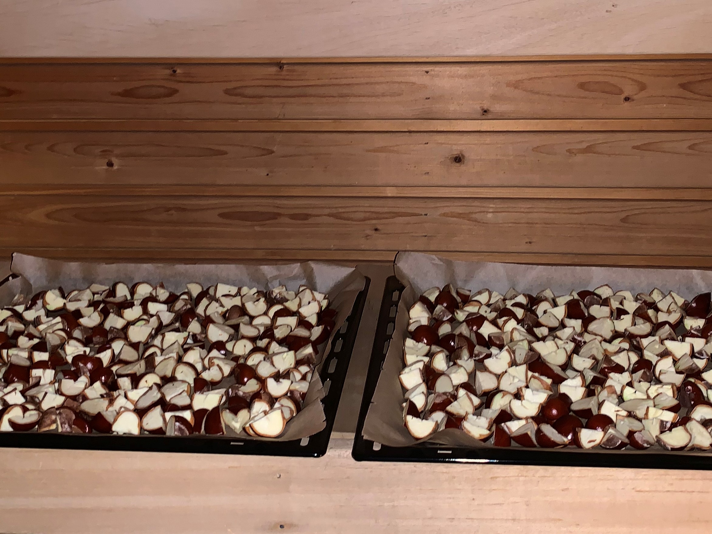 Pilko siemenet neljään osaan ja kuivata ne kuivassa ja lämpimässä paikassa, kuten saunassa. Kuivatut kastanjat voi säilyttää purkissa huoneenlämmössä.
