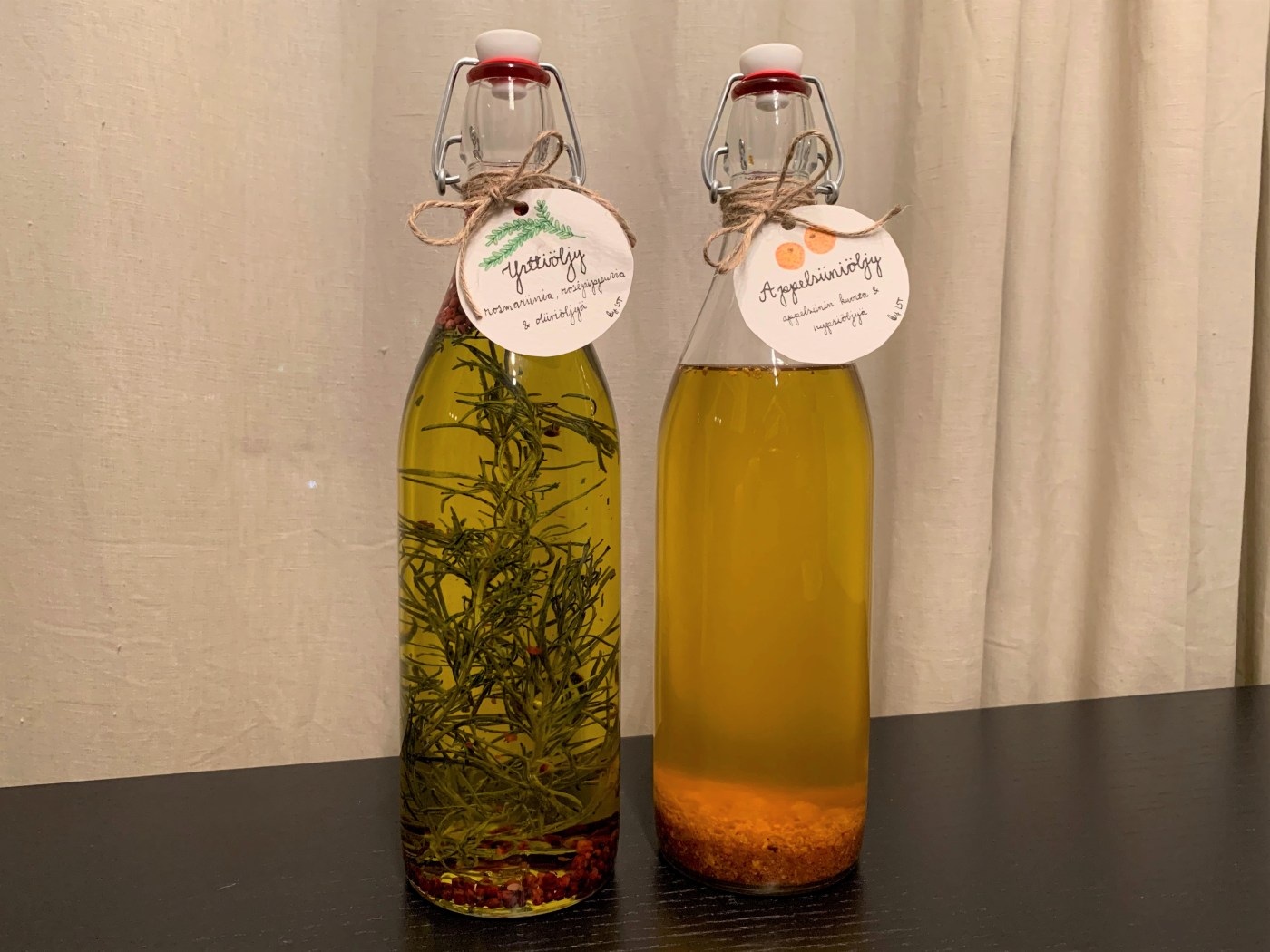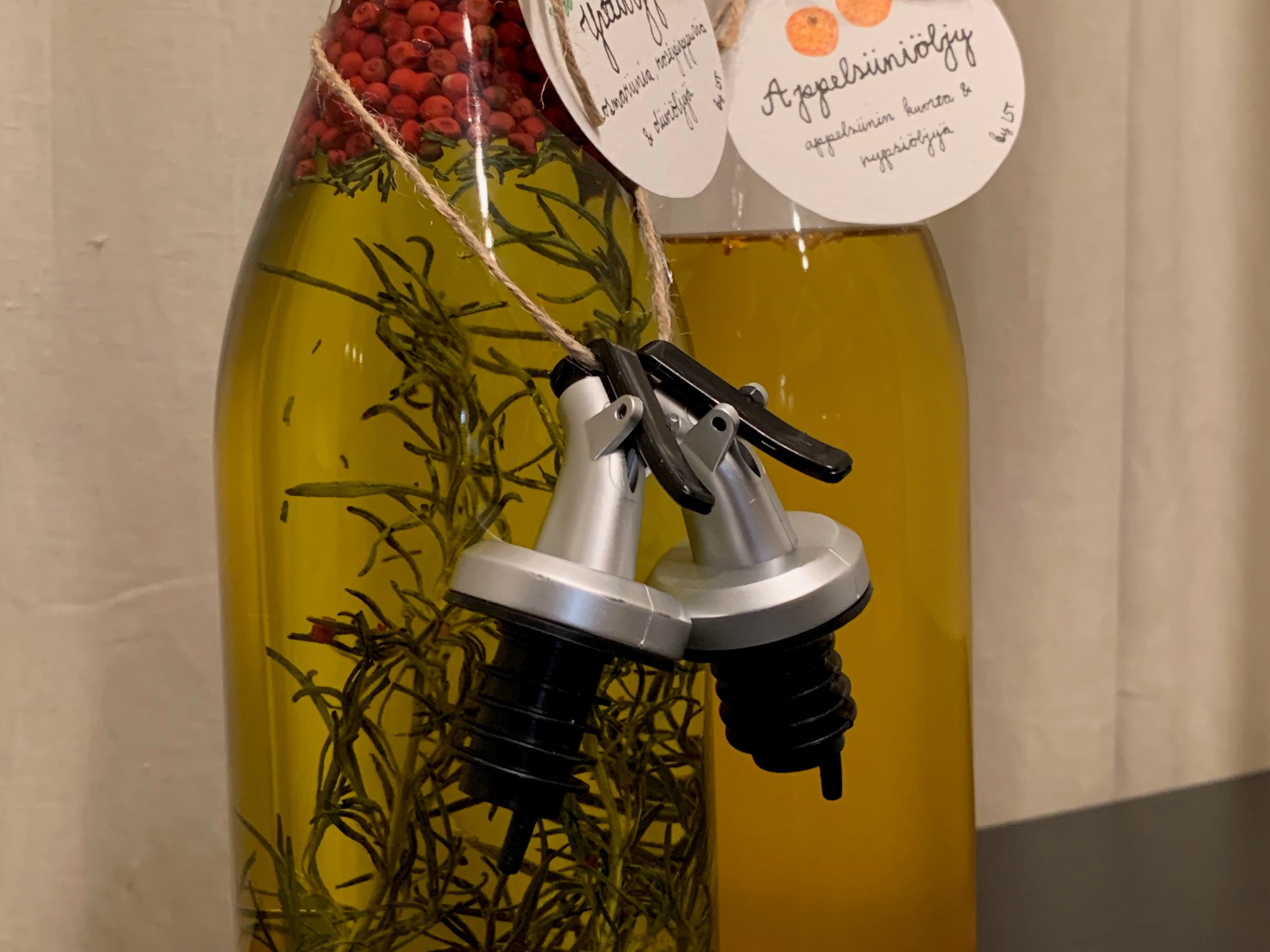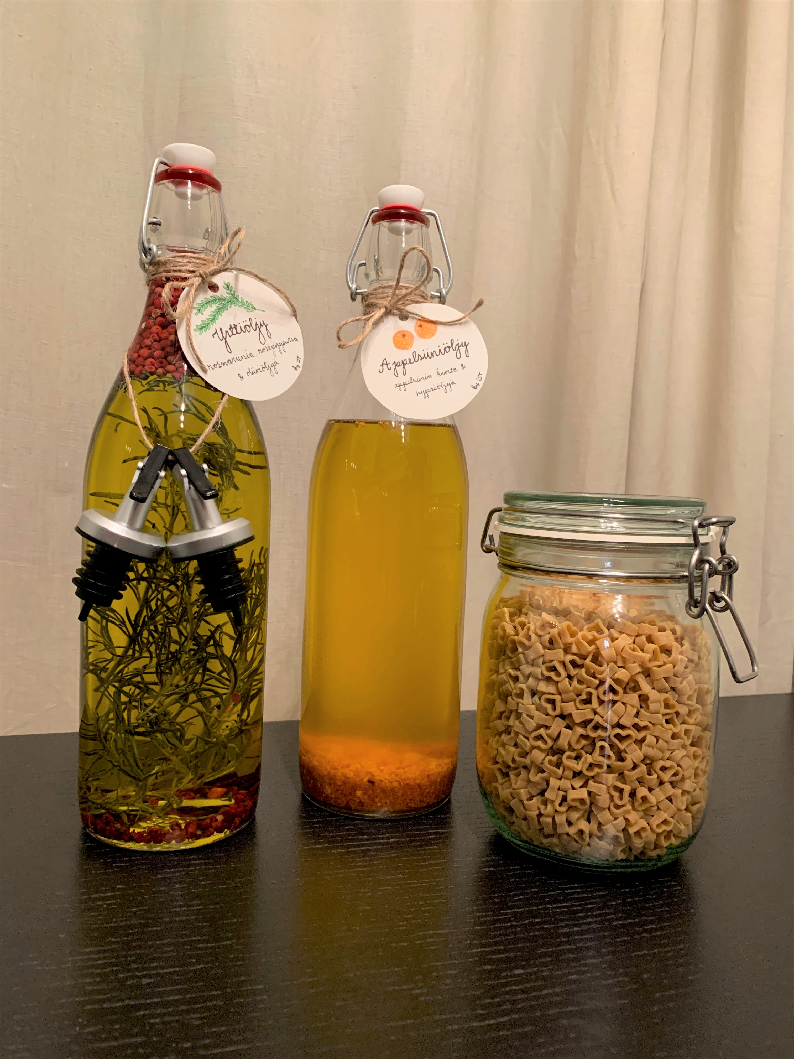 Maustetut öljyt sopivat hyvin salaatteihin ja ruuanlaittoon. Hyvä lahja niin herkkusuulle kuin terveysintoilijalle. Itse annan nämä ihmiselle jolla on jo kaikkea joten parempi antaa kulutustavaraa. Laitoin mukaan vielä kaatonokat (tosin en tiedä tukkivatko pippurit kaatonokan) ja purkin pastaa.