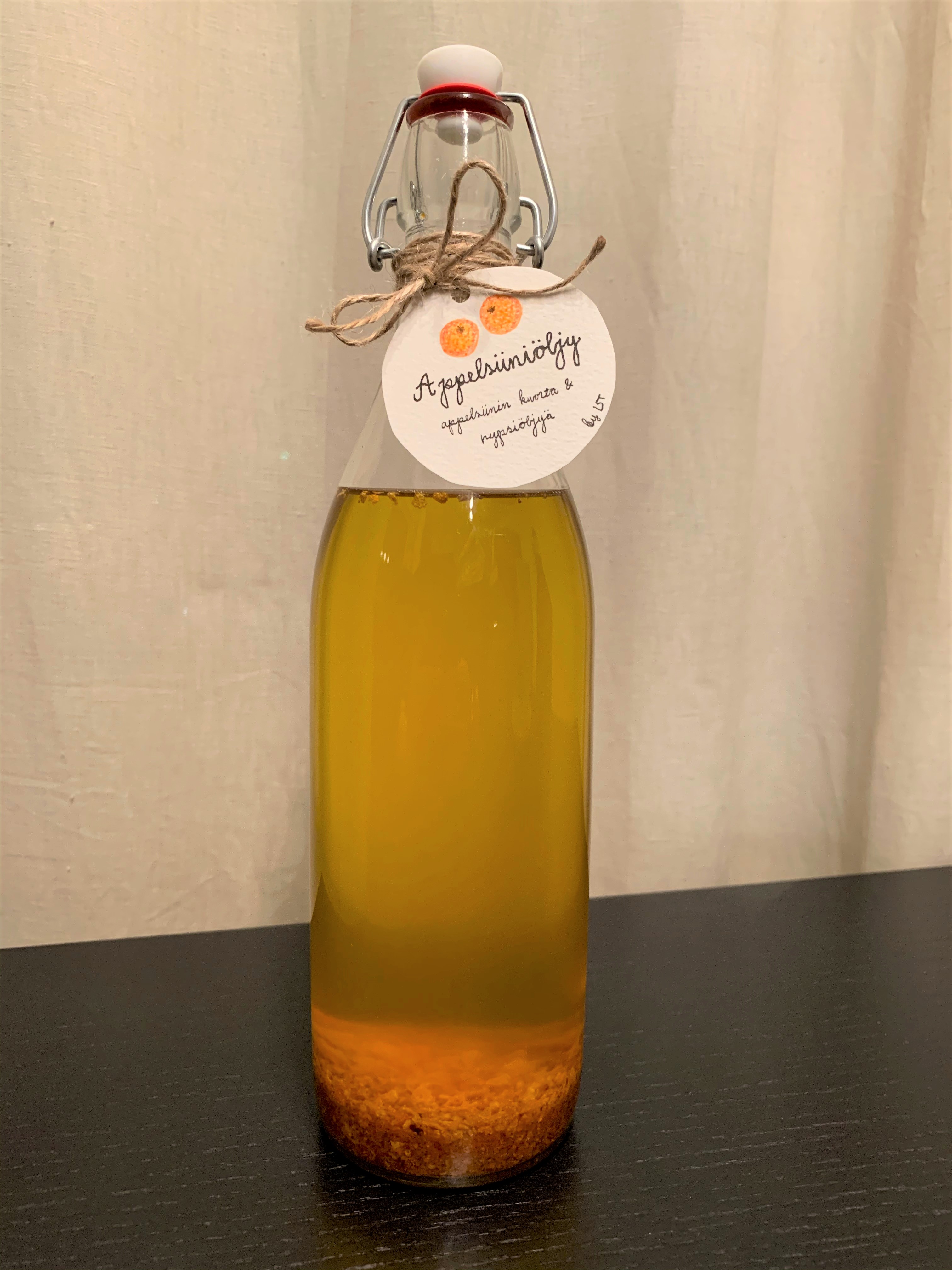 Vuole hyvin pestyistä luomu appelsiineista oranssi kuori ohuina suikaleina niin ettei mukaan tule valkoista kuorta. Kuivaa kuoret rapeiksi miedolla lämmöllä uunissa, pyöräytä kuoret hienoksi tehosekoittimessa ja kaada pullon pohjalle. Öljy on valmista käytettäväksi jo muutamassa päivässä, mutta maustuu tietenkin enemmän vanhetessaan. Säilyy paremmin pimeässä ja viileässä.