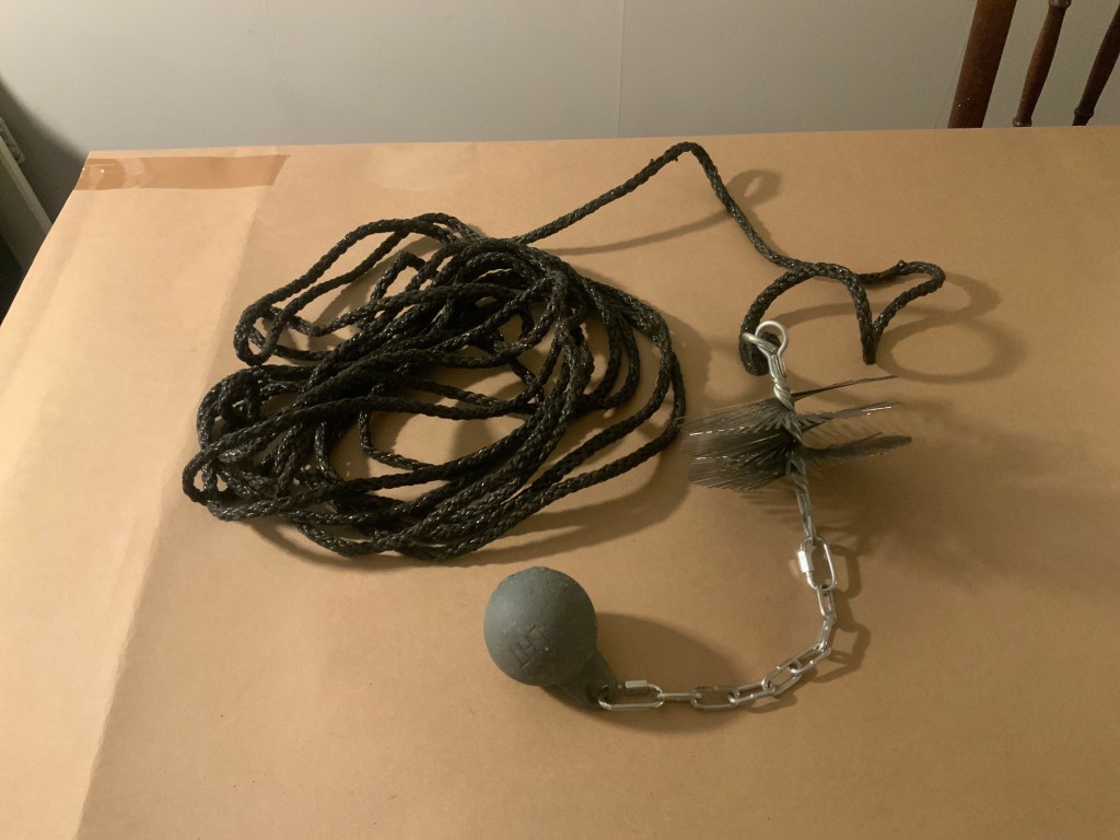 No eikun katolle tutkimaan piipun syövereitä ja tottamooses! Tiukan näköinen tirpan pesä tukkii kokonaan yhden piipun rööreistä noin kaksi metriä piipun reunasta! Kaupasta oli ennakoivasti ostettu nuohous setti (Tokmanni 13€)