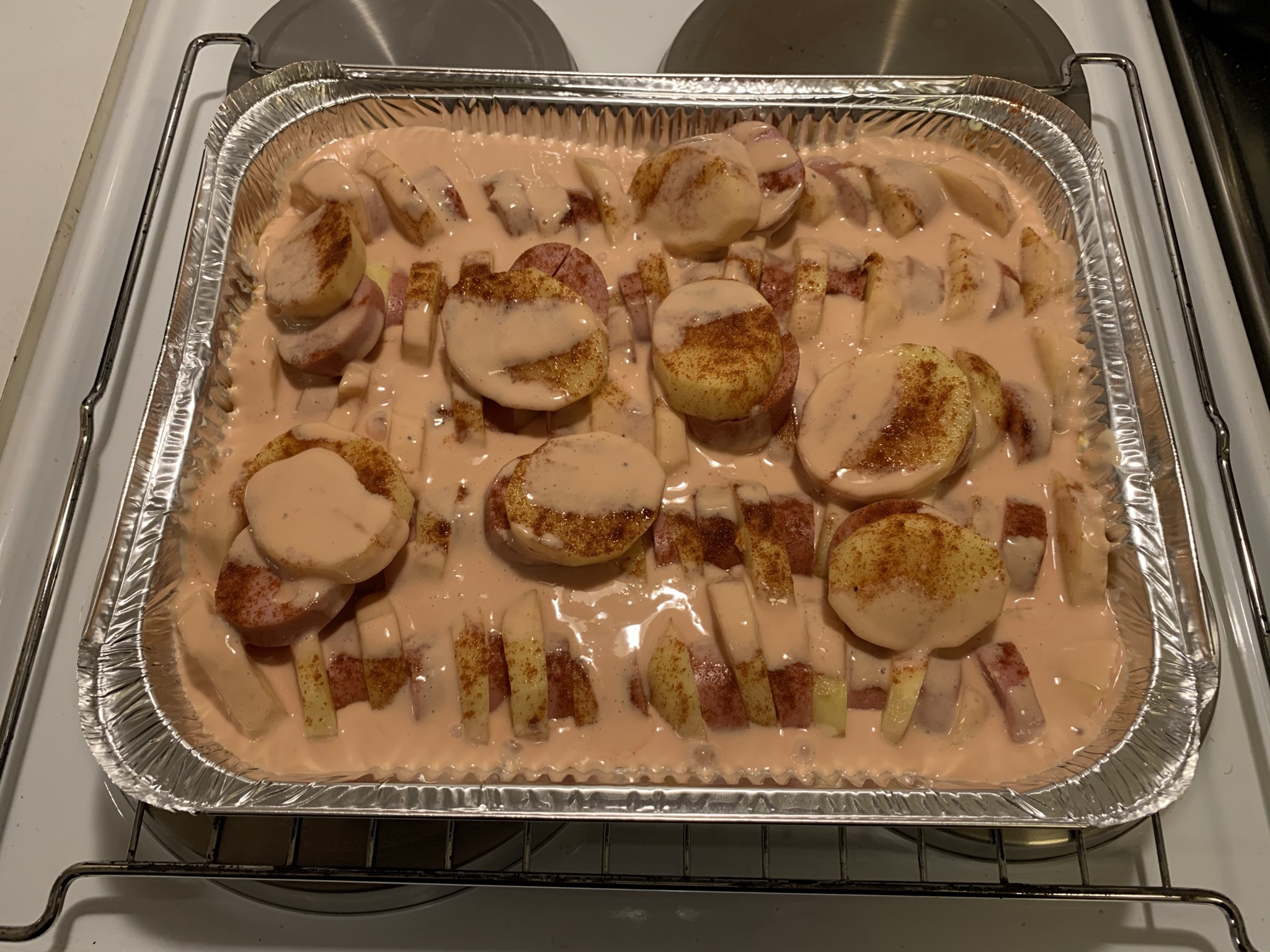 Kuori ja viipaloi perunat ja makkarat. Voitele vuoka voilla. Asettele vuokaan vuorotellen peruna ja makkara viipaleita riviin. Ripottele päälle paprikajauhetta. Sekoita kulhossa maito, ranskankerma, tomaattimurska ja loput mausteet. Kaada maitoseos vuokaan ja ripottele päälle juustoraastetta. Paista 200 asteisessa uunin alaosassa noin 60 minuuttia. Peitä foliolla kun pinta on ruskistunut sopivasti.
