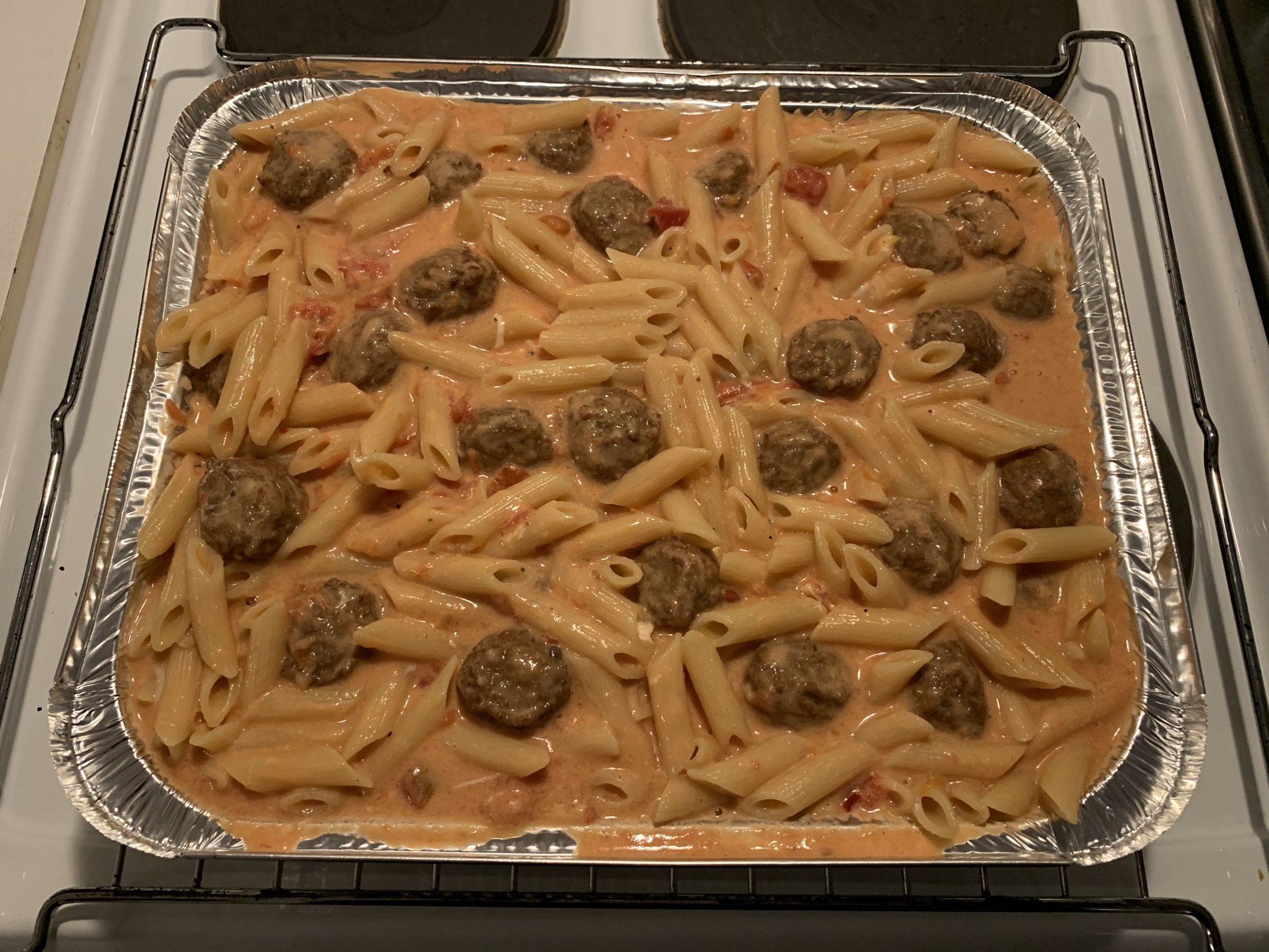 Esikeitä pennepasta kattilassa suola-öljyvedessä noin puolet ohjeen keittoajasta. Siivilöi pasta ja sekoita lihapullien kanssa vuokassa. Sekoita kulhossa maito, tuorejuusto, tomaattimurska ja mausteet. Kaada maitoseos vuokaan ja taas sekoittele hieman. Ripottele pinnalle juustoraastetta ja nosta uunin keskitasolle 200 asteeseen noin puoleksi tunniksi.