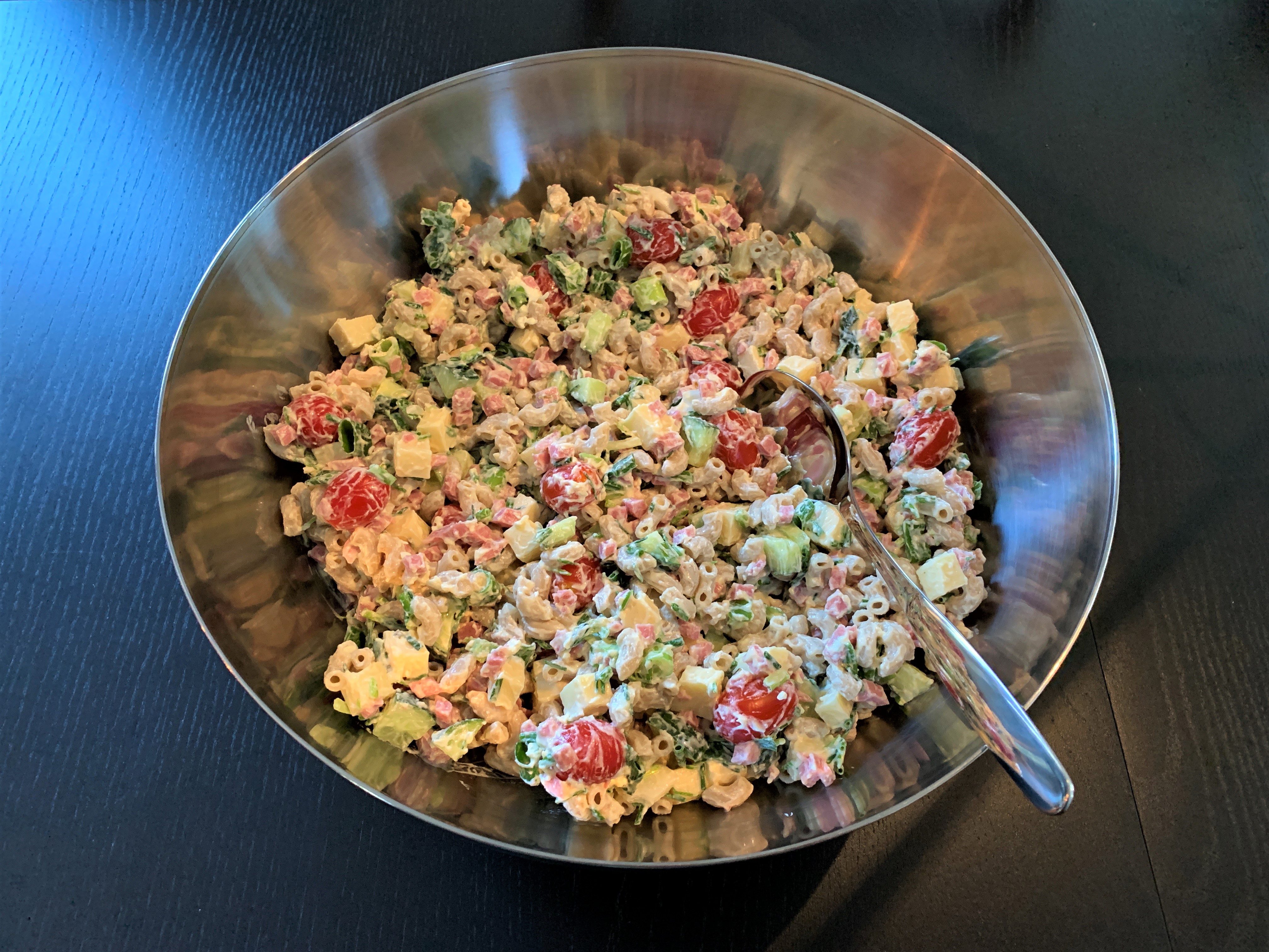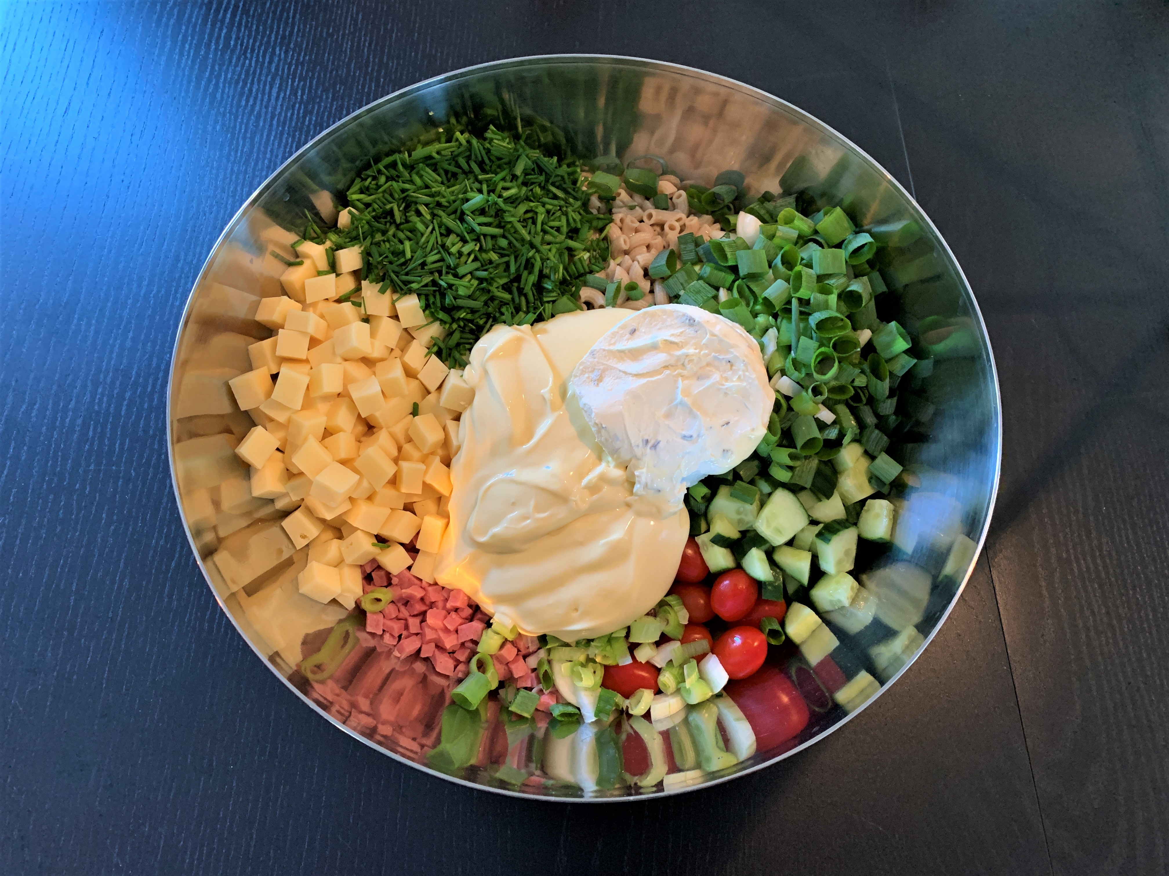 Keitä makaronit kypsäksi kasvisliemessä ja huuhdo kylmällä vedellä. Pilko kasvikset, juusto ja kinkku kulhoon. Lisää makaronit, majoneesi, tuorejuusto, ripaus suolaa ja sekoita. Itse en pilkkonut miniluumutomaatteja jottei salaatista tulisi vetistä ja näin se säilyy parempana pidempään. Tarjoile vaikka grillimakkaran kanssa.