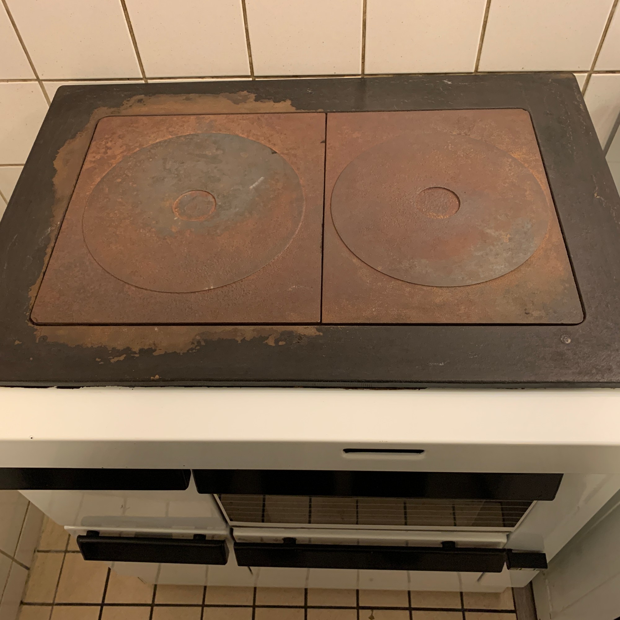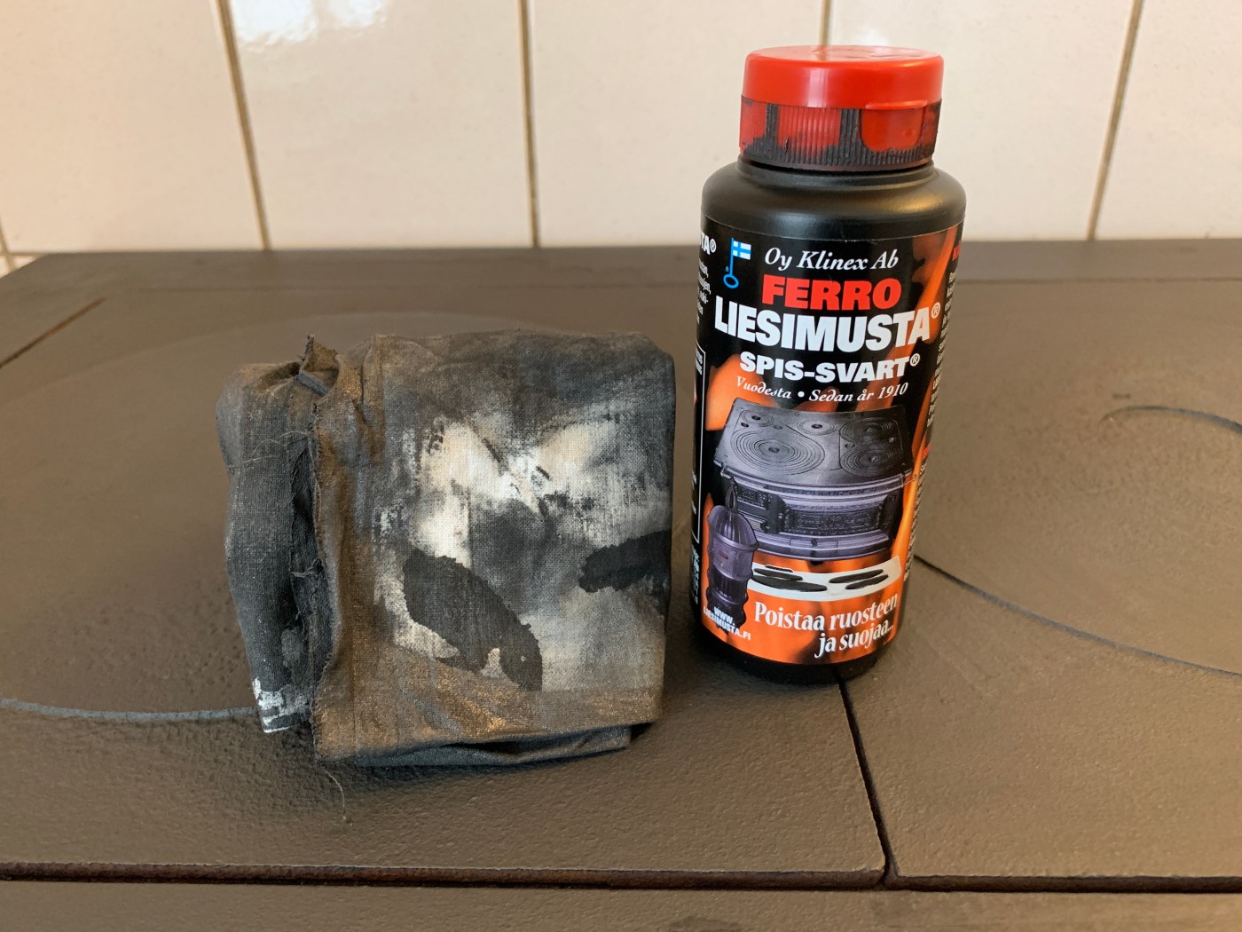 Talon vanha Leino Siro puuhella ja Elektro Helios sähköliesi valurautalevyillä toimivat ihan hyvin joten eivät menneet vielä vaihtoon. Sen sijaan pesin ne hyvin ja poistin irtonaisen ruosteen teräsvillalla. Levitin ohuelti rievun avulla Ferro Liesimustaa kylmälle pinnalle. Ferro Liesimusta poistaa ruosteen ja antaa nätin mustan, suojaavan pinnan.