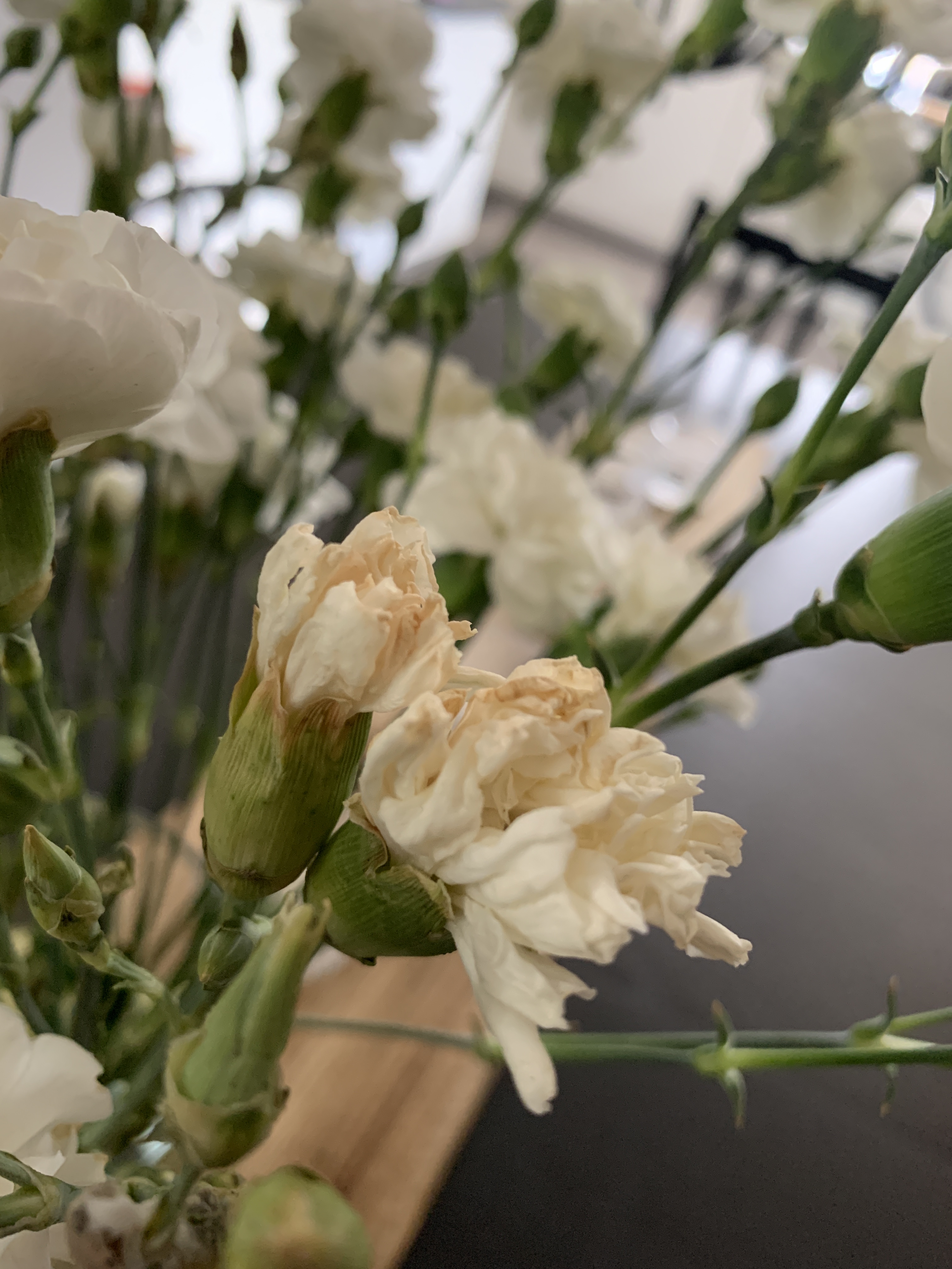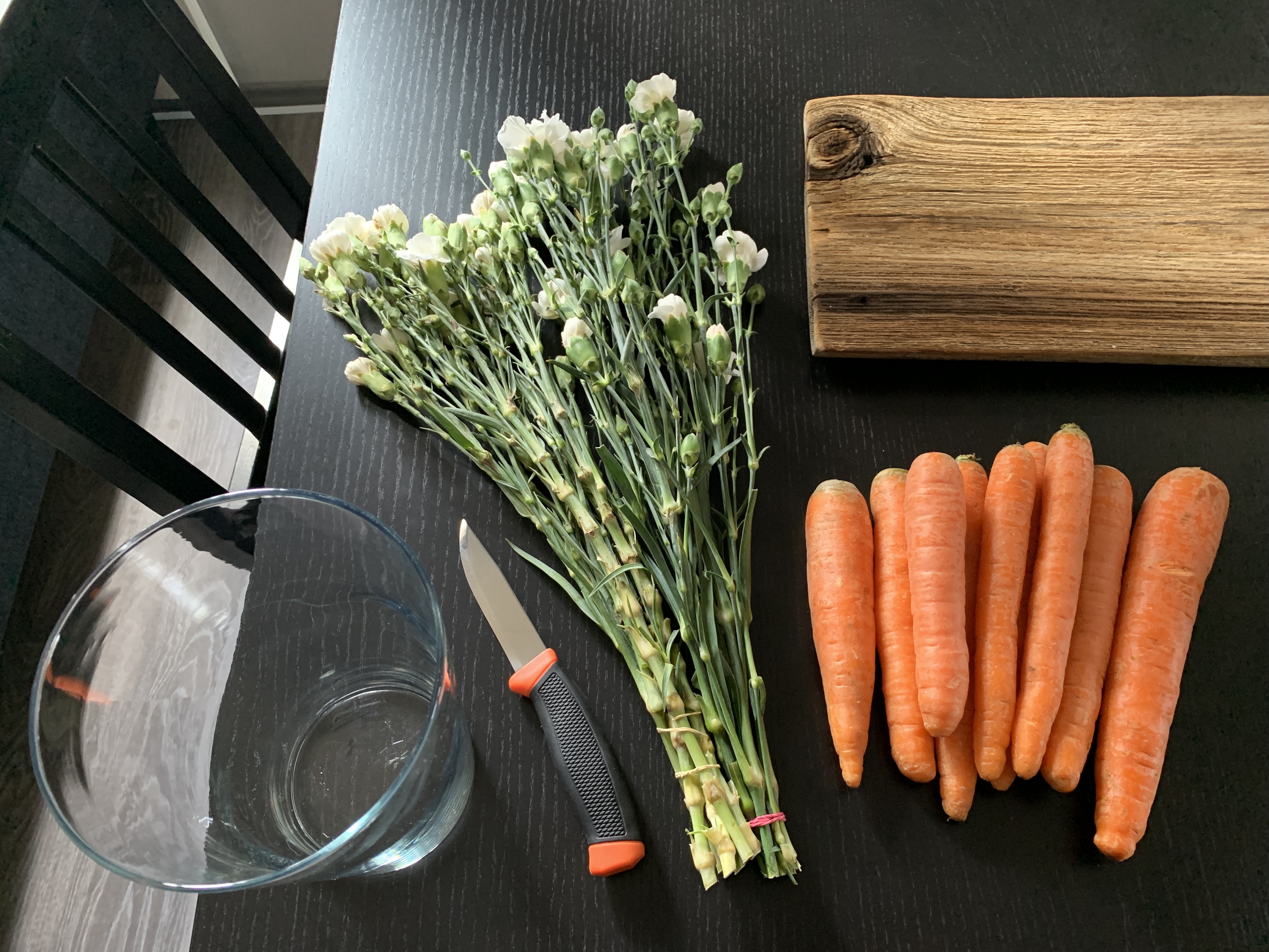 Leikkasin ohjeen mukaan terävällä puukolla viistoon uuden imupinnan neilikan varren nivelen yläpuolelta. Asettelin porkkanat maljakon reunoille ja neilikat keskelle ja täytin kylmällä vedellä johon lisäsin yhden kimppujen mukana tulleen kukkavirkisteen. Maljakon laitoin suht suojaiseen paikkaan koska neilikka ei viihdy suorassa auringonpaisteessa.