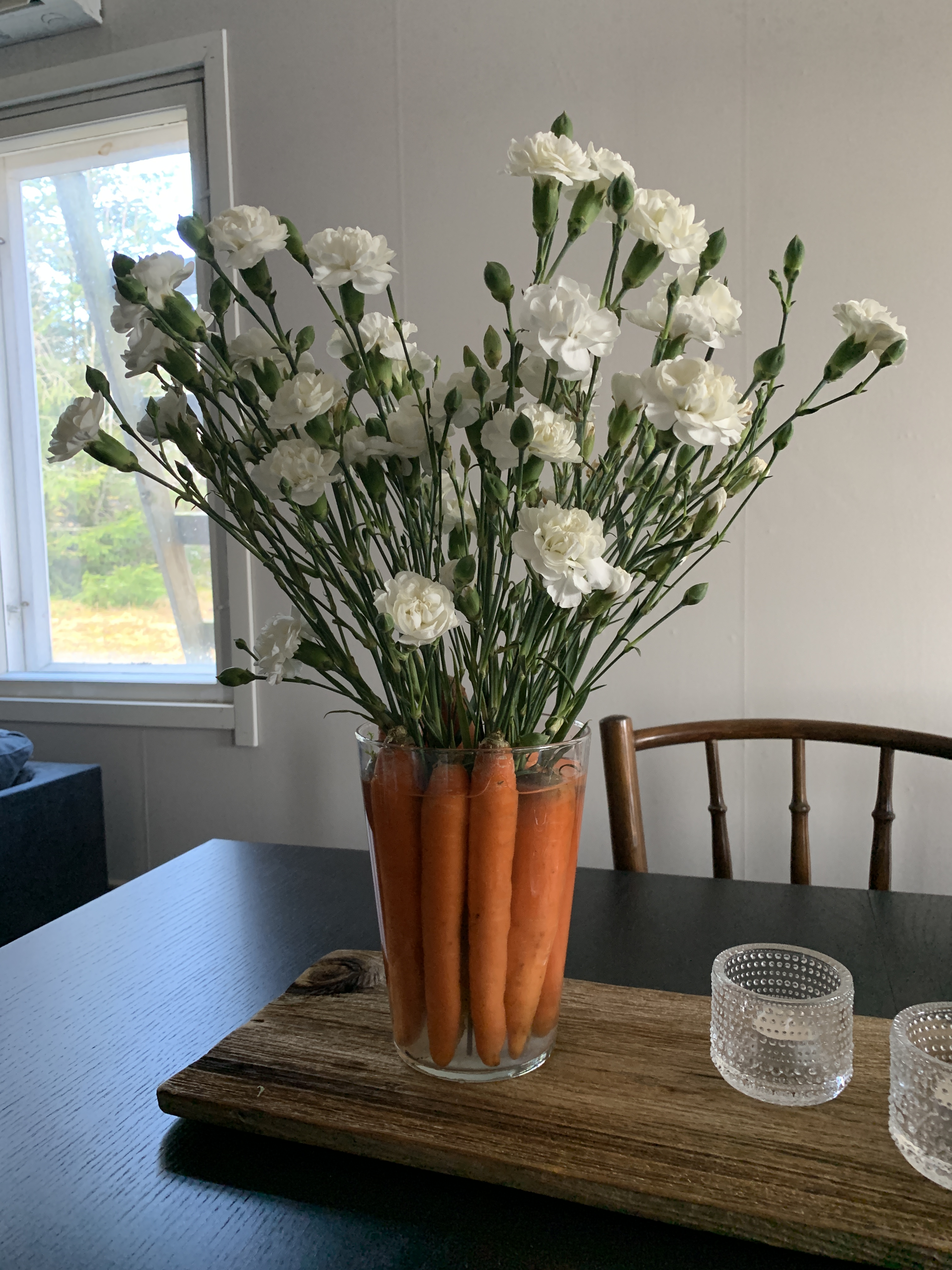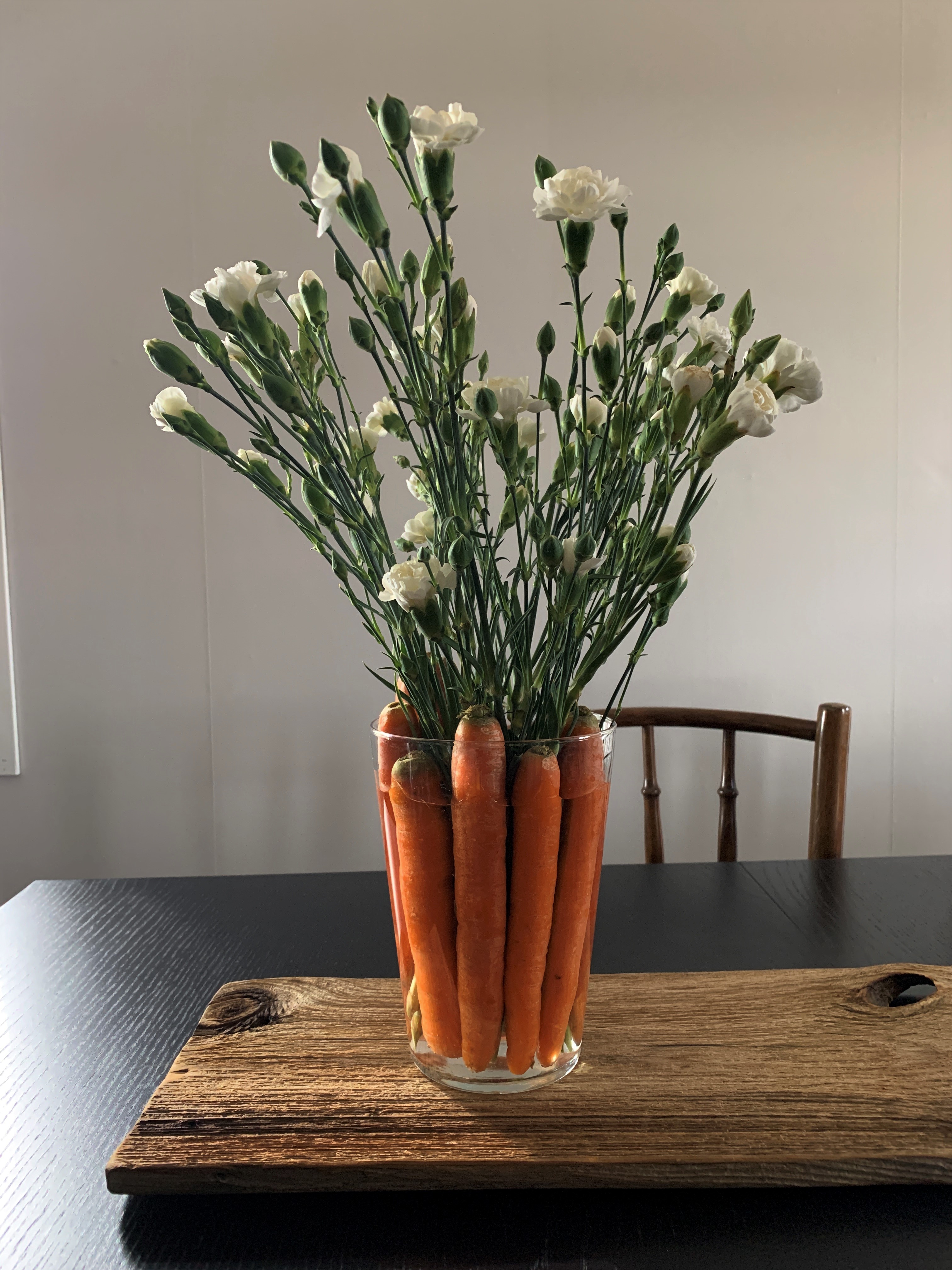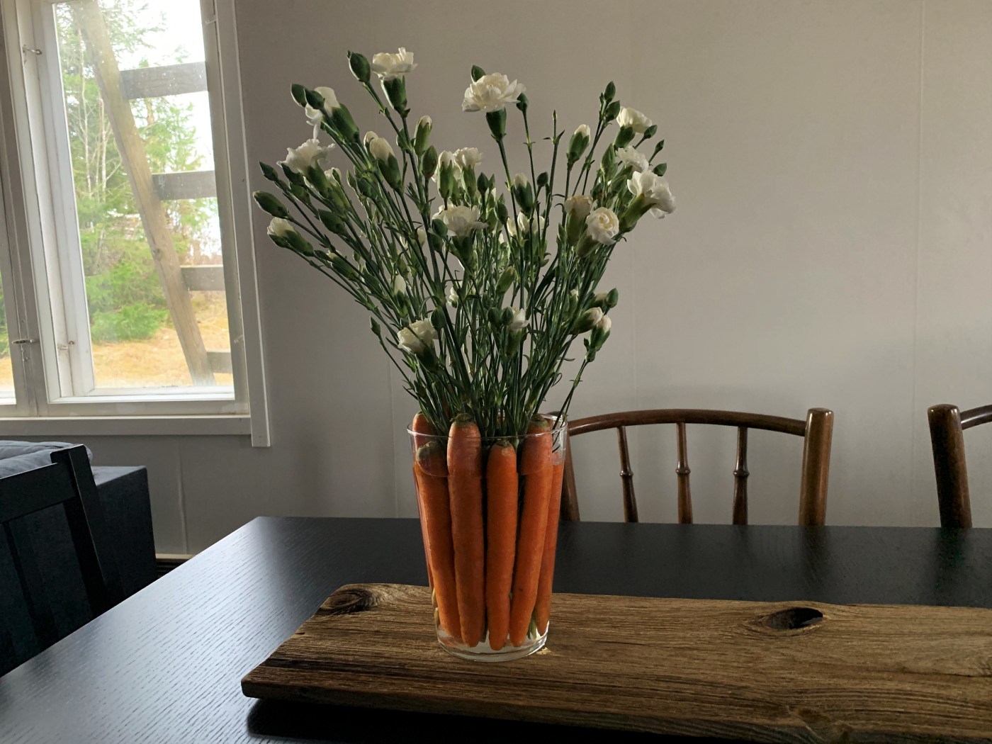 Ruokakaupasta heräteostoksena tehty kaksi kimppua valkoista terttuneilikkaa ja 1kg porkkanapussi kääntyi nopeaksi ja yksinkertaiseksi pääsiäisasetelmaksi.