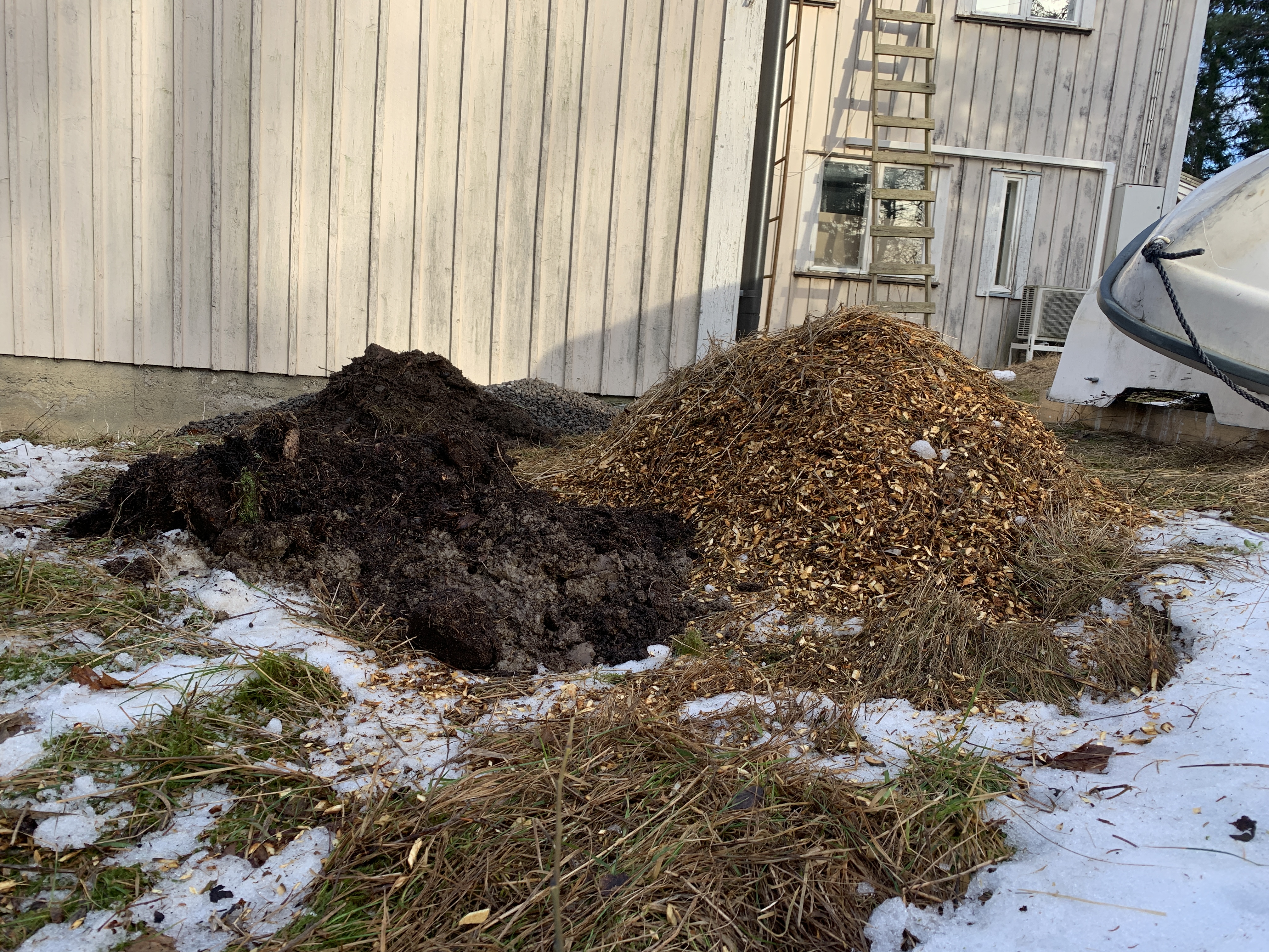 Täytin laatikot kasvuturve-pussimulta-lannoite seoksella. Yhden 80x120x20cm lavakauluksen tilavuus on noin 200 litraa. Minä laitoin 80l turvetta ja 100l multaa eli yhteensä 180 litraa yhteen kaulukseen joka täytti laatikon suht täyteen. Käyttäisin kompostia jos olisi sellaista, mutta ei olla vielä ehditty hankkimaan kompostoria puhumattakaan täyttämään sitä.