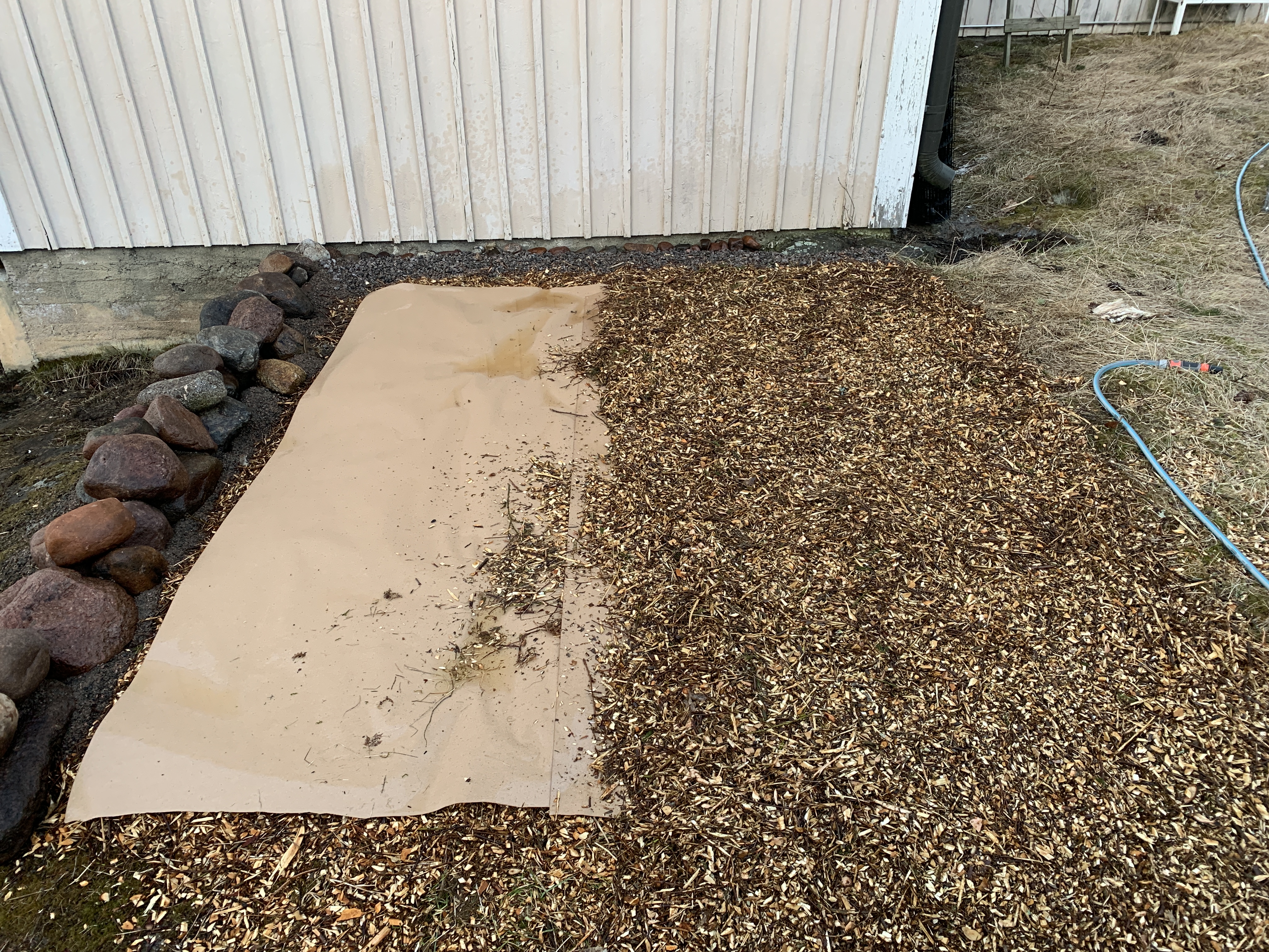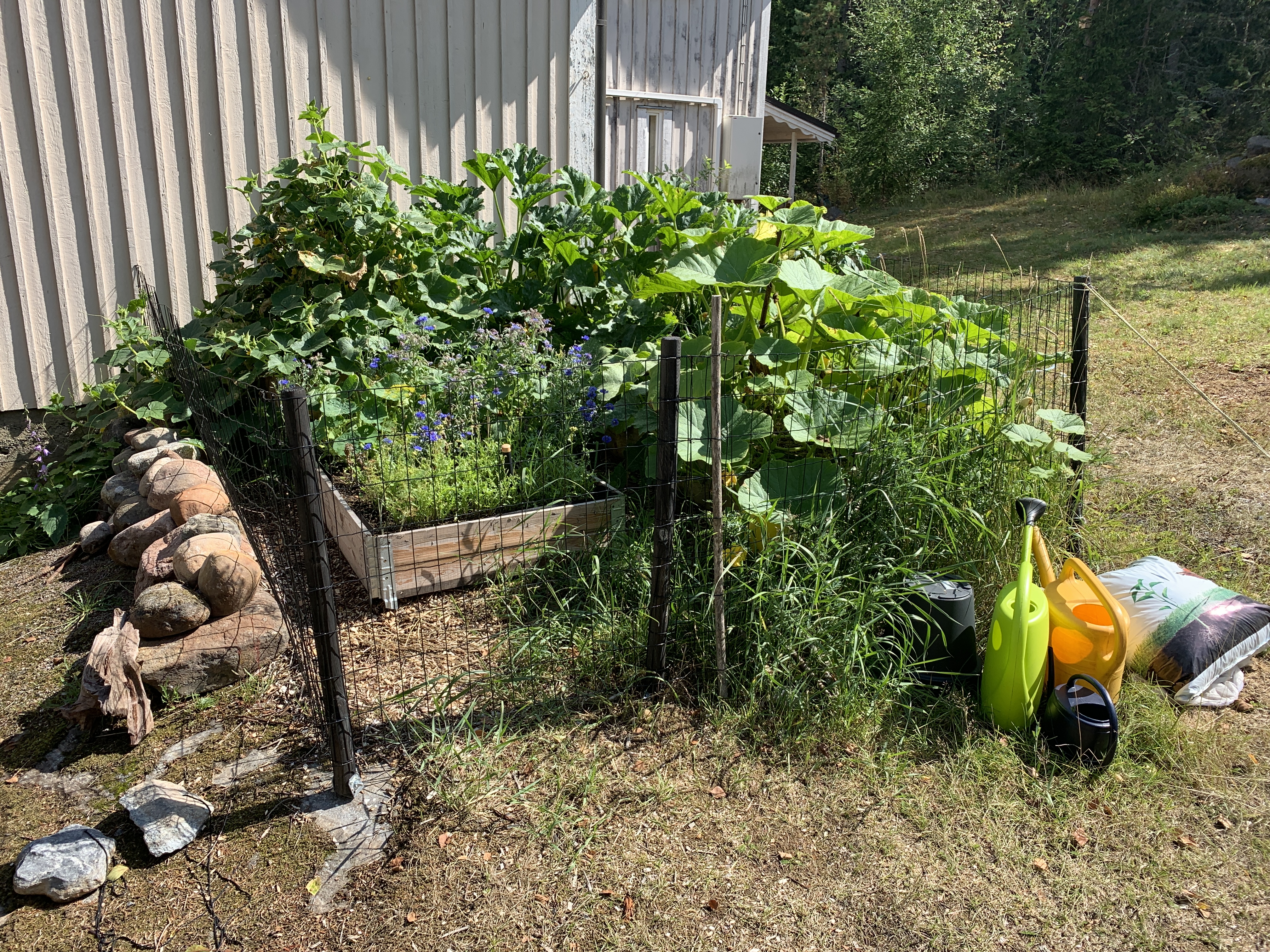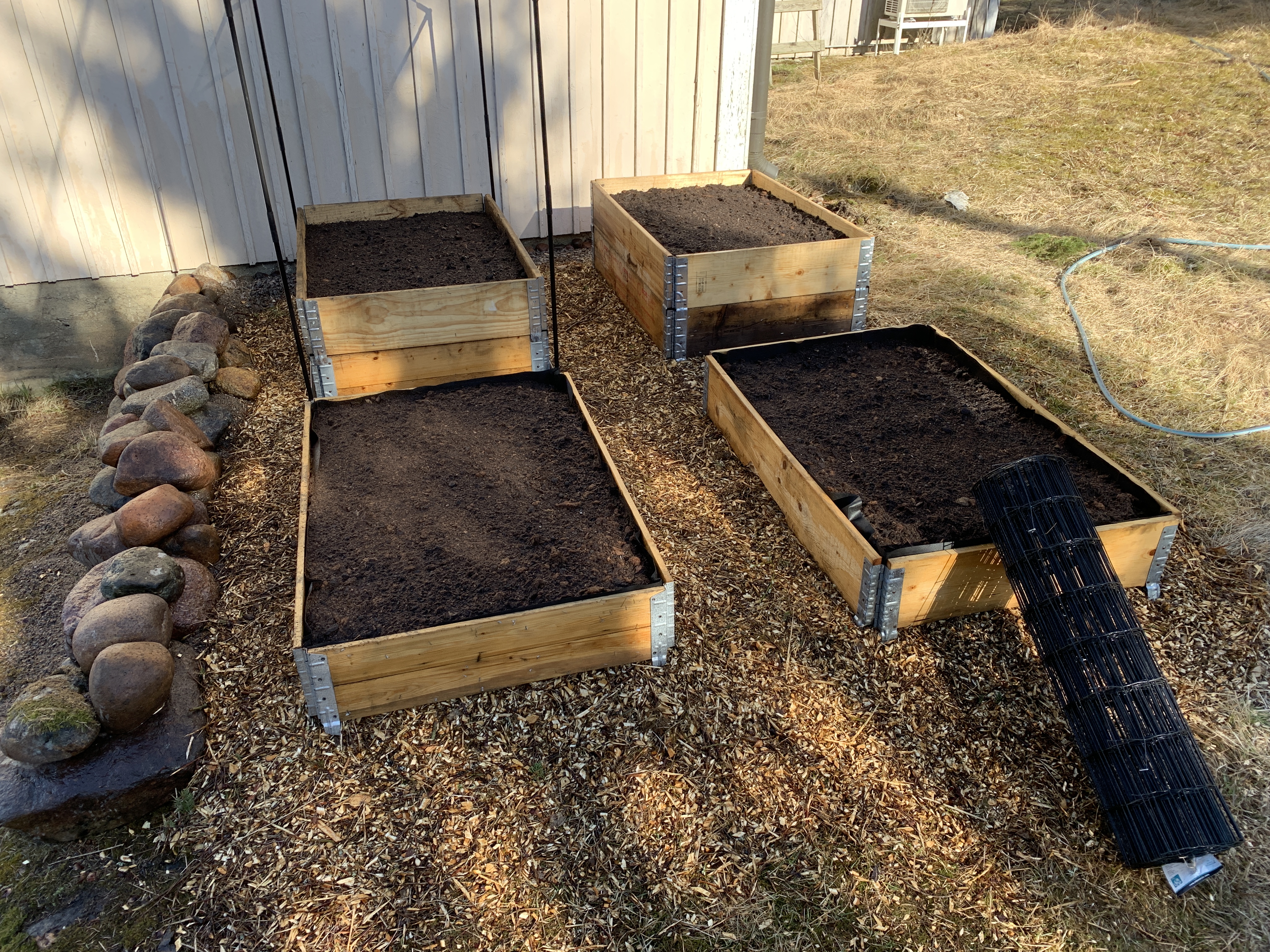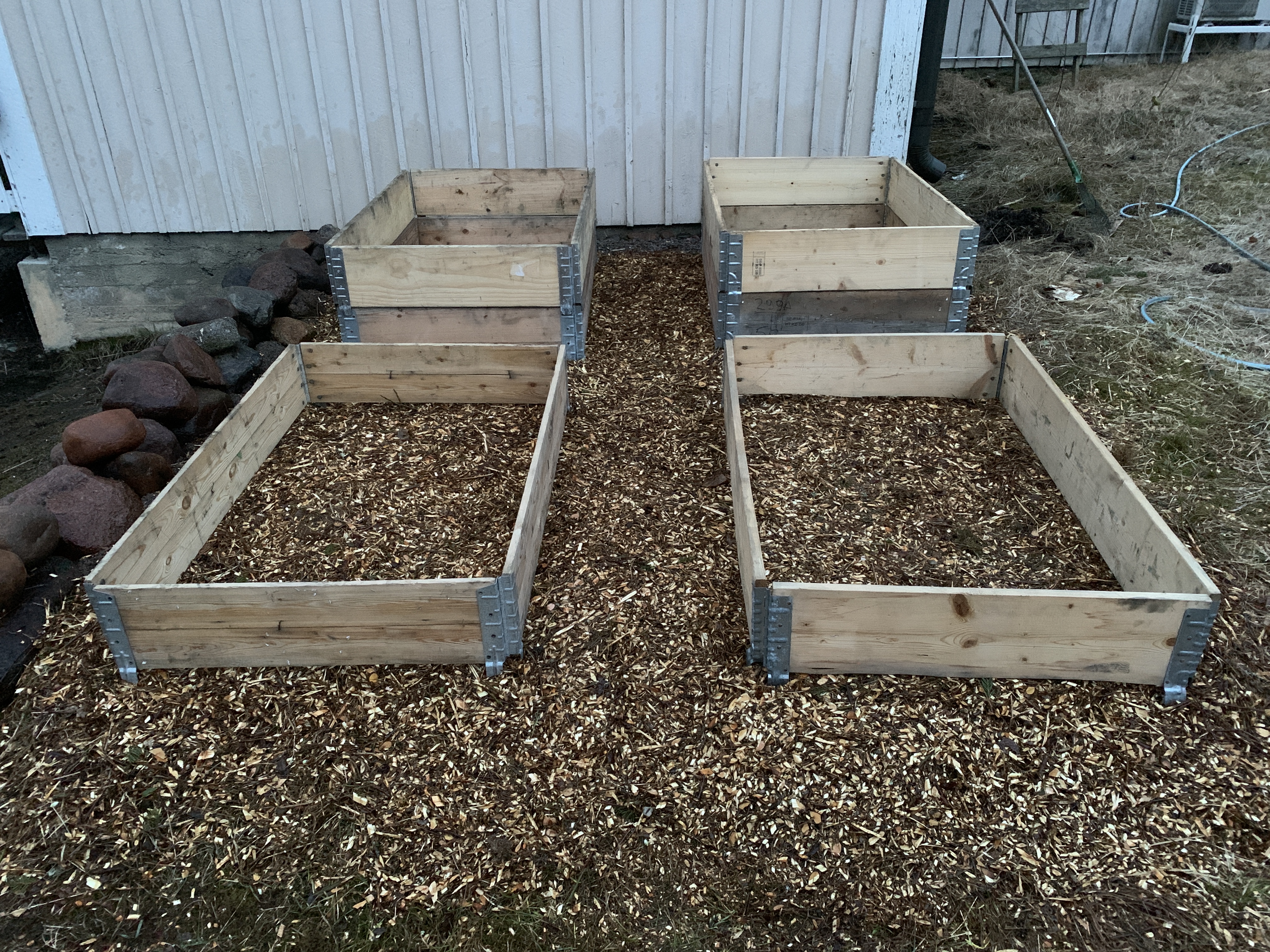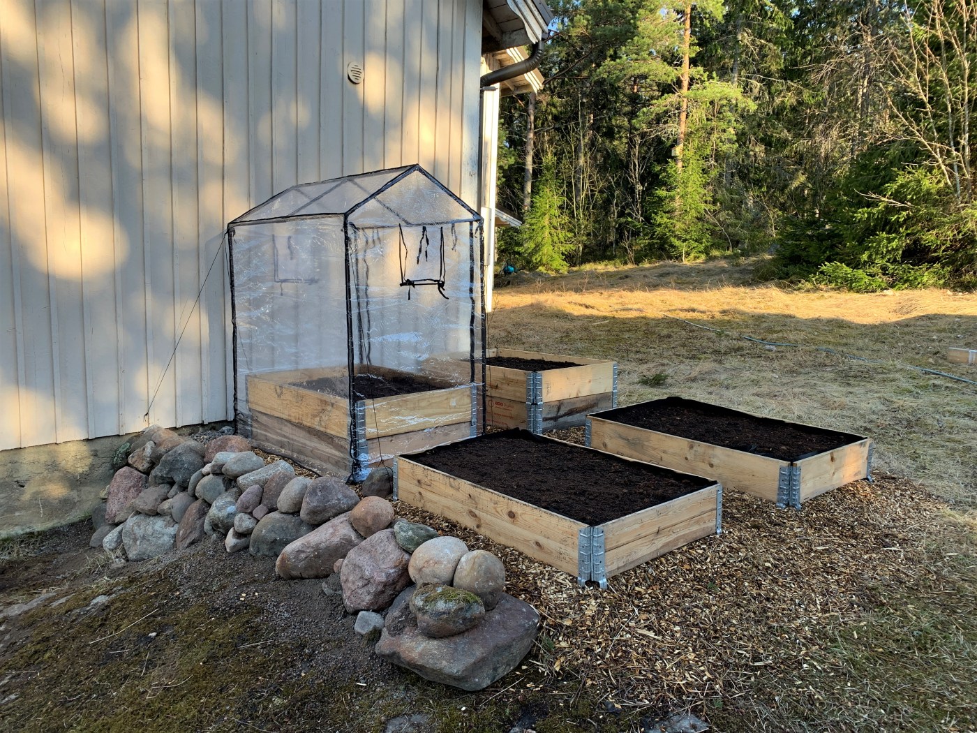 Valitsin mielestäni suht aurinkoisen paikan talon päädystä johon ei ole pitkä matka hoitamaan ja kerämään satoa. Paikka on mäessä ja oli epätasainen joten pengersimme sen isoilla luonnon kivillä ennen maan tasoitusta. Tasoitin maaston ylijäämämaalla, soralla, märällä suojakartongilla (jäi ylimääräistä rempasta) pitämään rikkaruohot kurissa ja oksasilppurilla tehdyllä oksahakkeella jota on tullut mielin määrin pihan karsimisesta.