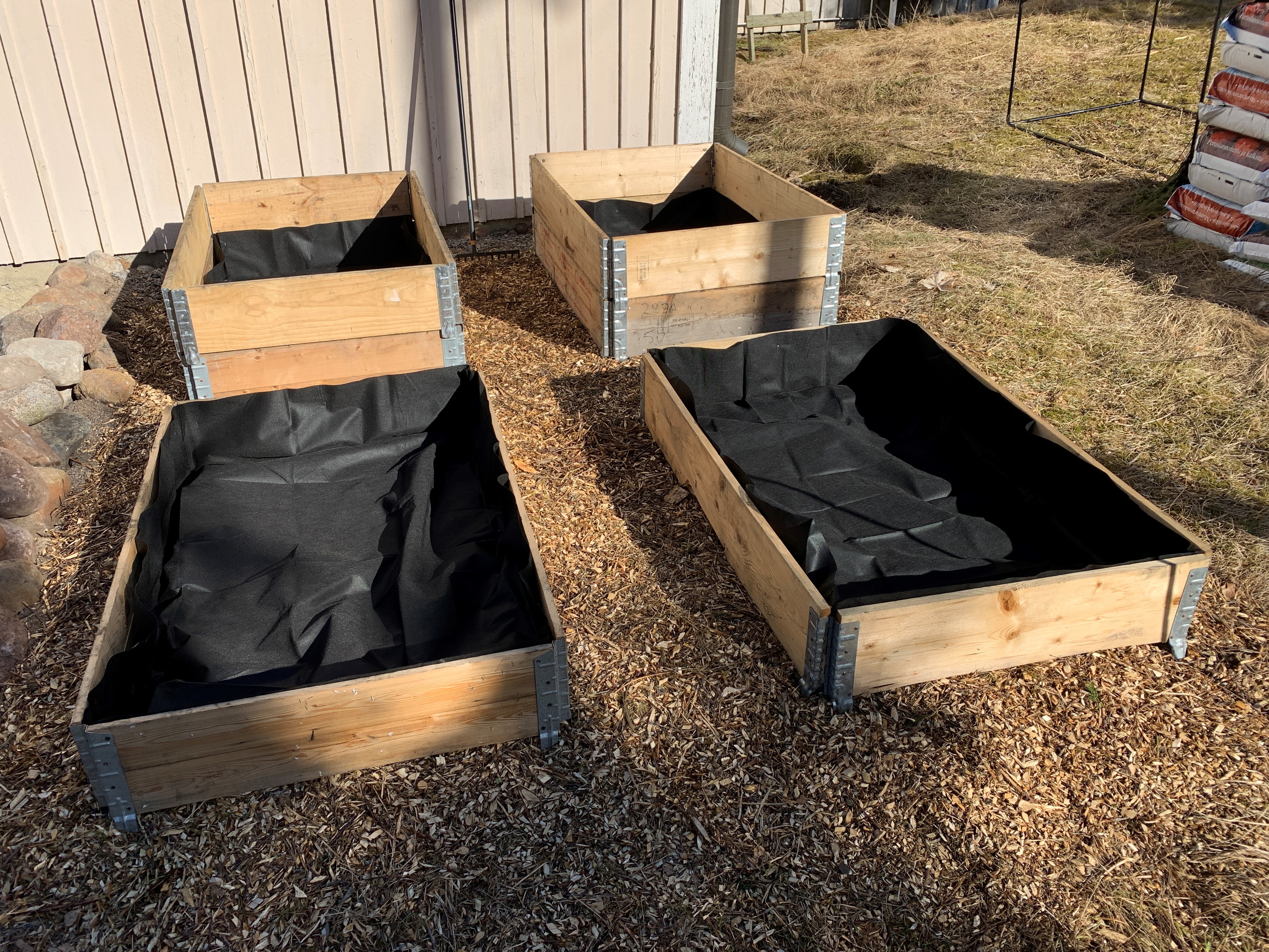 Katoin lavakaulukset katekankaalla estämään rikkaruohot ja pidentämään laatikoiden ikää. Tässä kohtaa hiukan törsäsin kun Bauhausissa valmiiksi muotoonommellut aluskankaat maksoivat vain 1,95 €/kpl, mutta tämän voi tehdä myös sanomalehdillä.