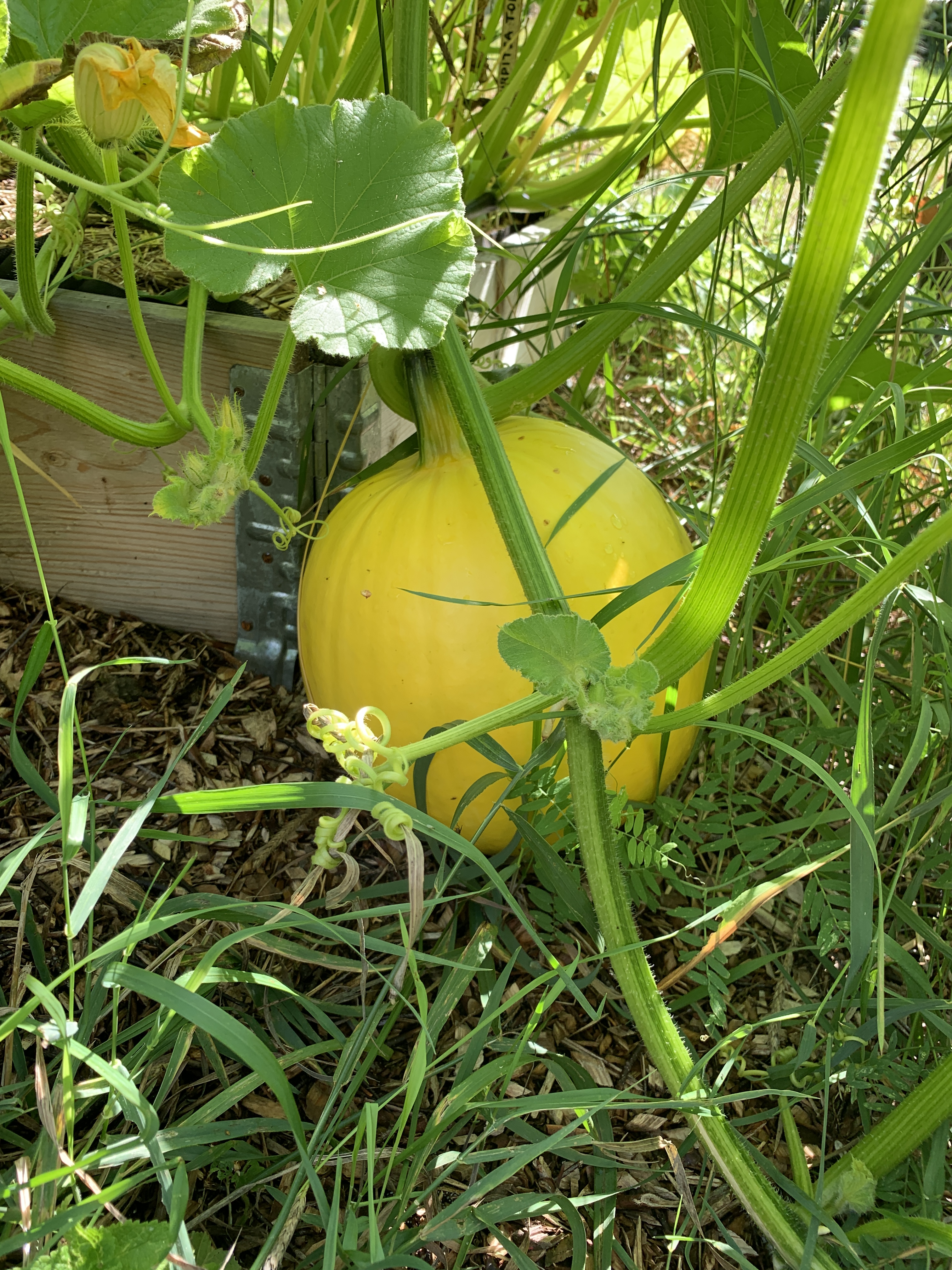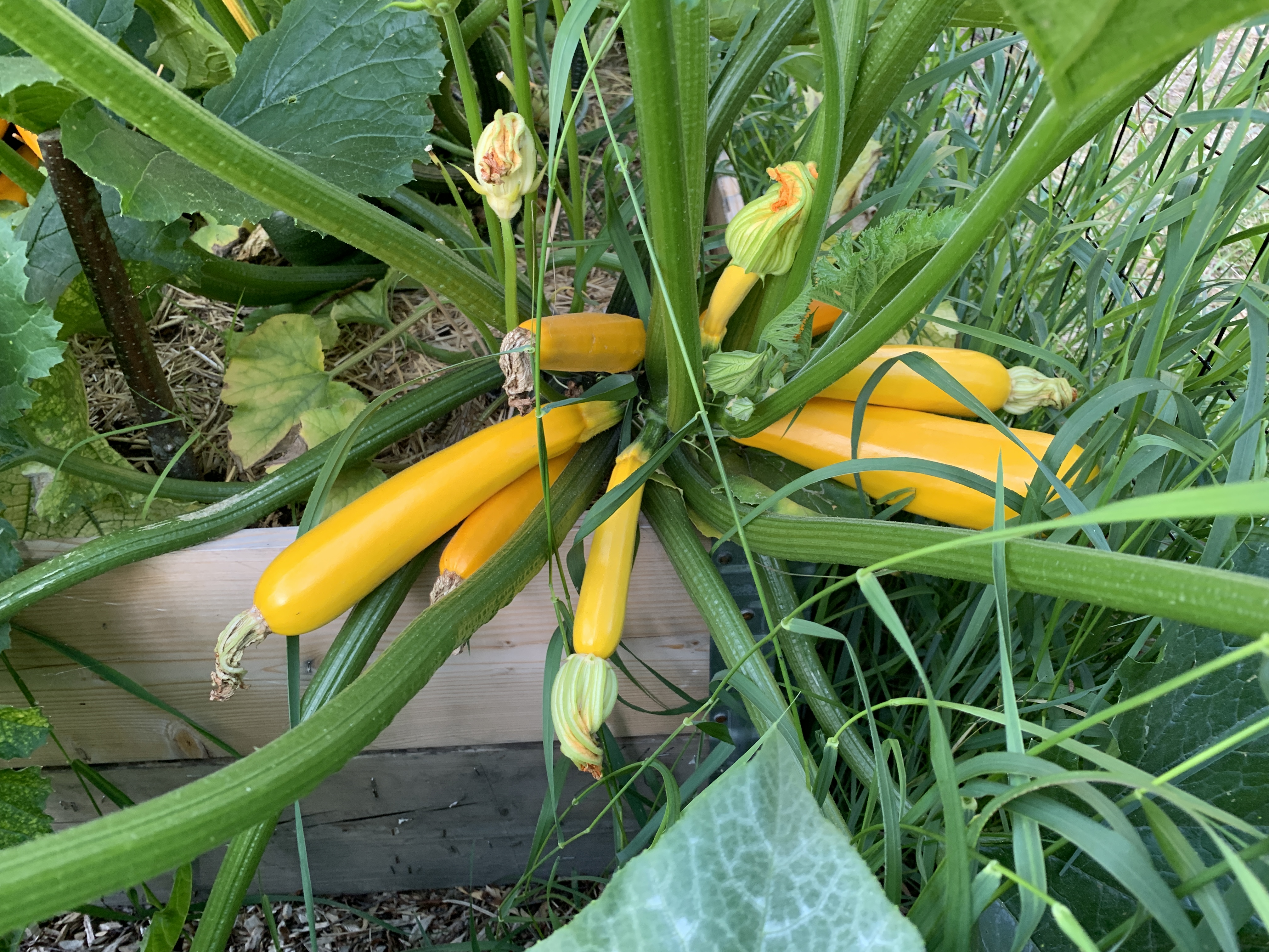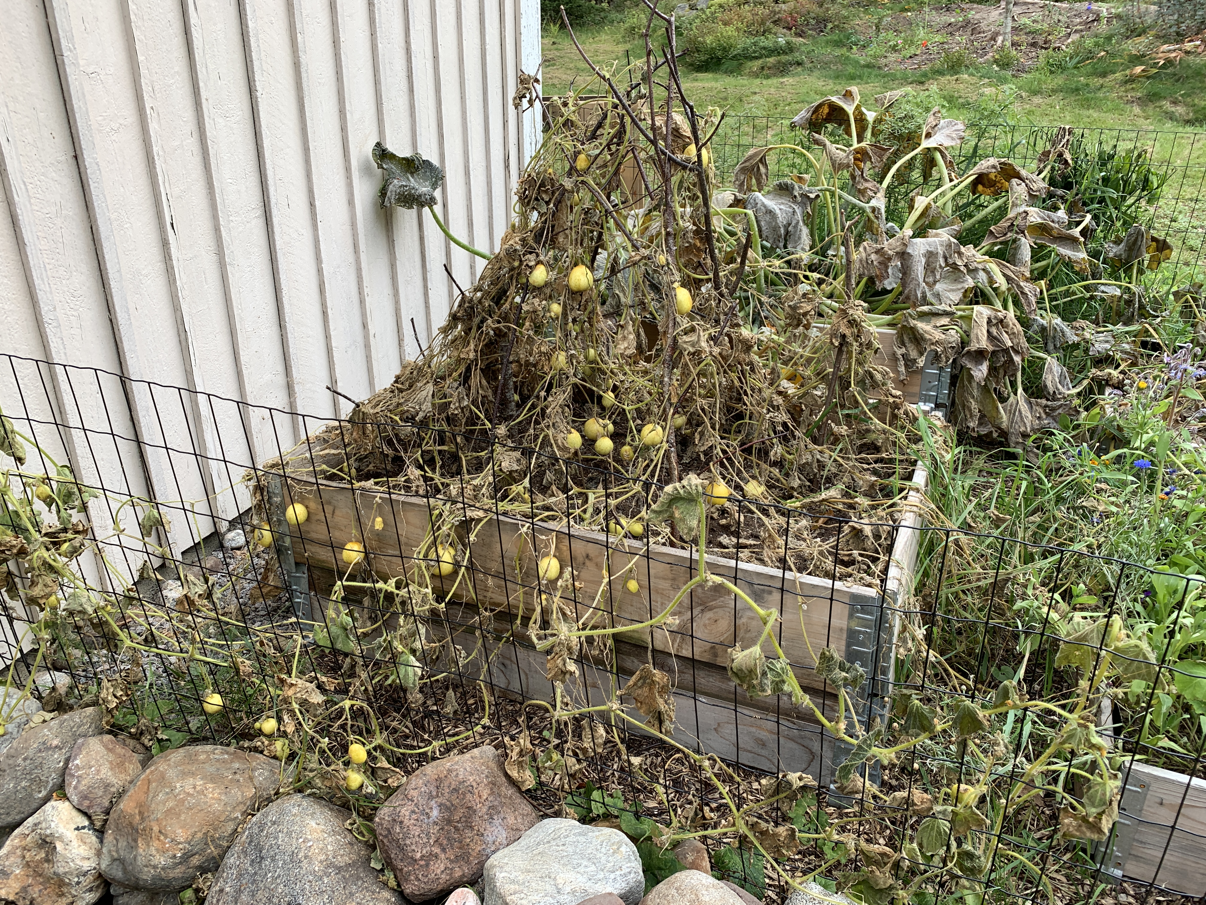 Ekan vuoden satoon mahtui rucola, tilli, erilaiset syötävät kukkaset, sitruunakurkku (Lemon), keltainen kesäkurpitsa (Soleil), pyöreä kesäkurpitsa (Eight ball), myskikurpitsa ja perinteinen kurpitsa (Tom Fox). Viidakkokurkun taimista en saanut kuin yhden kasvamaan ja sekin kasvoi liian hitaasti, kun sitruunakurkku valtasi jo laatikon. Vesimelonin taimet kuolivat, mutta ei se paljoon haittaa, kun tila loppui jo nyt kesken. Ensi vuonna en laita kurpitsoja lavakauluksiin, koska veivät liian ison tilan meidän ahtaasti asetelluista laatikoista. Oli hankalaa kerätä satoa tuosta viidakosta, mutta hieno sato tuli!