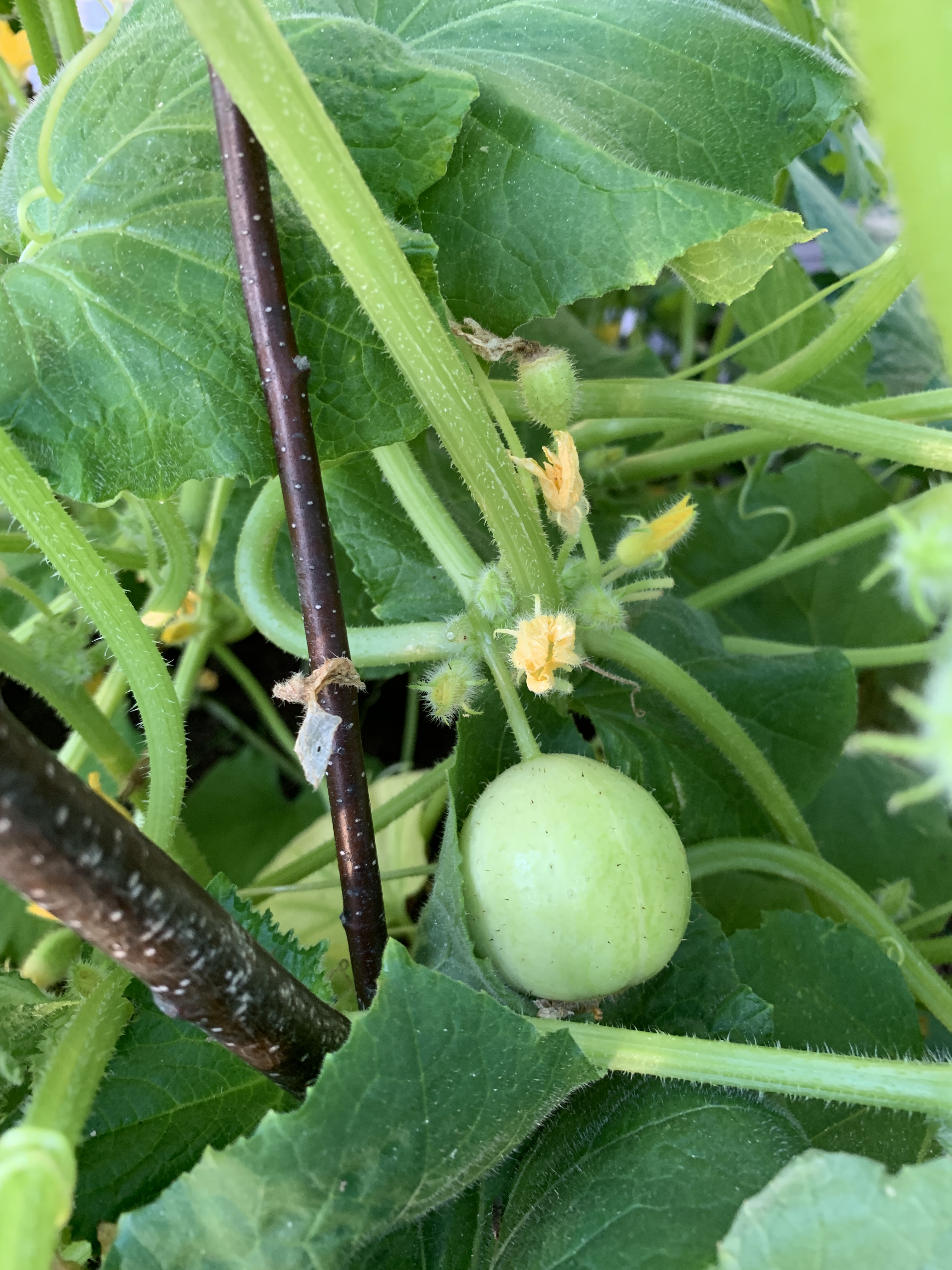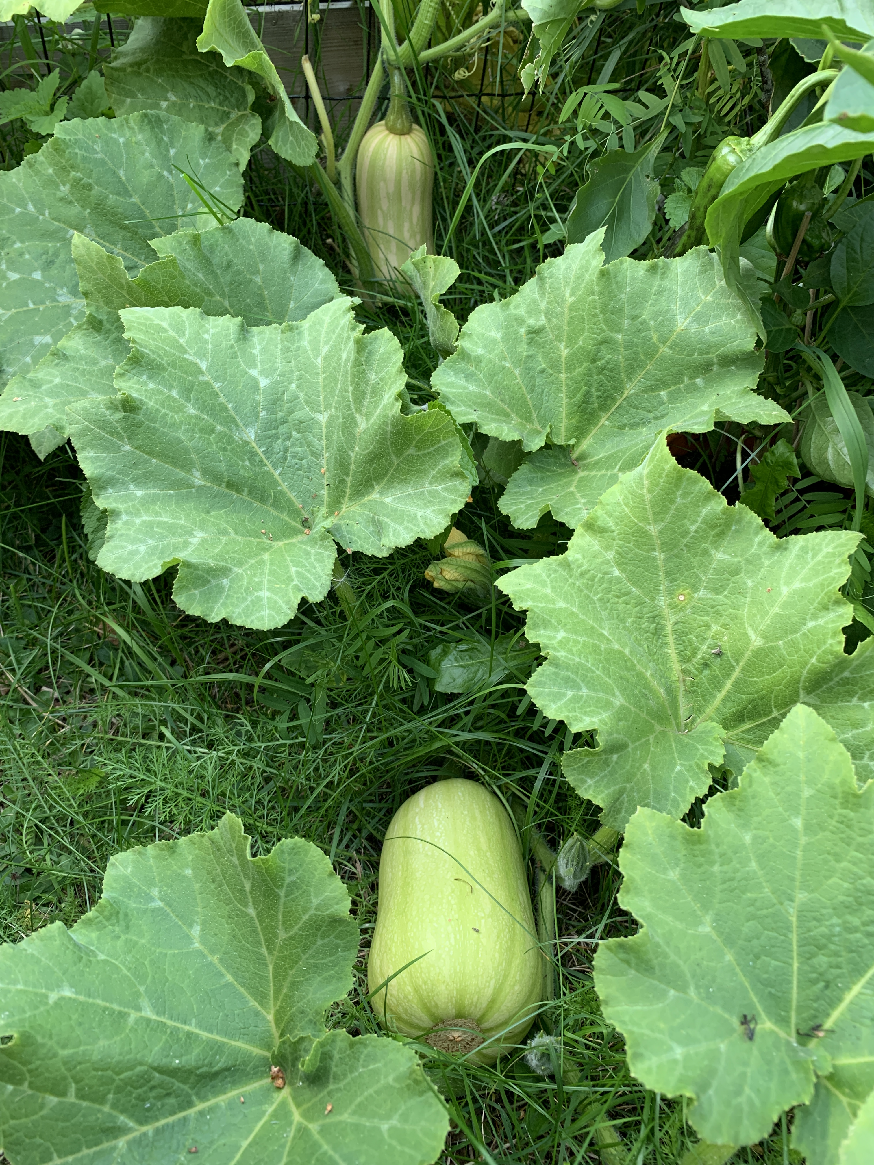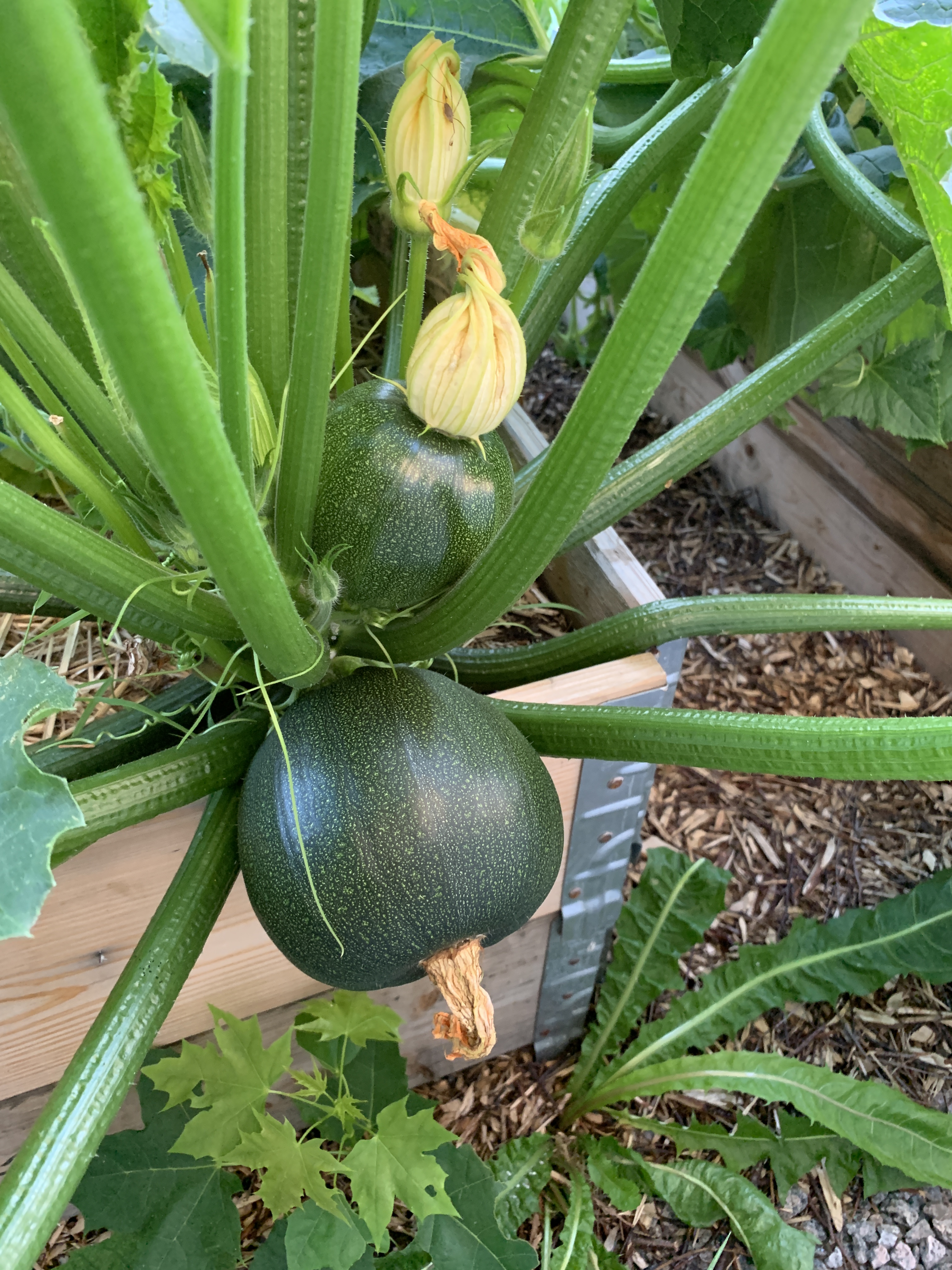 Ekan vuoden satoon mahtui rucola, tilli, erilaiset syötävät kukkaset, sitruunakurkku (Lemon), keltainen kesäkurpitsa (Soleil), pyöreä kesäkurpitsa (Eight ball), myskikurpitsa ja perinteinen kurpitsa (Tom Fox). Viidakkokurkun taimista en saanut kuin yhden kasvamaan ja sekin kasvoi liian hitaasti, kun sitruunakurkku valtasi jo laatikon. Vesimelonin taimet kuolivat, mutta ei se paljoon haittaa, kun tila loppui jo nyt kesken. Ensi vuonna en laita kurpitsoja lavakauluksiin, koska veivät liian ison tilan meidän ahtaasti asetelluista laatikoista. Oli hankalaa kerätä satoa tuosta viidakosta, mutta hieno sato tuli!