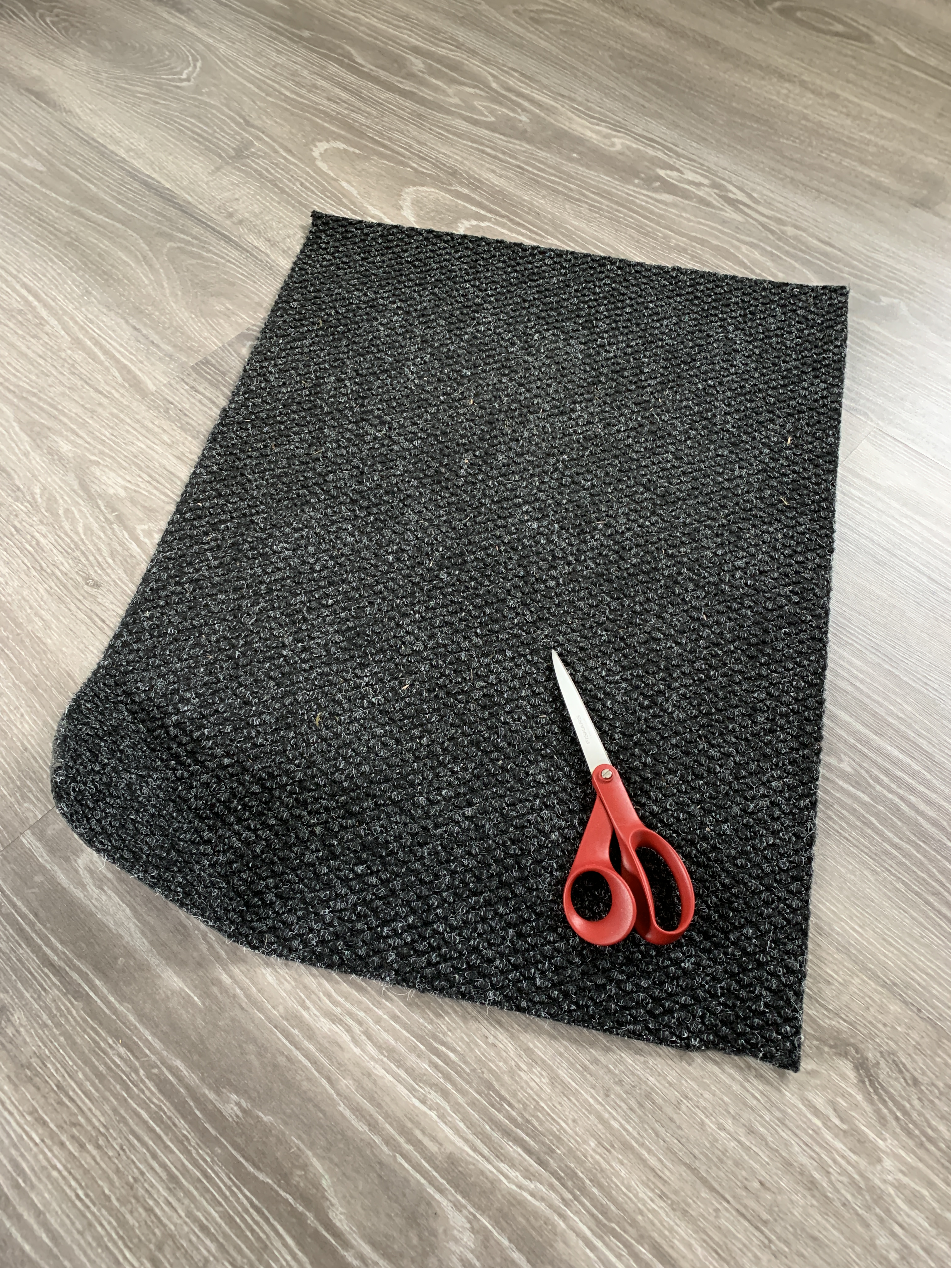 Leikkasin metritavara kuramatosta sopivan kokoisen palan ja kulmat pois, toiset kulmat pyöristin. Asetin sen laatikon alle ja eteen. Kuramatosta voi leikata juuri sen muotoisen kun haluaa ja toimii ihan ok.