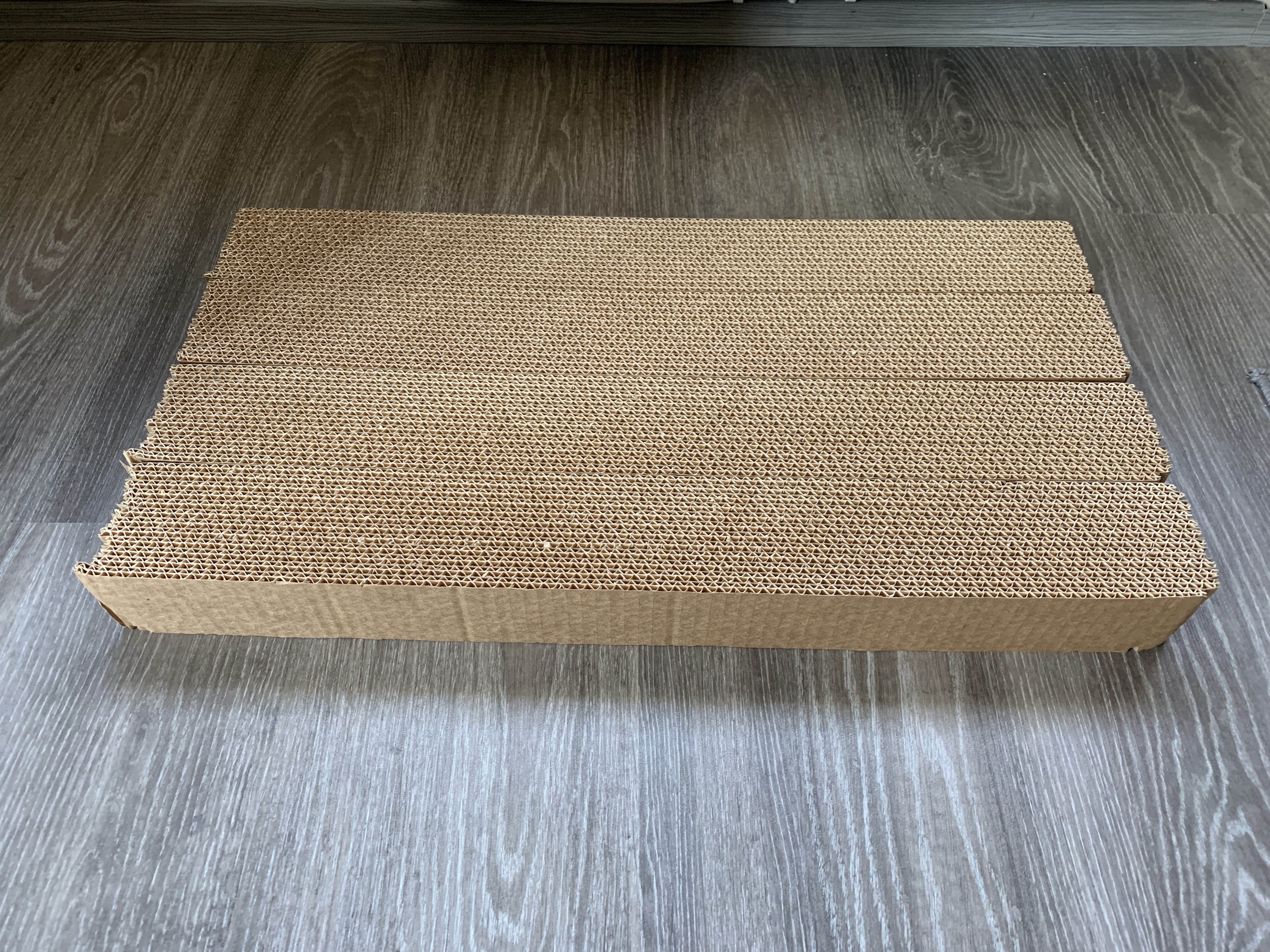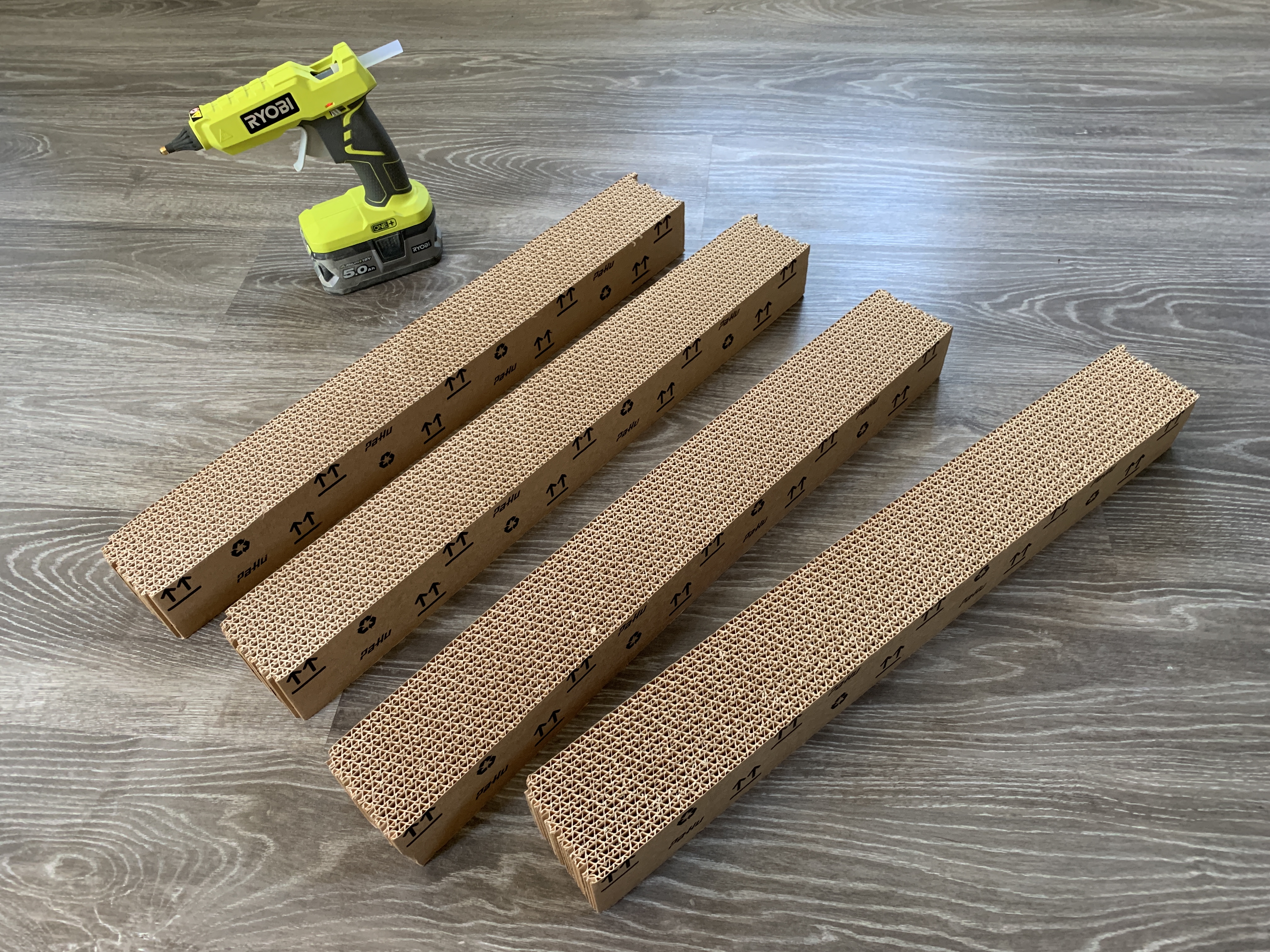 Näin muutamassa lemmikkieläinkaupassa myynnissä aaltopahvisia raapimisalustoja. Näytin isännälle että pitäisköhän ostaa tällanen ja isäntä sanoi että tollasta pahvia löytyy ennestä takaa, mutta kapeampina levyinä. Noh ei muuta kuin kuumaliimapyssy esille ja liimailemaan.