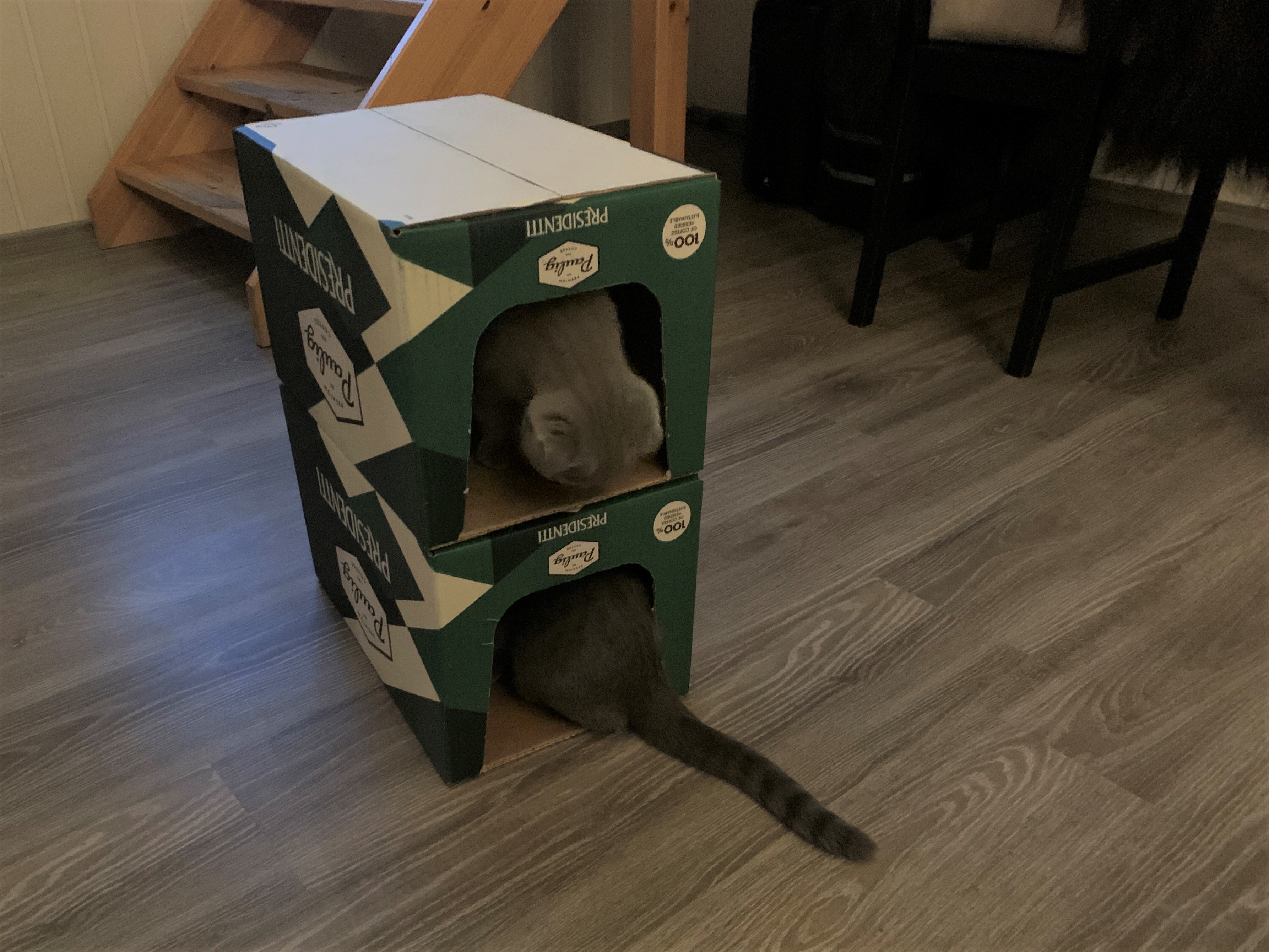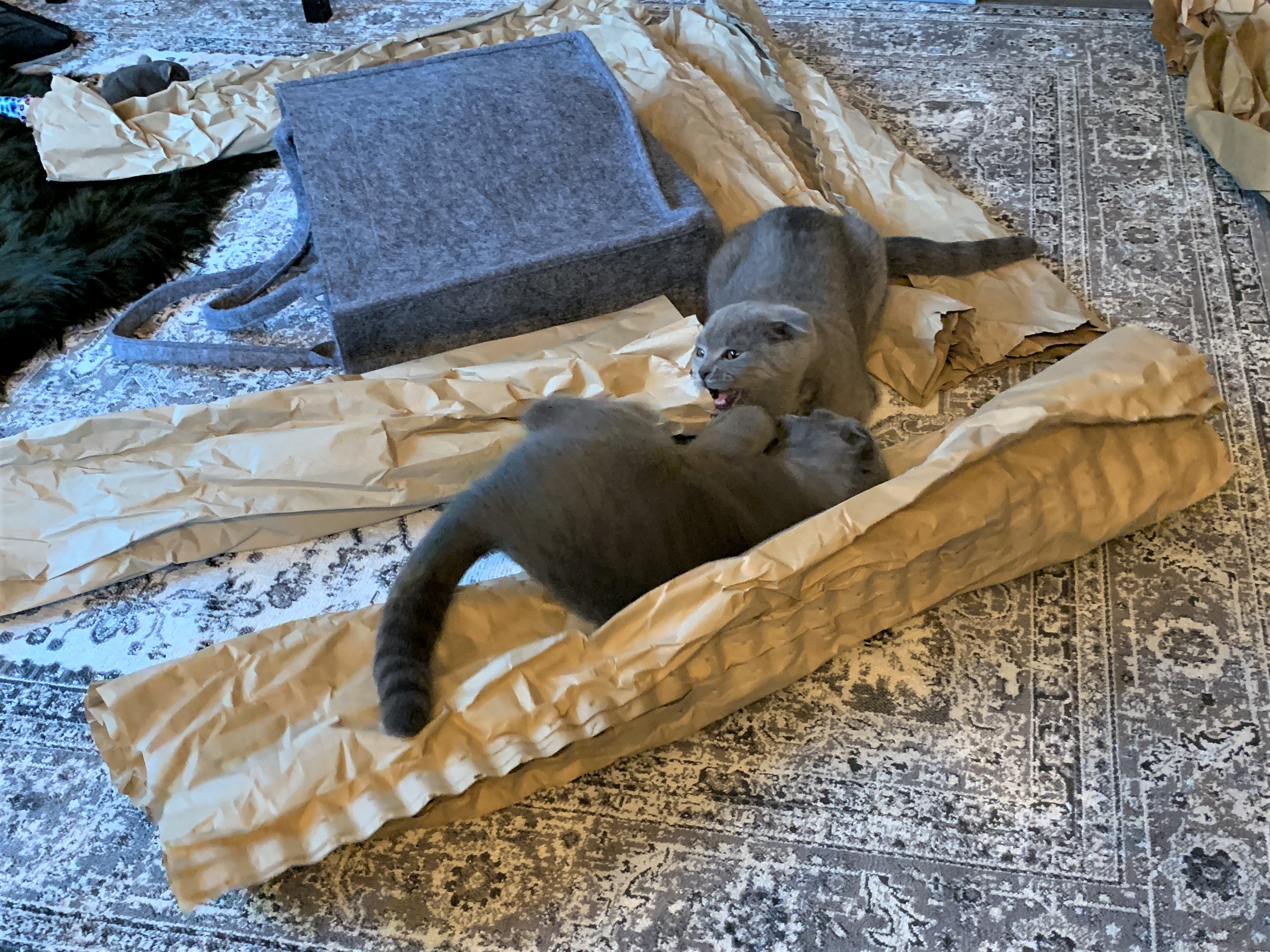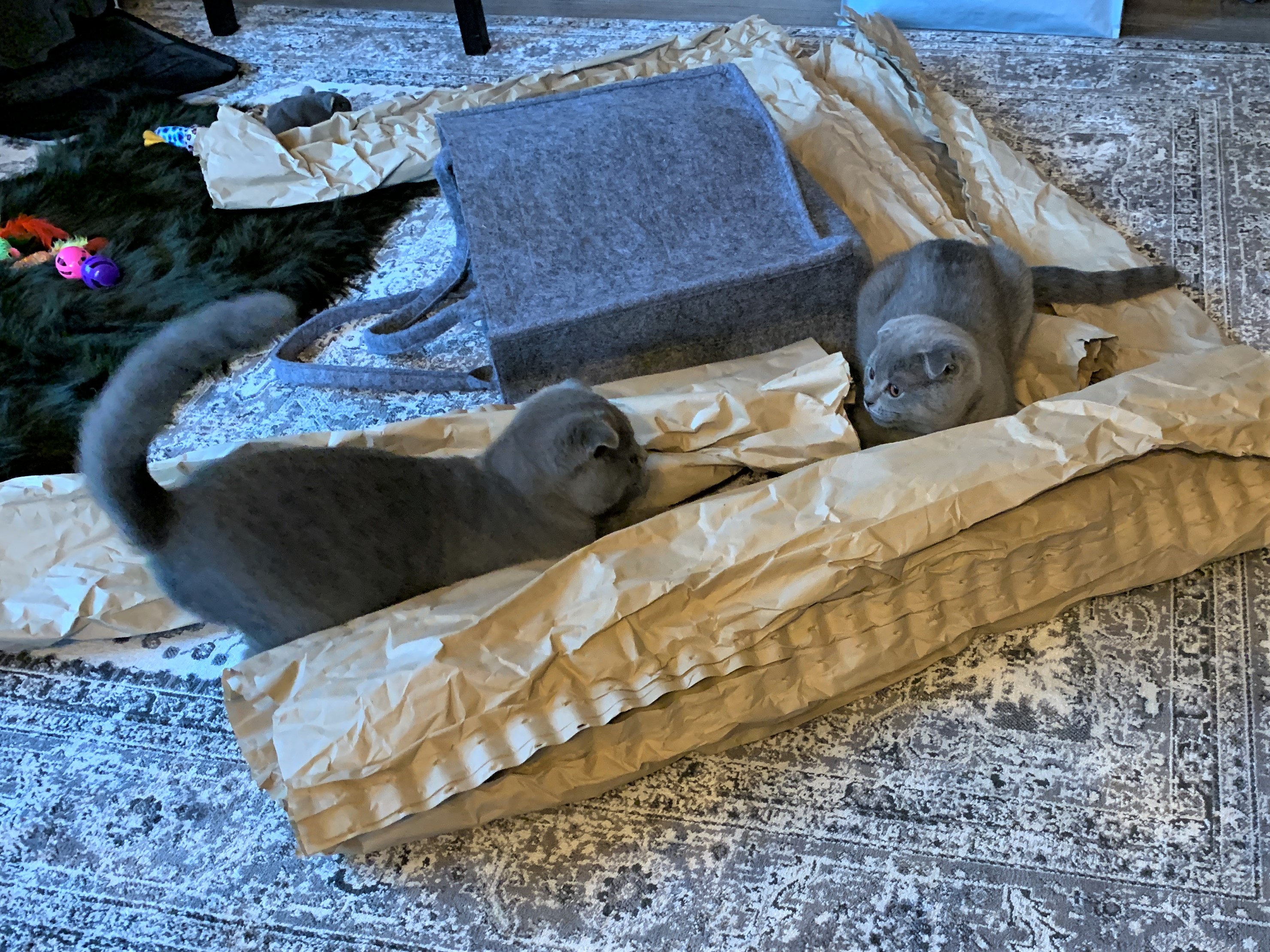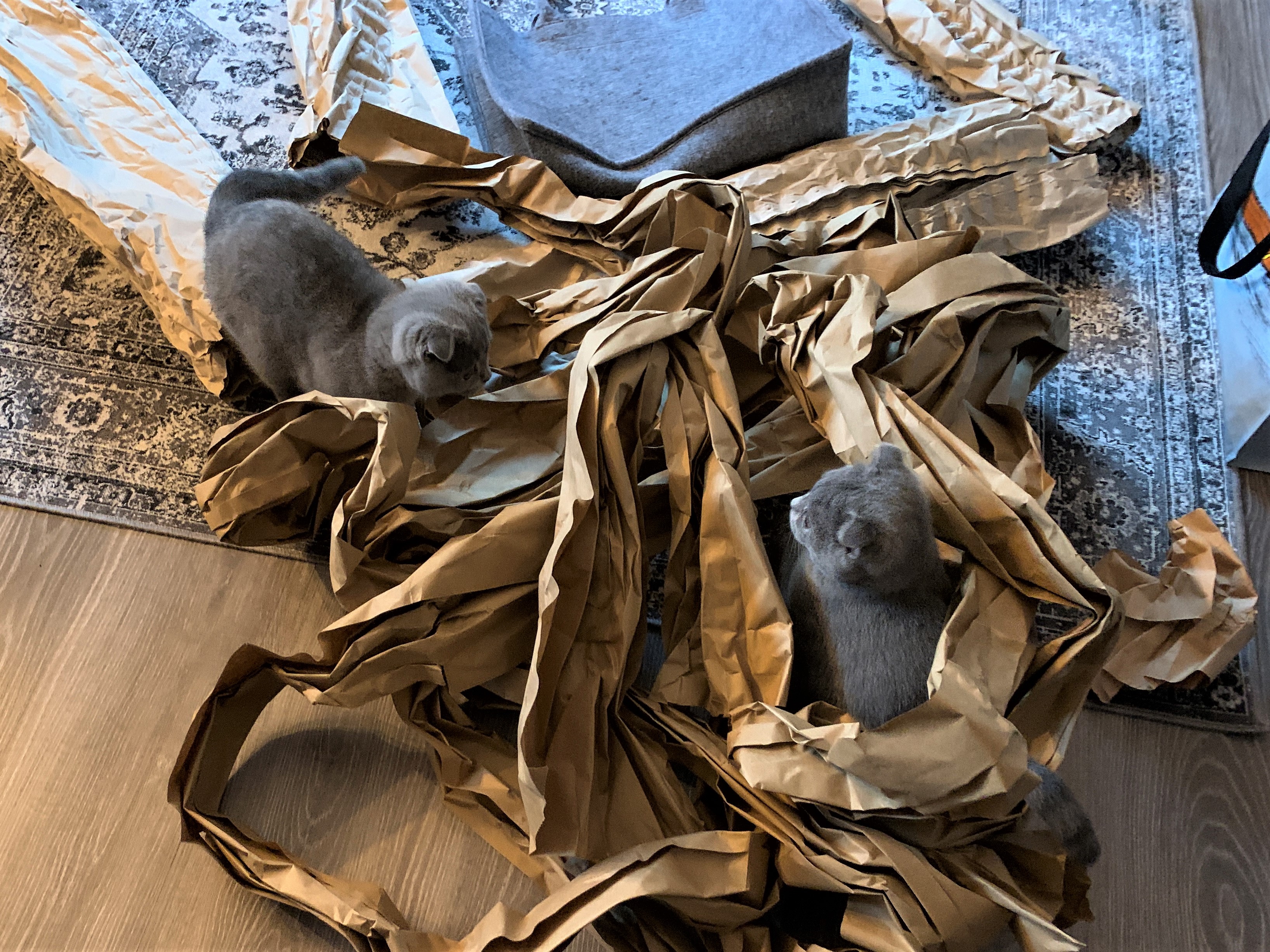 Kissat tunnetusti rakastavat pahvilaatikoita, aaltopahvia ja monia muita pakkausmateriaaleja. Ne pitävät kivaa rapinaa ja antavat lämmintä turvaa karvakorville. Pitää paikkansa ainakin meidän pikku pahvipäiden kohdalla.
