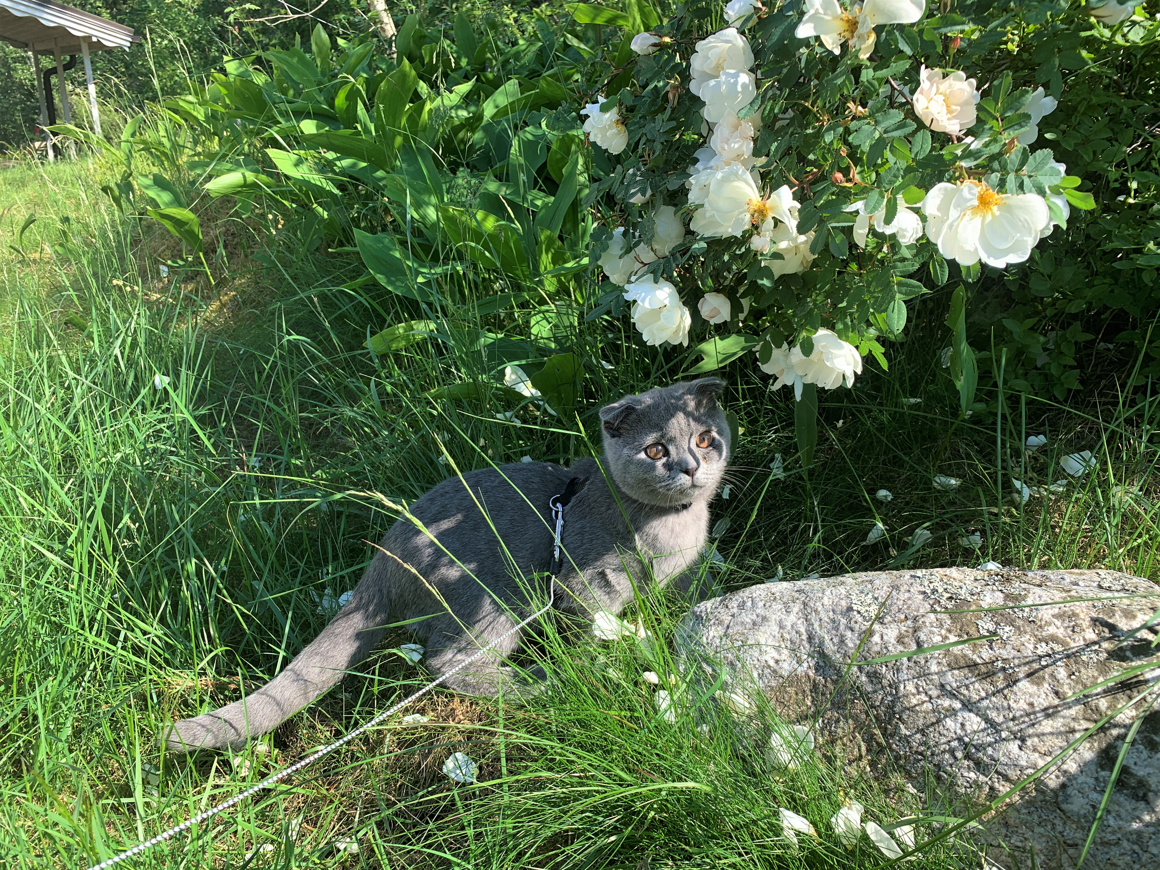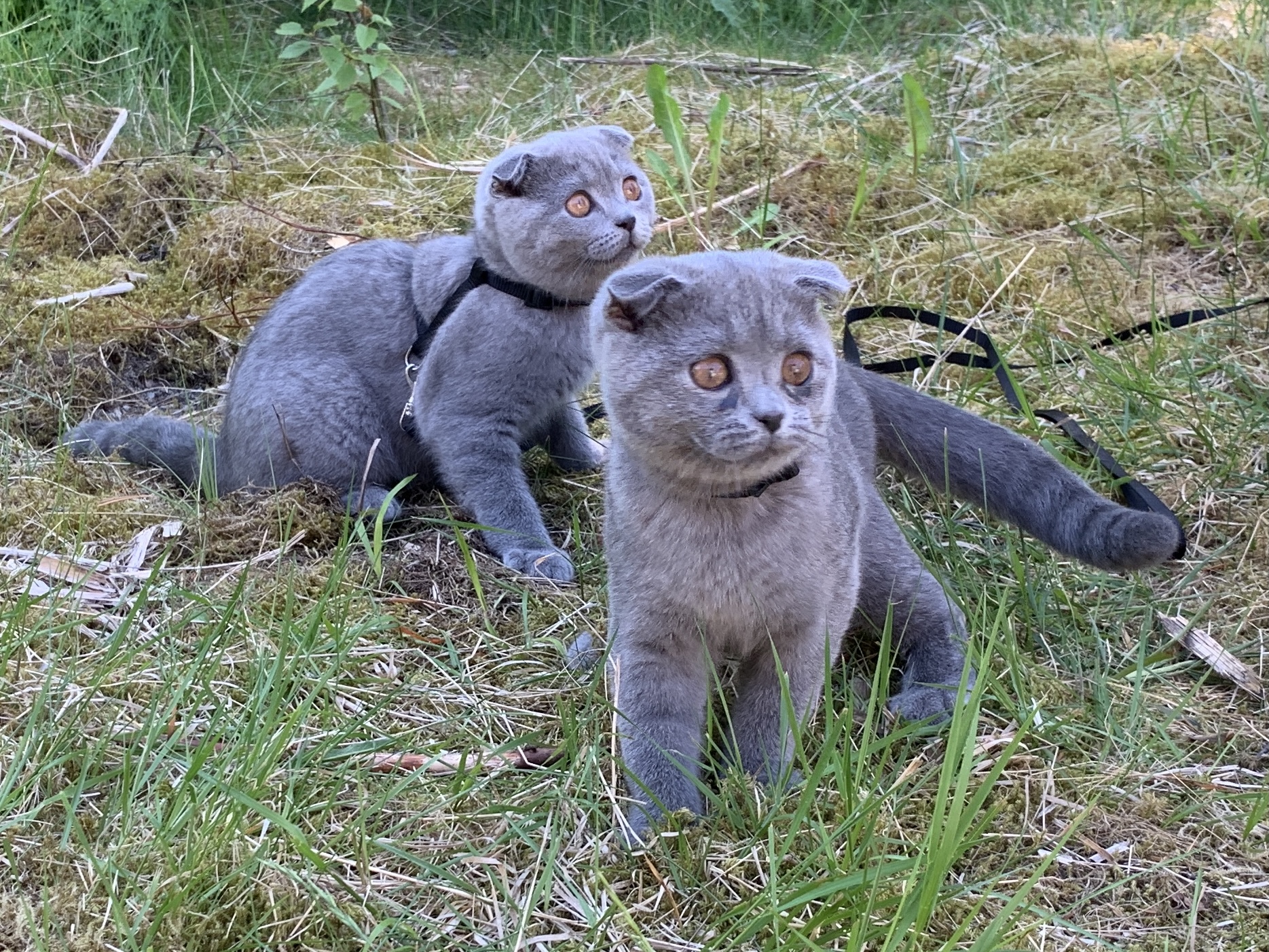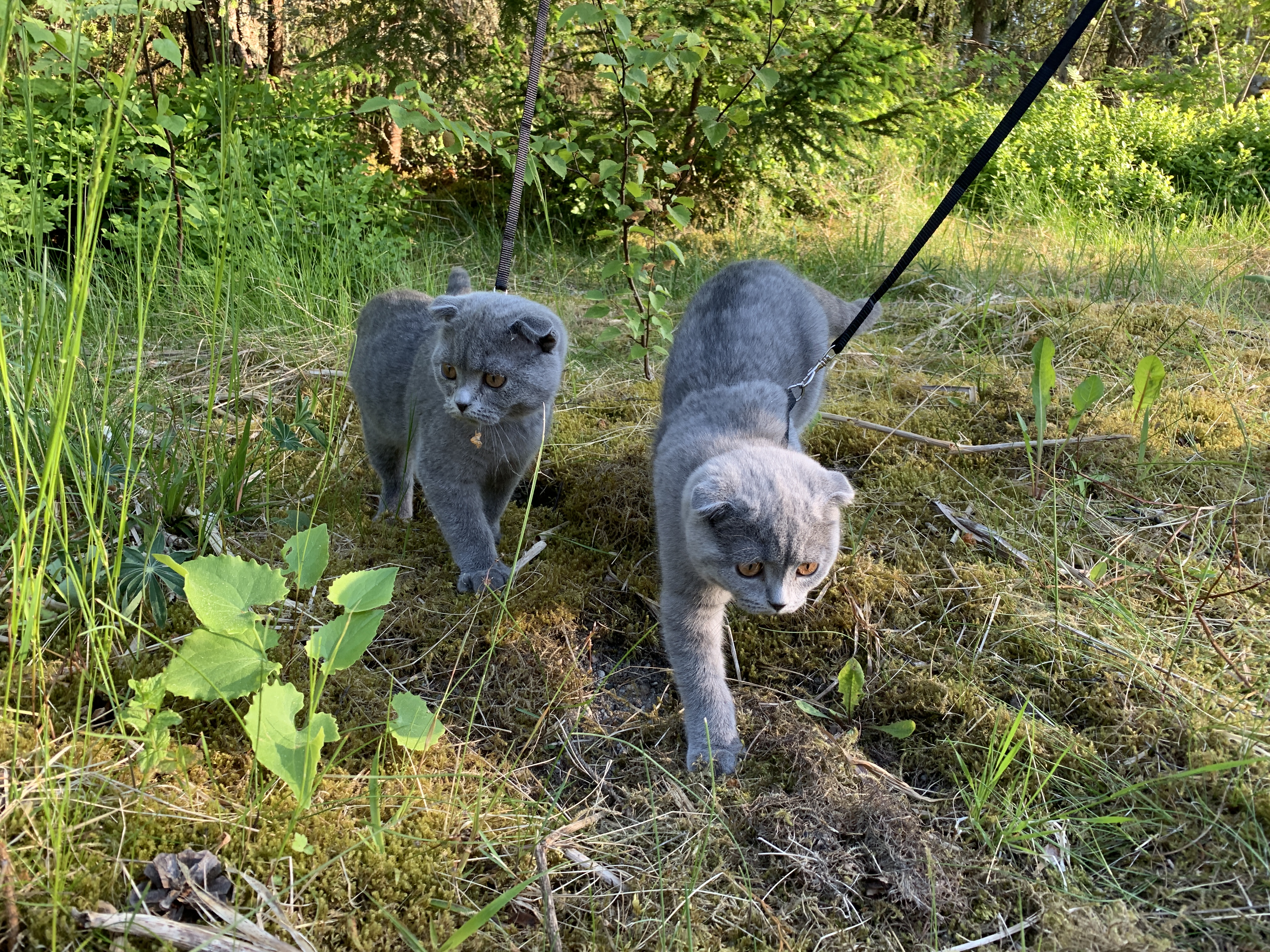 Valjaisiin totuttiin nopeasti ja hienosti. Pari kertaa kaatuiltiin ja hiukan aikaa käveltiin hassusti, mutta kun päästiin ulos jännitys taisi viedä voiton ja valjaat unohdettiin. Ulkona arasteltiin ekalla kertaa jonkin verran, mutta yllättävän uteliaasti silti nuuhkittiin nurkat. Toisella kertaa sitä pissittiin jo hiekkakasaan ja pyydysteltiin öttiäisiä. Kolmannella kertaa sitä leikittiin ja hypittiin ympäriinsä, mutta onneksi ei vielä liian rohkeasti. Neljännellä kertaa he olivat hetken ilman hihnaa, jotta saivat kirmata vapaammin. Hienosti pysyivät lähellä varsinkin kun emännällä oli namipussi taskussa ja isäntä oli leikkituulella. Sittemmin ostettiin flexit jotta kirmailu onnistuu hiukan paremmin liekassakin. Toki isompana he saavat mennä pihalle itsekseen jos näemmä sen parhaaksi.