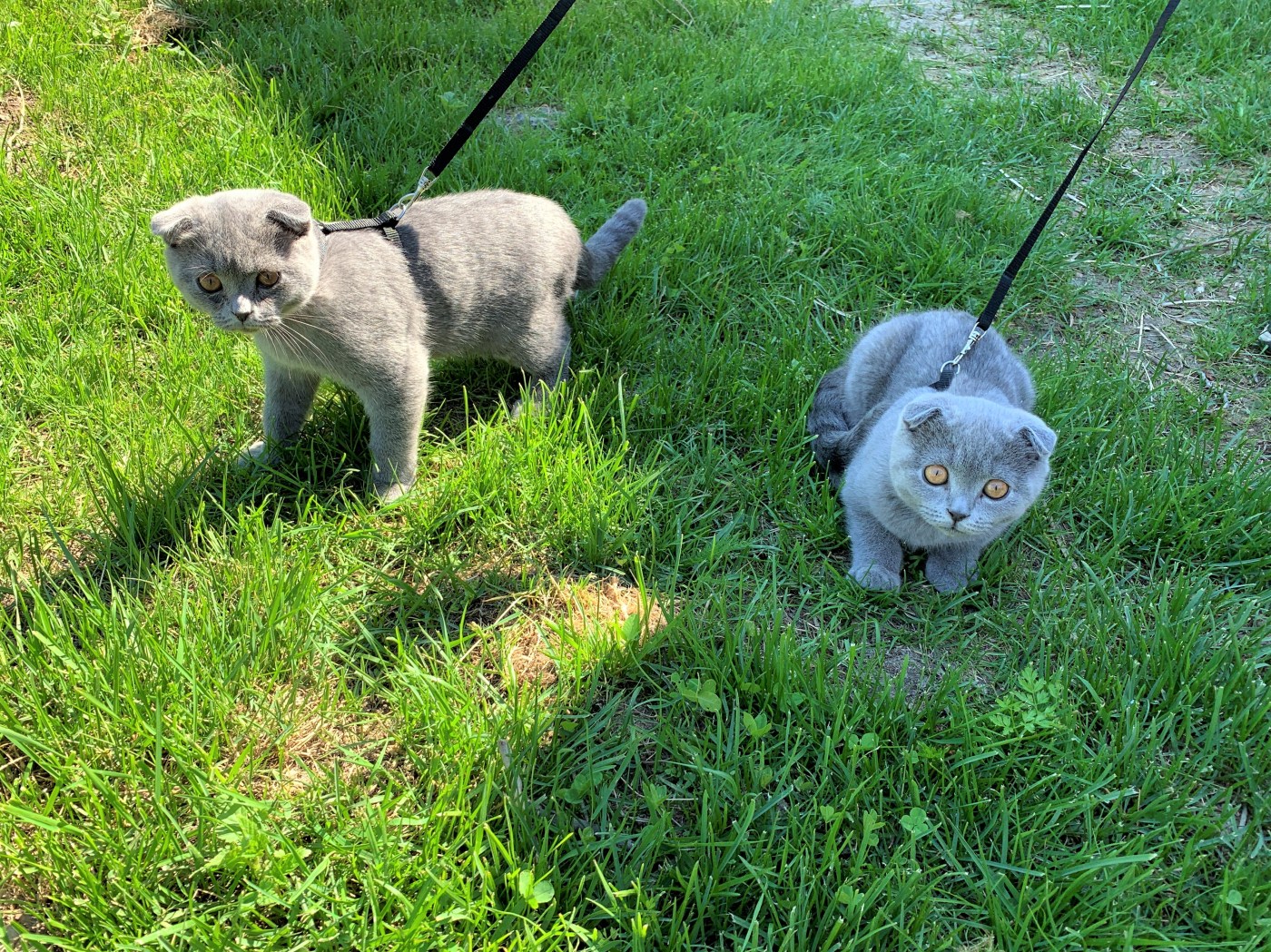 Valjaisiin totuttiin nopeasti ja hienosti. Pari kertaa kaatuiltiin ja hiukan aikaa käveltiin hassusti, mutta kun päästiin ulos jännitys taisi viedä voiton ja valjaat unohdettiin. Ulkona arasteltiin ekalla kertaa jonkin verran, mutta yllättävän uteliaasti silti nuuhkittiin nurkat. Toisella kertaa sitä pissittiin jo hiekkakasaan ja pyydysteltiin öttiäisiä. Kolmannella kertaa sitä leikittiin ja hypittiin ympäriinsä, mutta onneksi ei vielä liian rohkeasti. Neljännellä kertaa he olivat hetken ilman hihnaa, jotta saivat kirmata vapaammin. Hienosti pysyivät lähellä varsinkin kun emännällä oli namipussi taskussa ja isäntä oli leikkituulella. Sittemmin ostettiin flexit jotta kirmailu onnistuu hiukan paremmin liekassakin. Toki isompana he saavat mennä pihalle itsekseen jos näemmä sen parhaaksi.