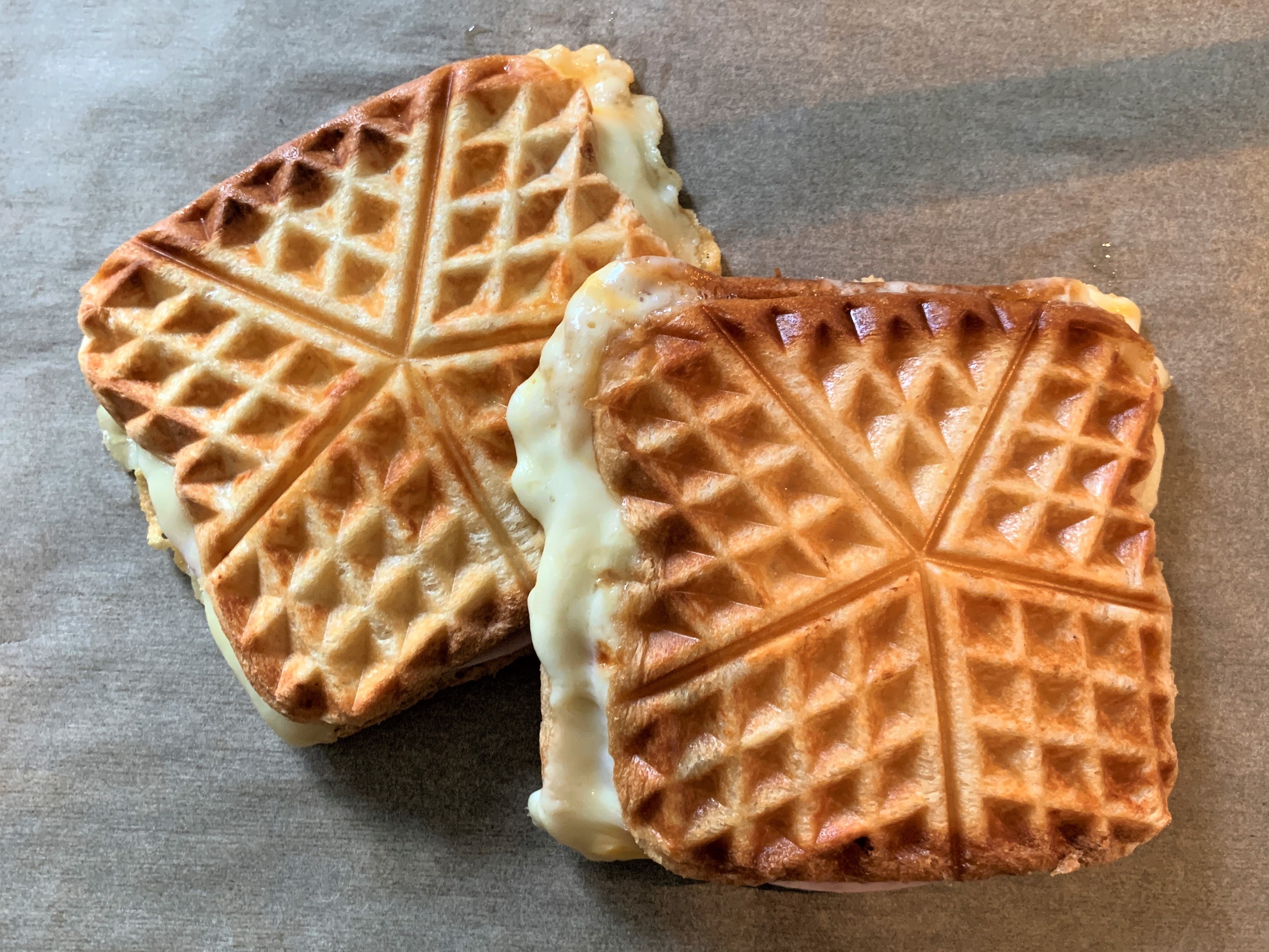 Tässä tuhti iltapala juuston ystävälle. Meiltä löytyy voileipägrillikin, mutta se leikkaa paahtoleivän kahtia kolmioiksi. Joten päädyin tällä kertaa käyttämään vohvelirautaa jottei juustoa valu turhaan. Kuviokin on kiva.