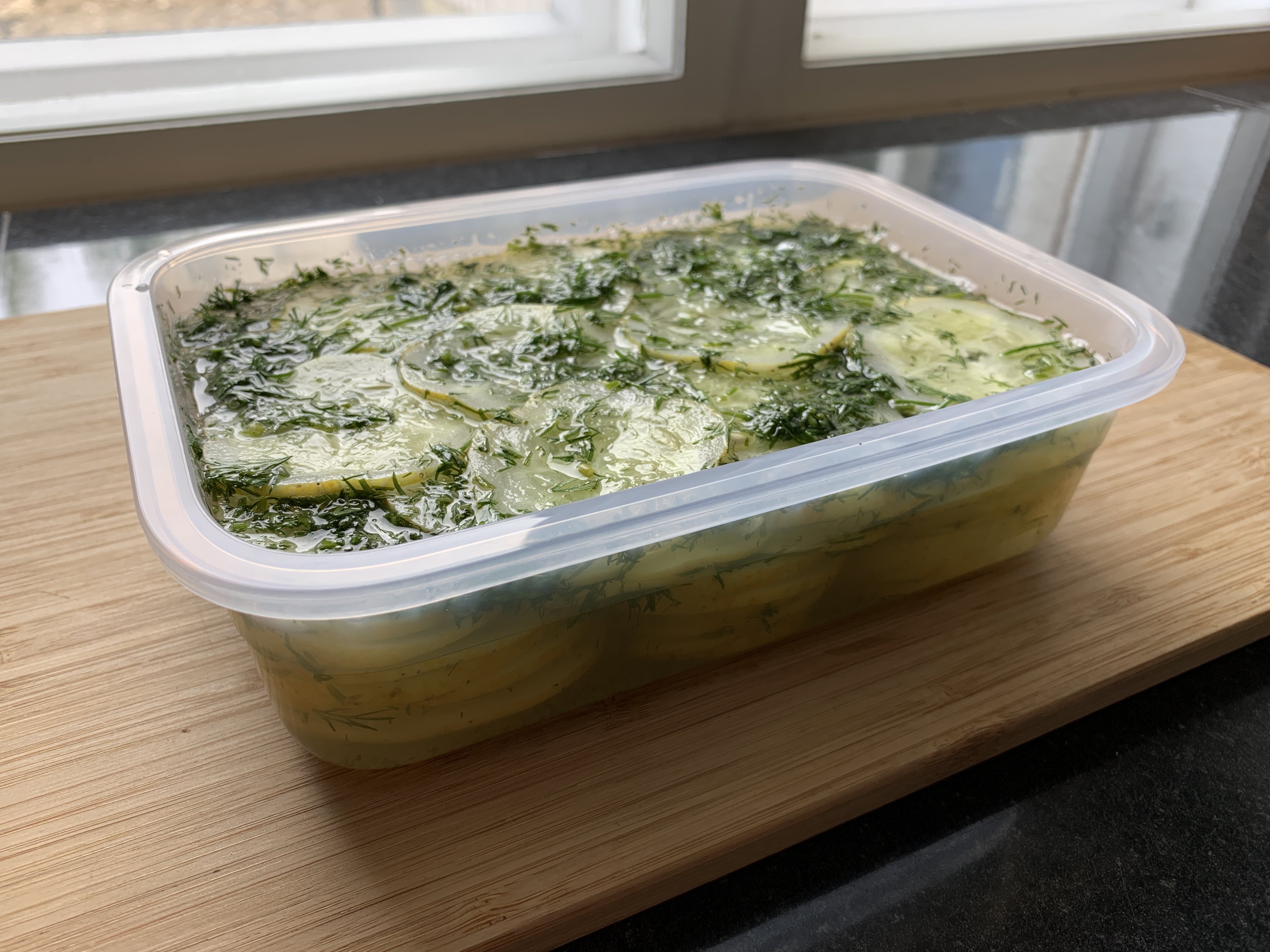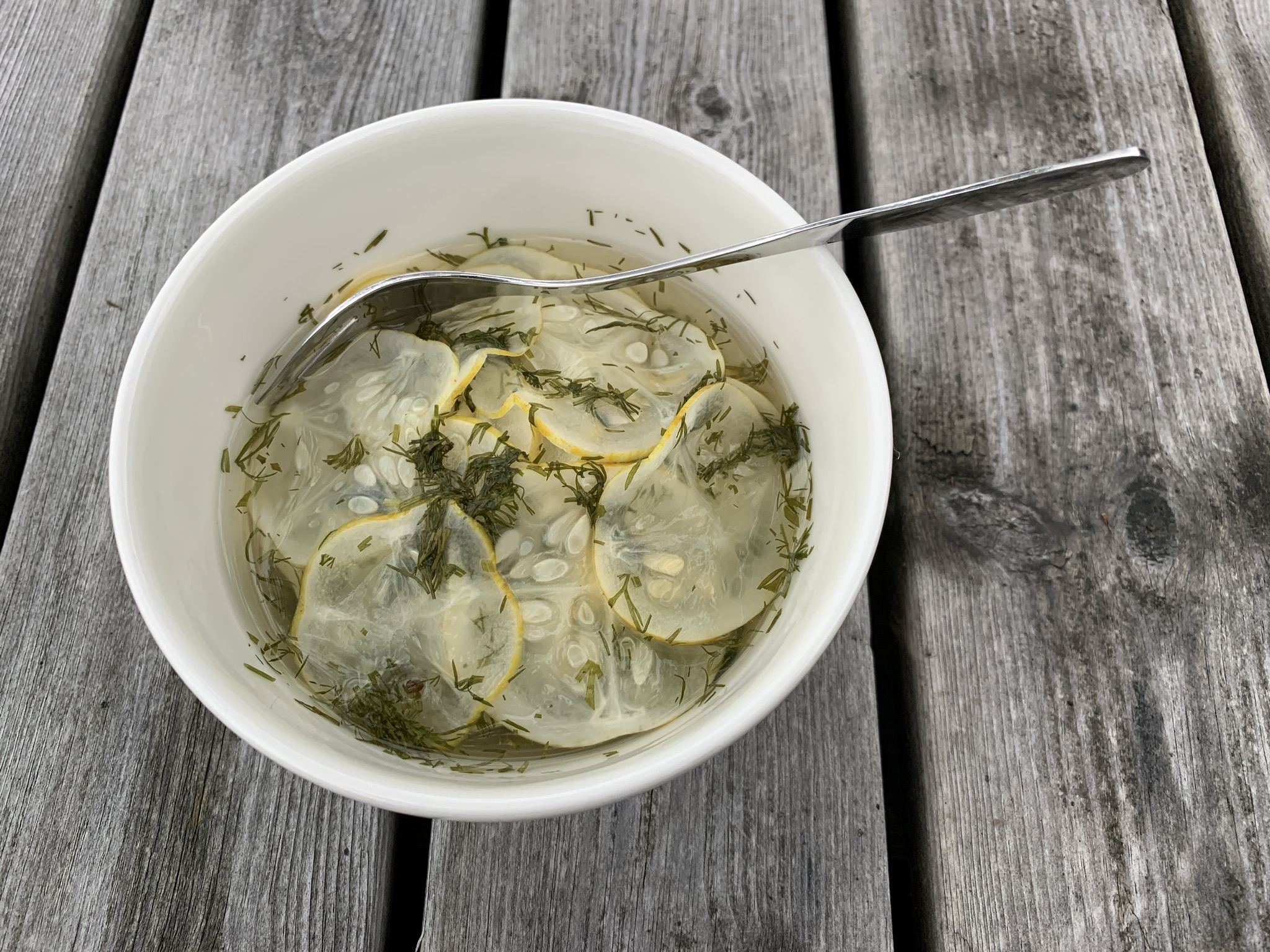 Viipaloi kurkut ohuiksi siivuiksi. Sekoita liemen ainekset. Kokoa kurkut ja kaada liemi vuorotellen purkkiin. Anna maustua vähintään muutama tunti. Voit hölskytellä kurkkuja silloin tällöin. Säilyy jääkaapissa ainakin muutaman viikon. Tarjoile vaikka jonkin kiusauksen kanssa.