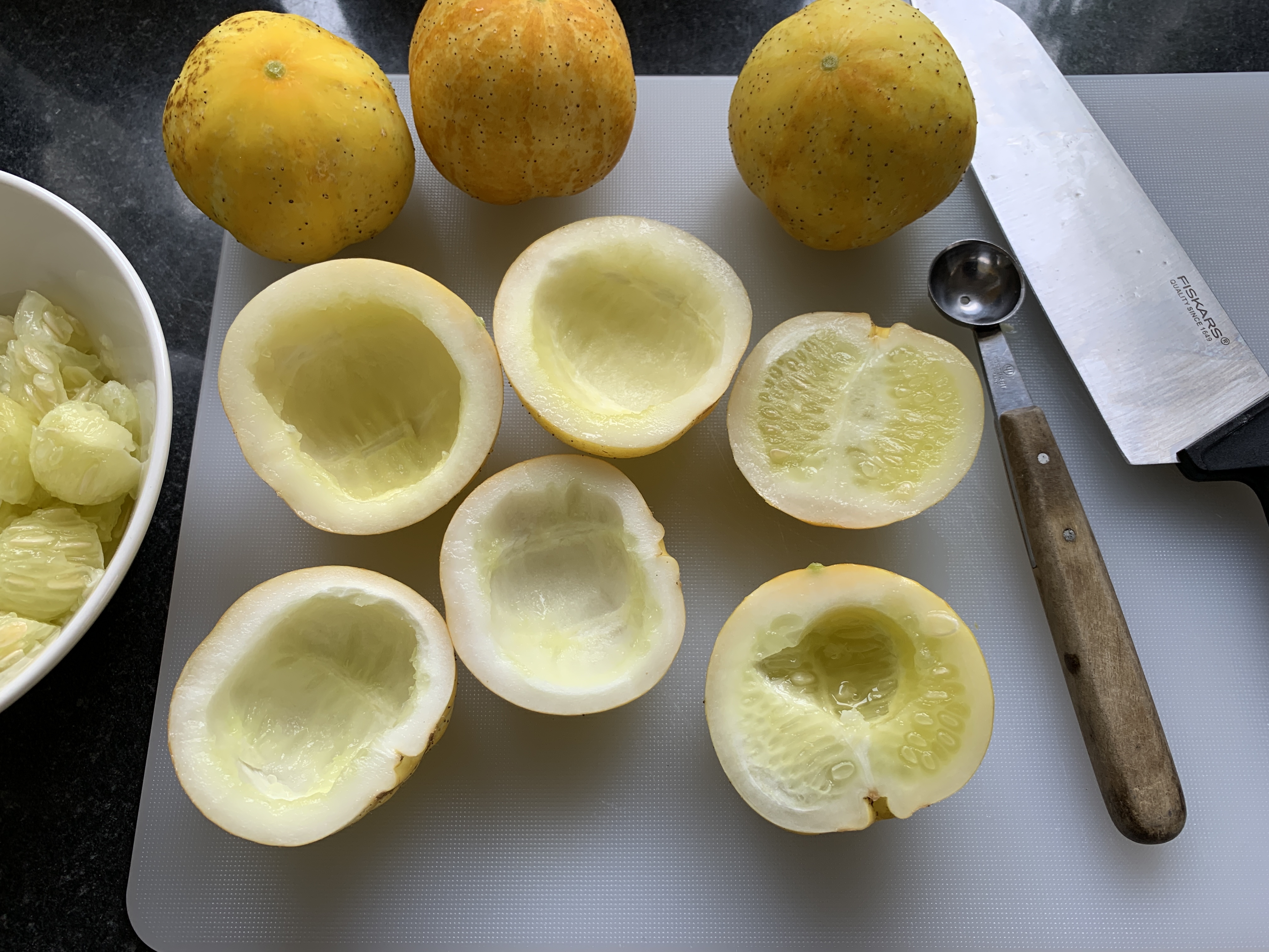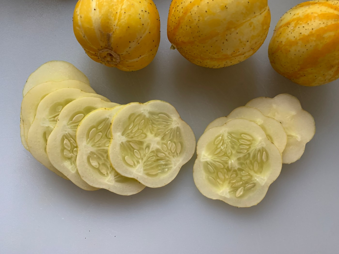 Sitruunakurkku on keltainen suht pieni ja pyöreä kurkku. Maku on hyvin samanlainen kuin tavallisessa kurkussa, mutta hiukan ehkä raikkaampi, rapeampi ja inan hedelmäinen. Kuori on myös paksumpi ja siemenet ovat isommat. Kuori on syötävää, mutta sen voi myös kuoria pois. Itse pidän rapeasta ja kauniin keltaisesta kuoresta joten en ole kuorinut pois. Kuoressa voi olla pieniä piikkejä, mutta ne lähtee helposti pyyhkimällä pois. Rouskuttelin näitä jopa suoraan köynnöksestä menemään.