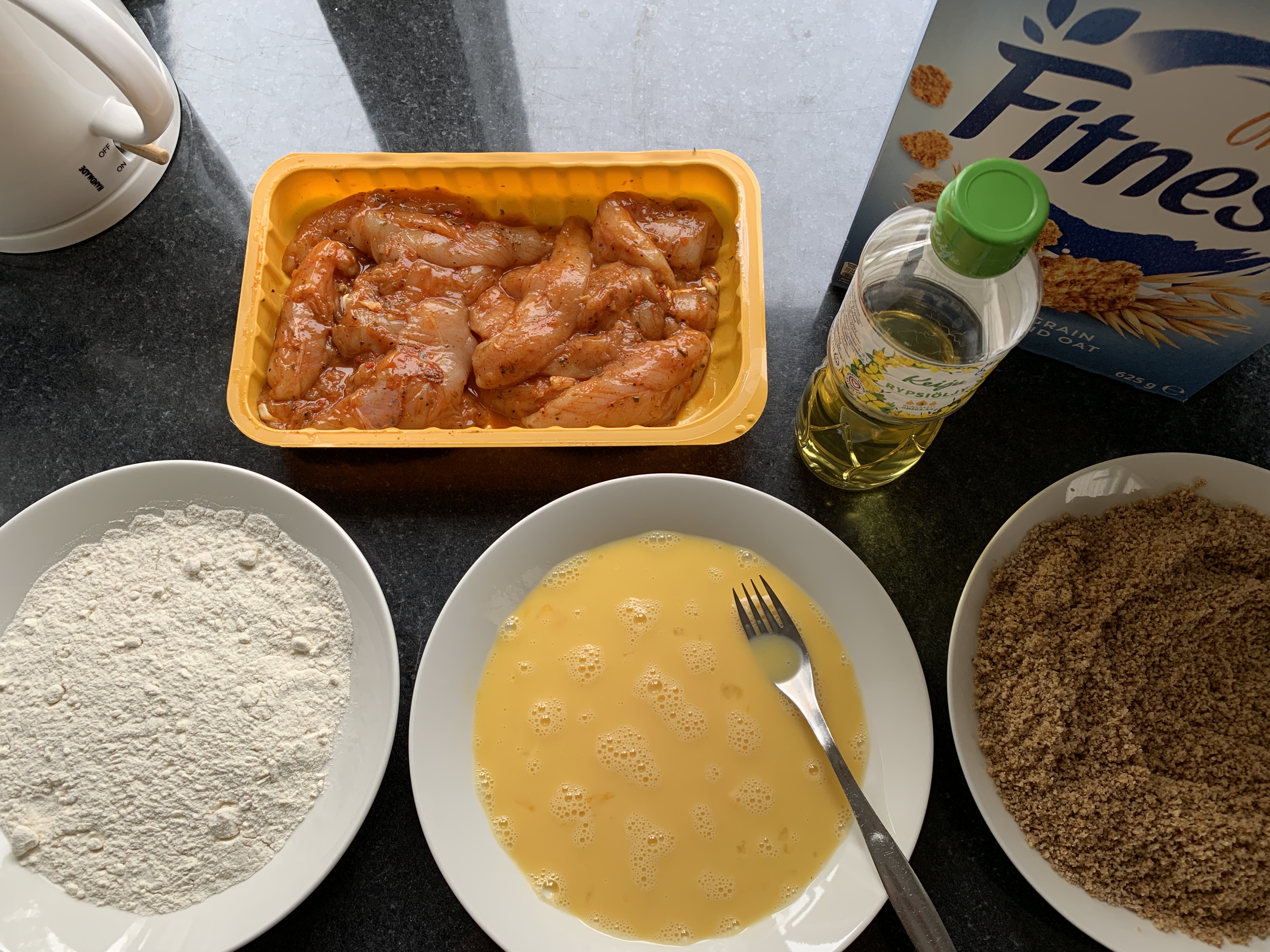 Murskaa murot ja sekoita niihin öljy ja mausteet. Pyörittele pienet kanafileet ensin vehnäjauhoissa, sitten vatkatussa kananmunassa ja viimeiseksi muromurskassa. Paista leivinpaperin päällä 20 minuuttia 200 asteisessa uunissa.