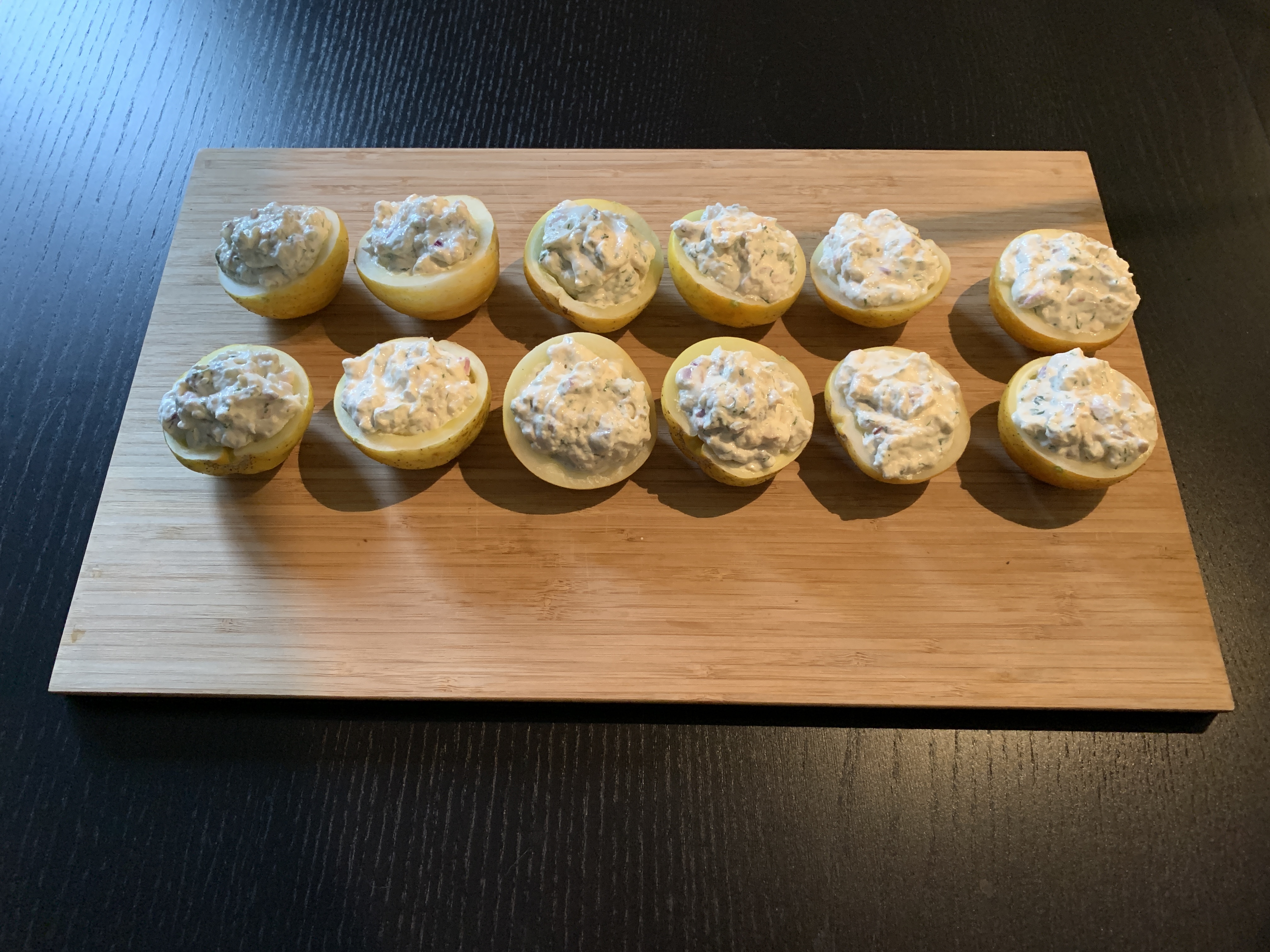 Leikkaa sitruunakurkut puoliksi ja koverra siemenet pois esimerkiksi melonipalloraudan kanssa. Kuivaa kurkkuja vaikka talouspaperin avulla. Kuori ja leikkaa punasipuli pieniksi kuutioiksi. Leikkaa lohisiivut pieniksi paloiksi. Vatkaa tuorejuusto ja ranskankerma. Purista seokseen limen mehu, lisää sipulikuutiot ja lohenpalat. Sekoita ja mausta tillillä, valkopippurilla ja suolalla. Voit jättää muutaman lohipalan ja tillin oksan koristelua varten.