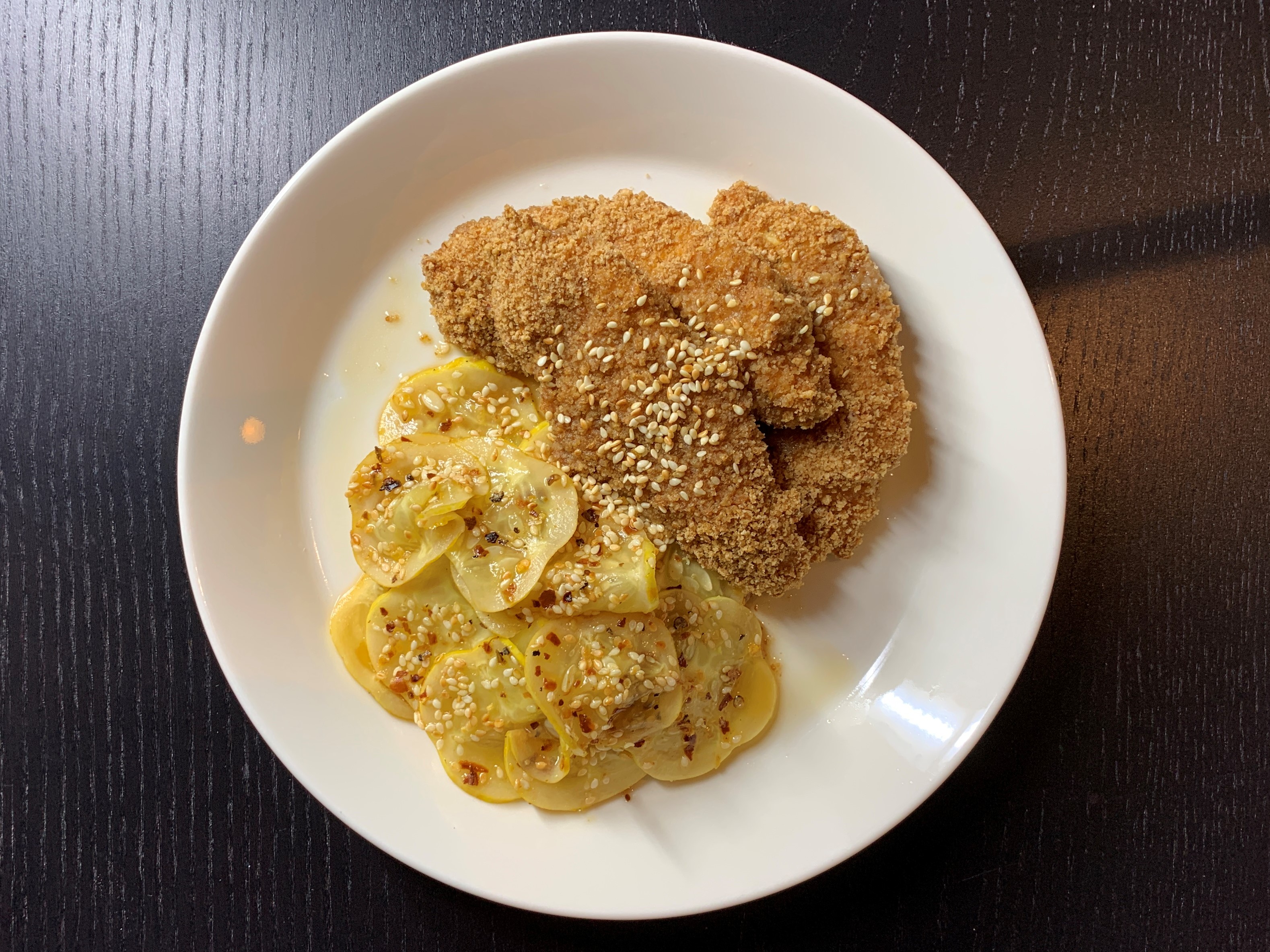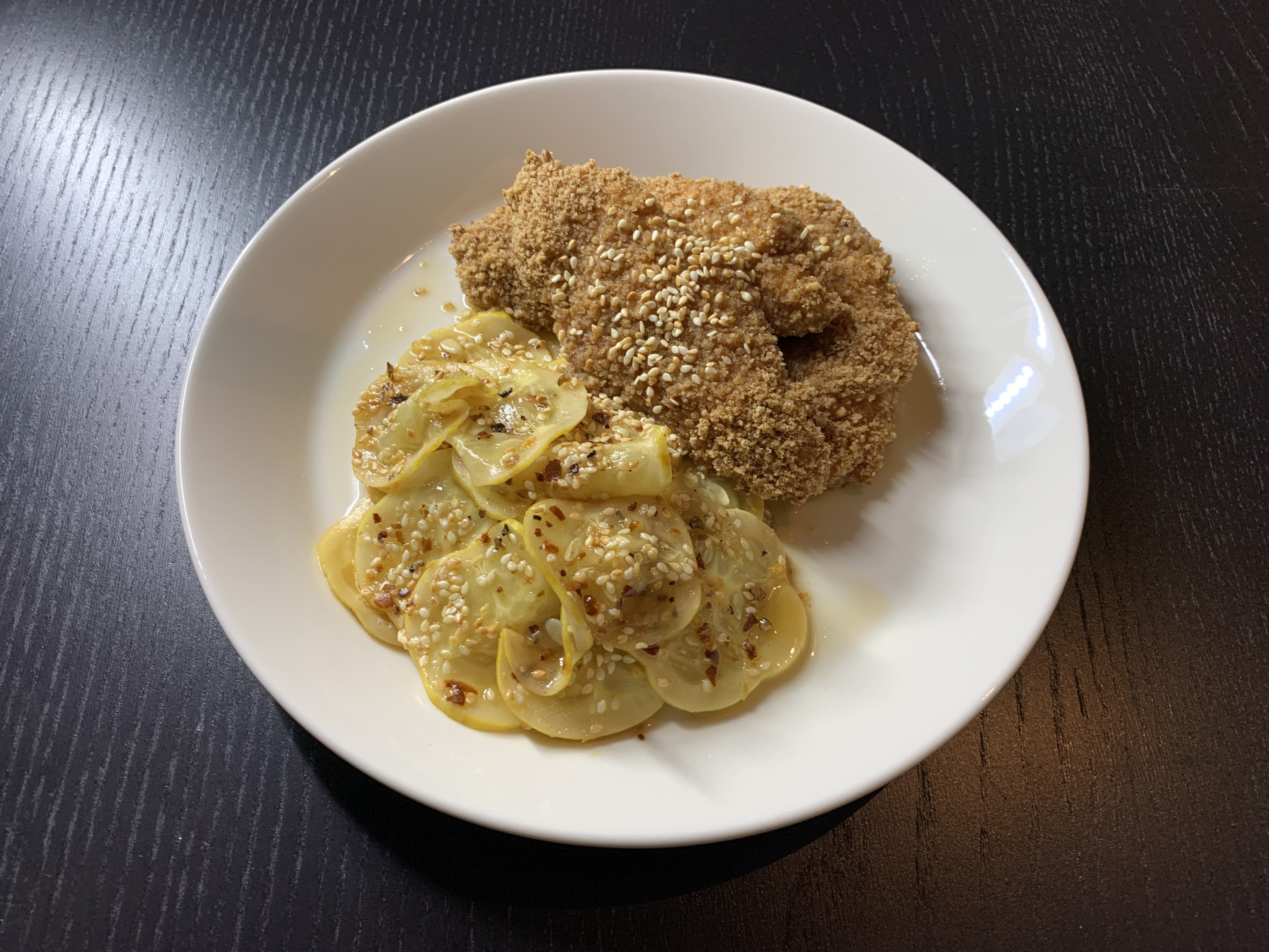 Paahda seesaminsiemenet kuivalla pannulla. Koristele kurkut paahdetuilla seesaminsiemenillä ja kuivatuilla chili hipuilla. Tarjoile heti esimerkiksi paneroidun kanan kanssa.