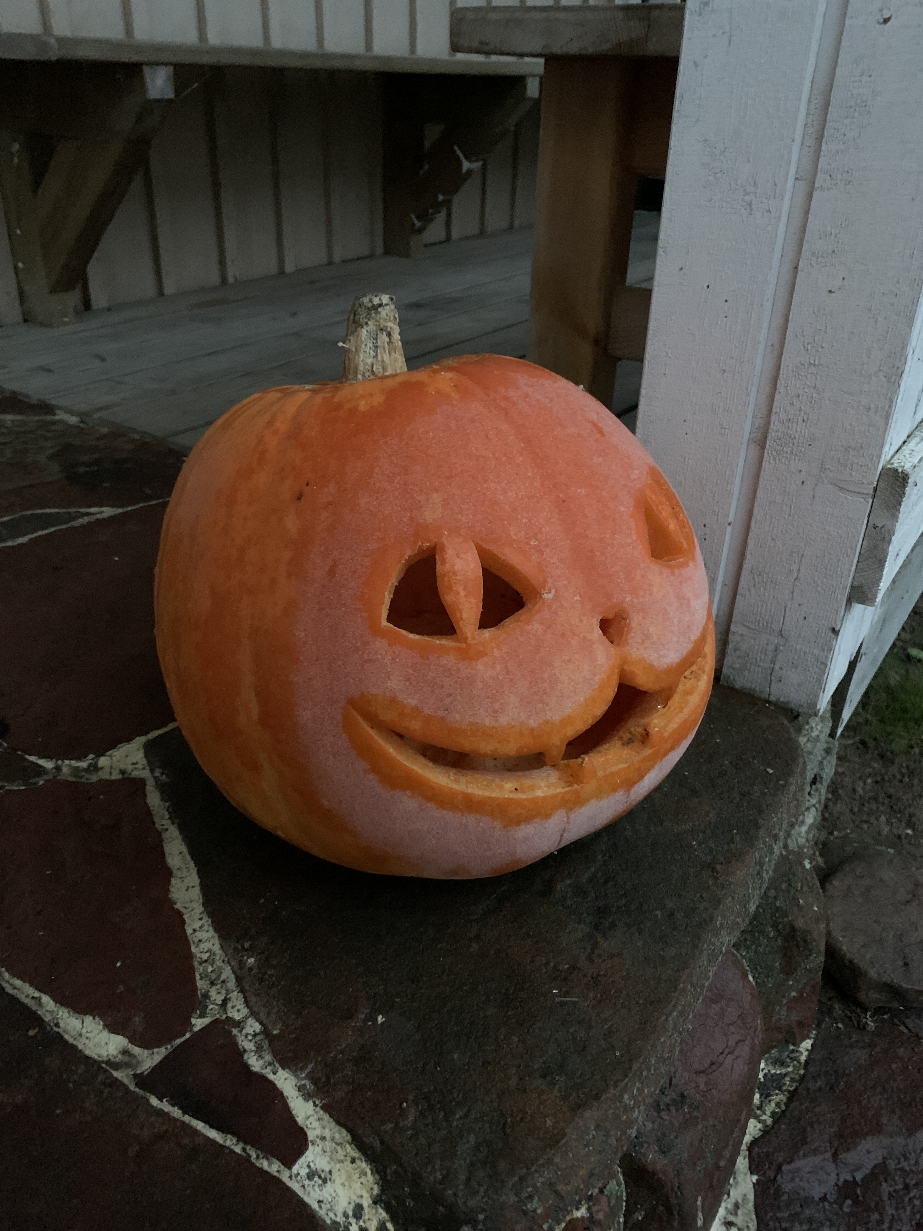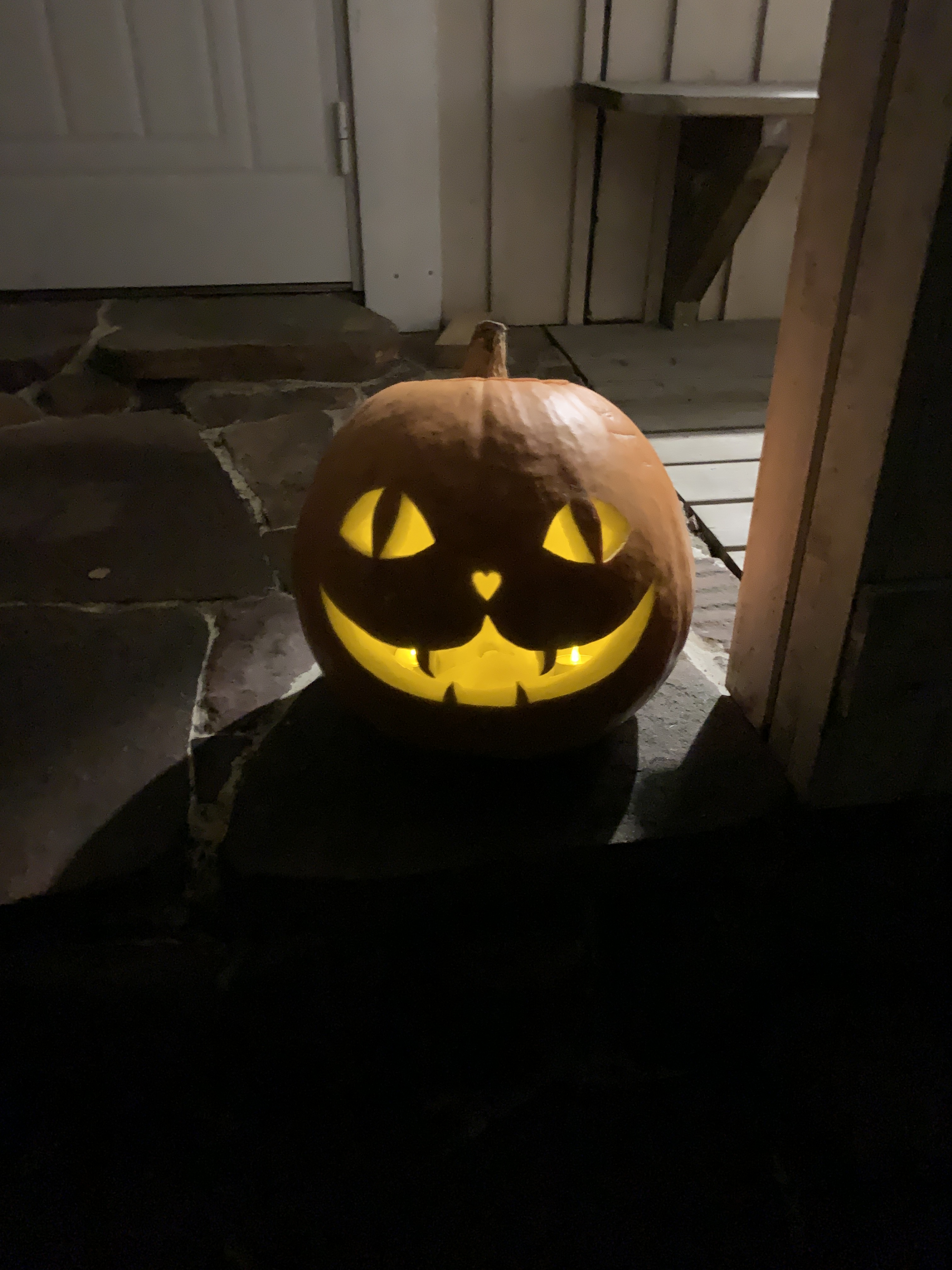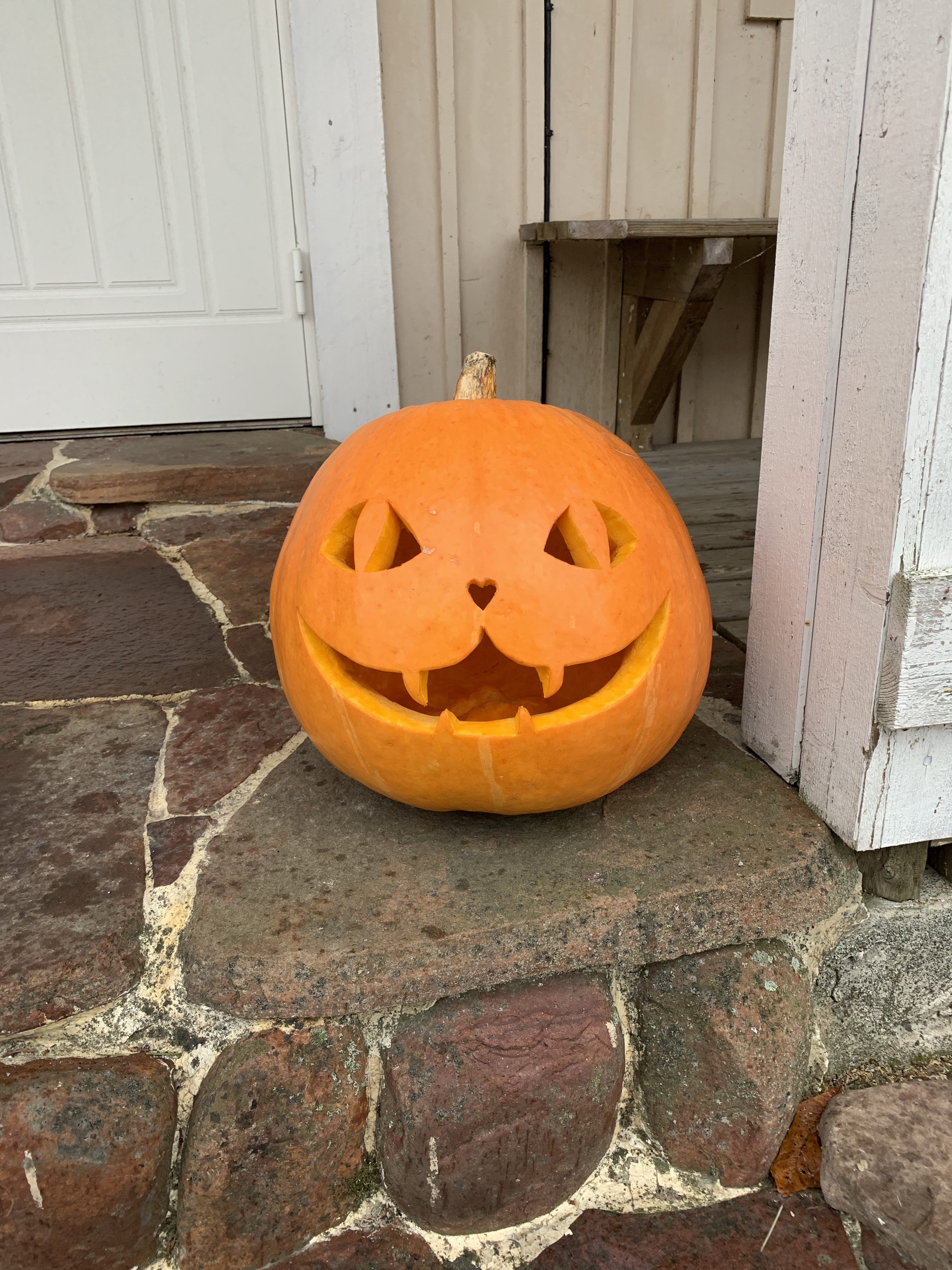 Meidän oman maan kurpitsa kasvoi 10,6 kg kokoon ja päätin tehdä siitä lyhdyn. Olen niin ihastunut meidän kattimatteihin, että kurpitsan teema oli helppo valita. Hahmottelin hiukan pehmeällä lyijärillä kisun naamaa ja ei muuta kuin ohuella puukolla kaivertamaan. Tadaa vampyyrikissahan siitä tuli! Sisusta meni piirakkaan.