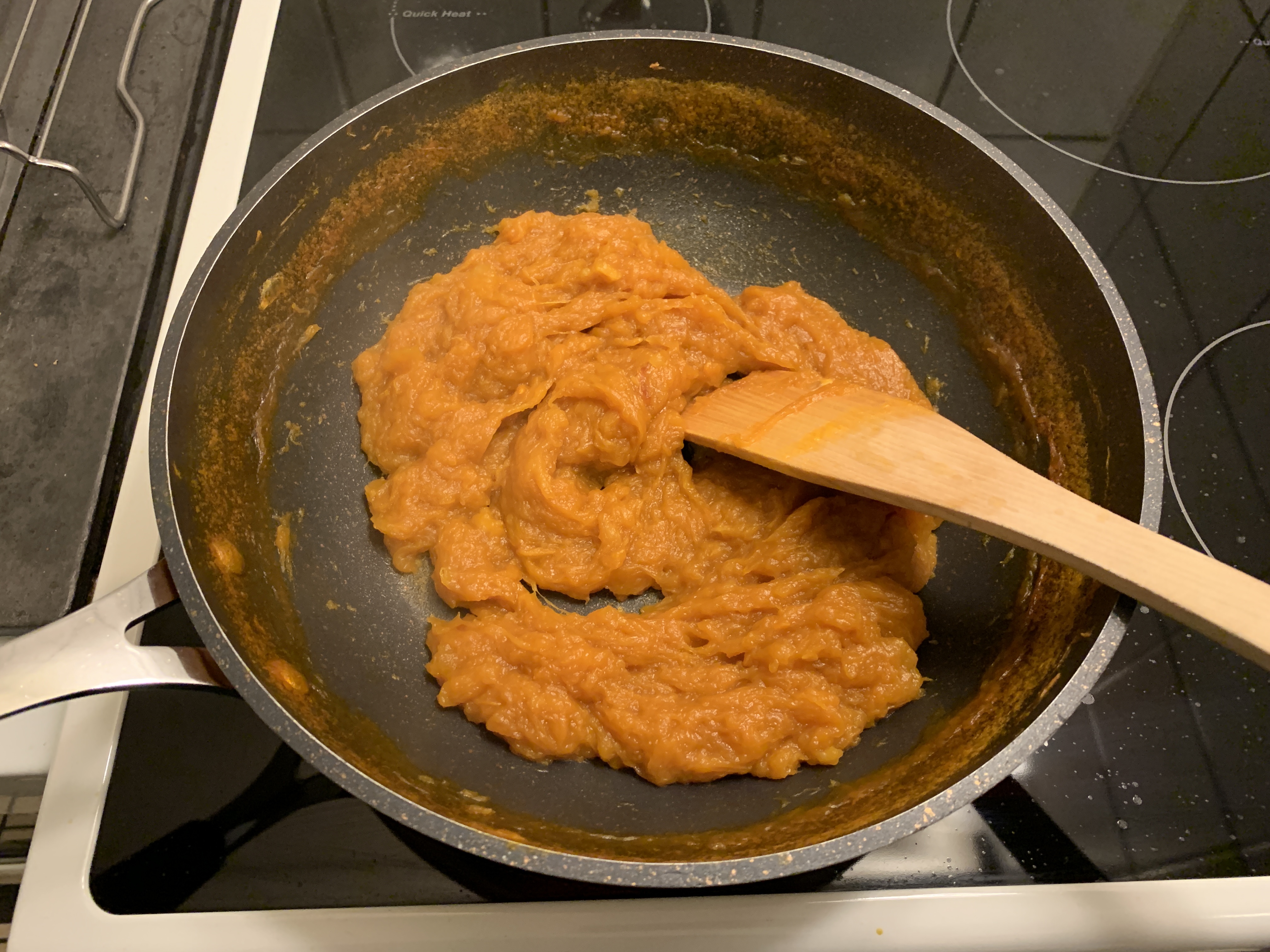 Erottele kurpitsan siemenet ja muu sisusta. Paista kurpitsan sisusta pehmeäksi ja kunnes suurin osa nesteestä on haihtunut (tämä saattaa ottaa oman aikansa). Lisää pannuun voi, suola ja sokeri. Paahda hetki. Anna jäähtyä ja soseuta halutessa tehosekoittimessa.