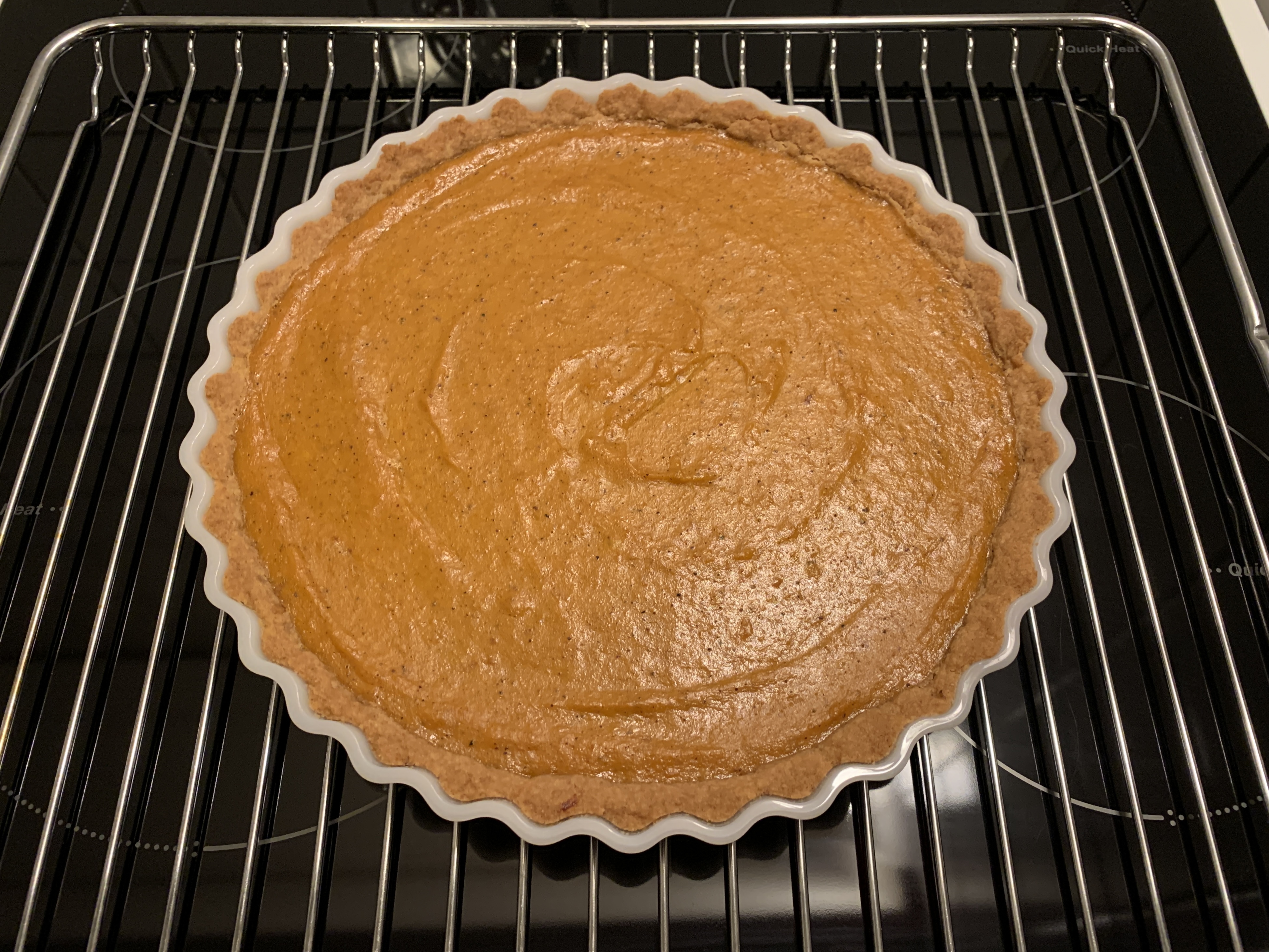 Paista 175 asteessa, uunin alatasolla 35 minuuttia, kunnes täyte on hyytynyt. Anna piirakan jäähtyä hyvin ennen kuorruttamista.