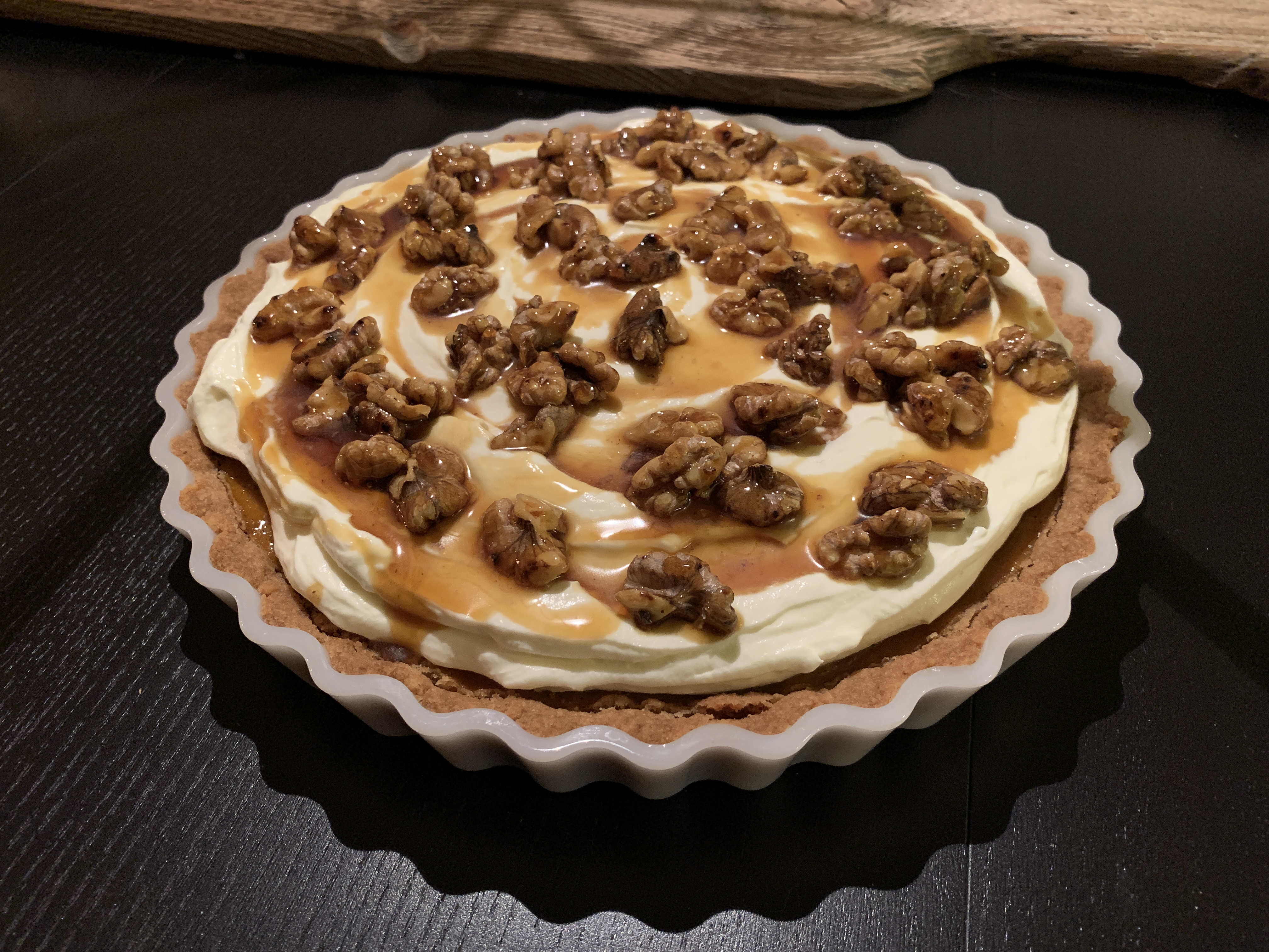 Vatkaa kerma vaahdoksi. Sekoita joukkoon rahka ja tomusokeri. Levitä rahkaseos piirakan päälle. Paahda saksanpähkinöitä kevyesti kuumalla kuivalla pannulla. Sekoita pähkinät siirappiin ja mausta ripauksella suolaa. Koristele juuri ennen tarjoilua ripottelemalla pinnalle siirappia ja rouhittuja saksanpähkinöitä.