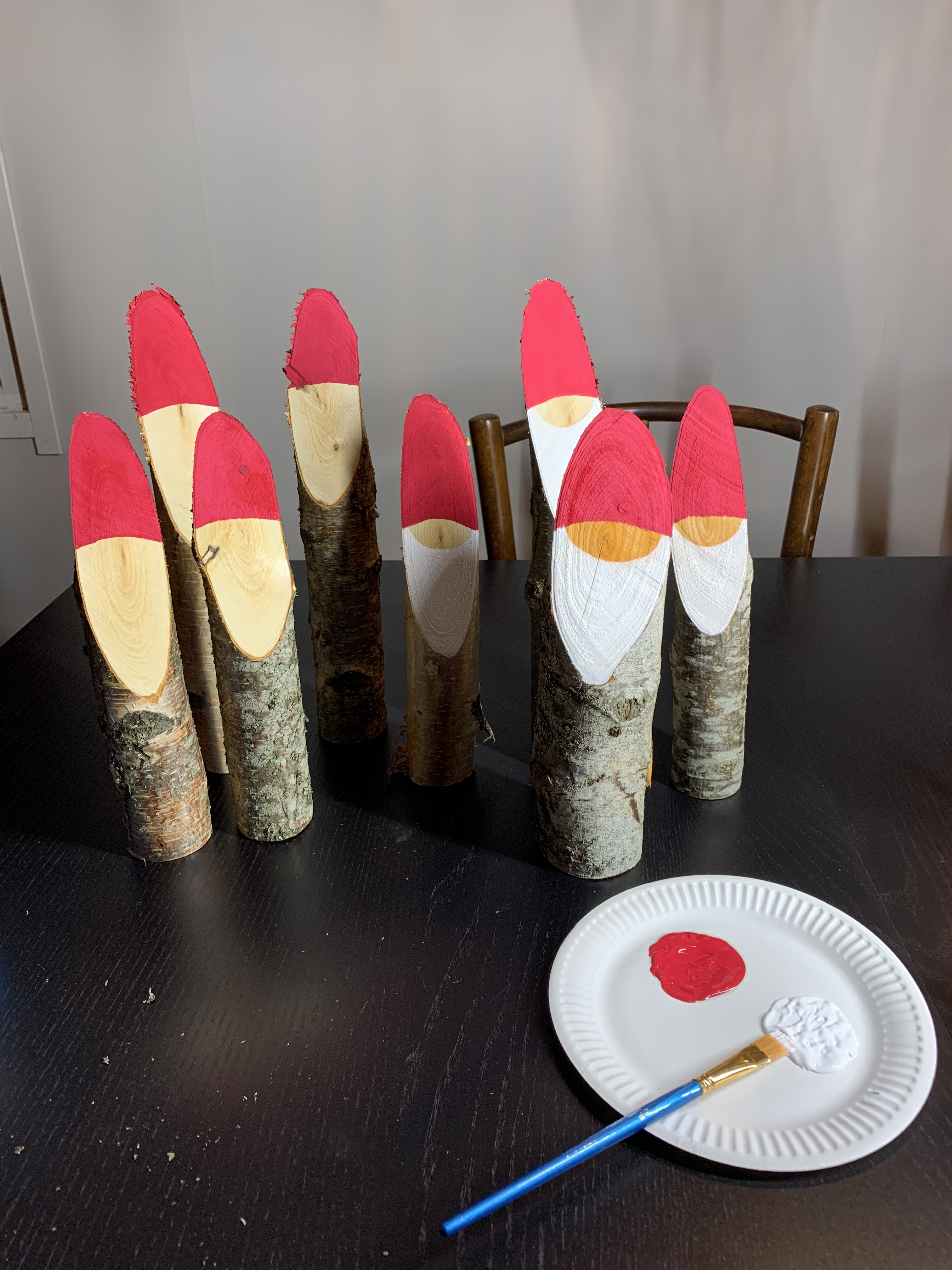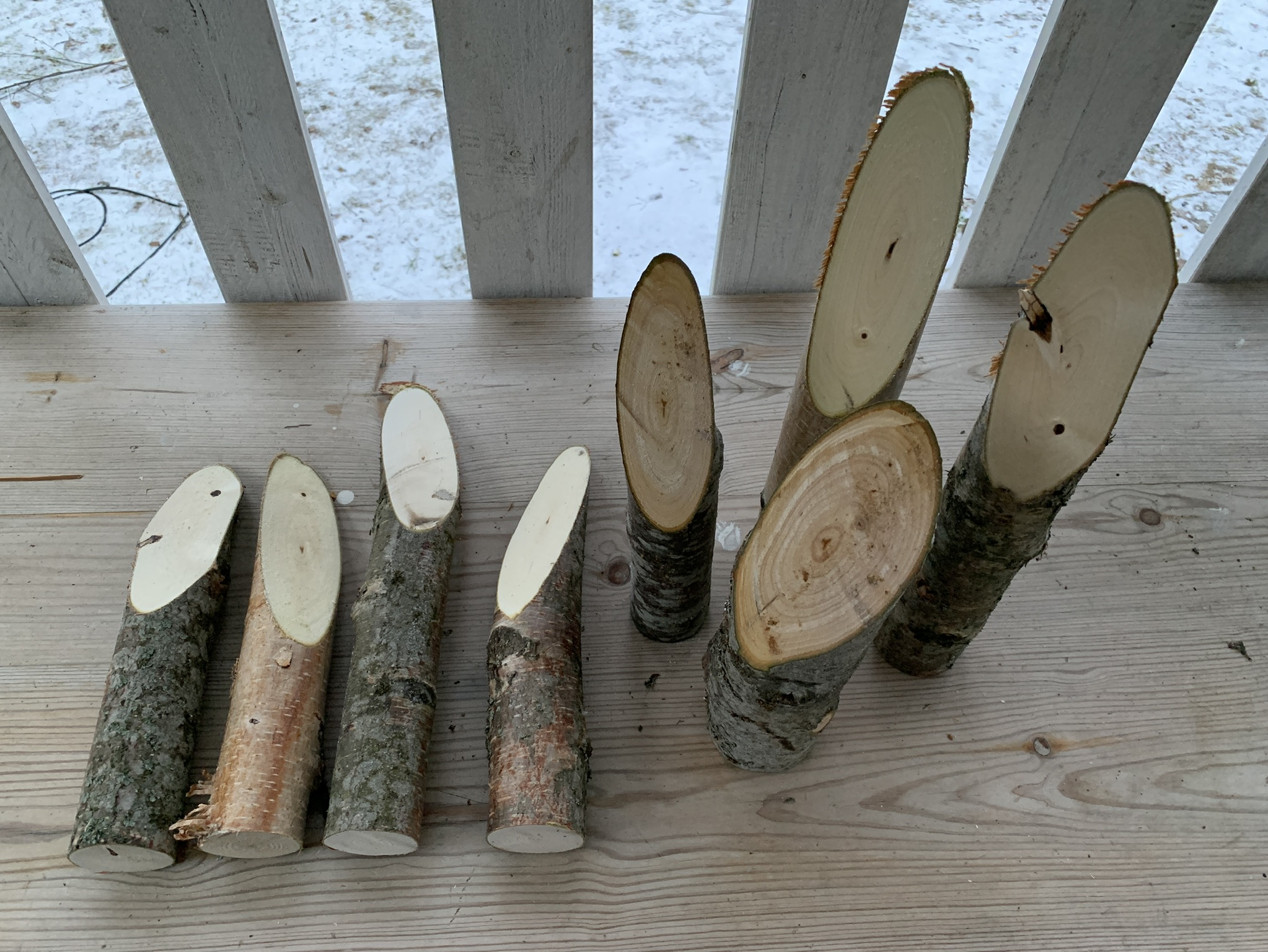 Tarvitset vain sahattuja puunoksia, akryyliväriä ja pensselin. Meillä isäntä teki mulle nämä viistoon leikatut puunoksat (koivua ja leppää), mutta esim Sinelli myy näitä valmiina.