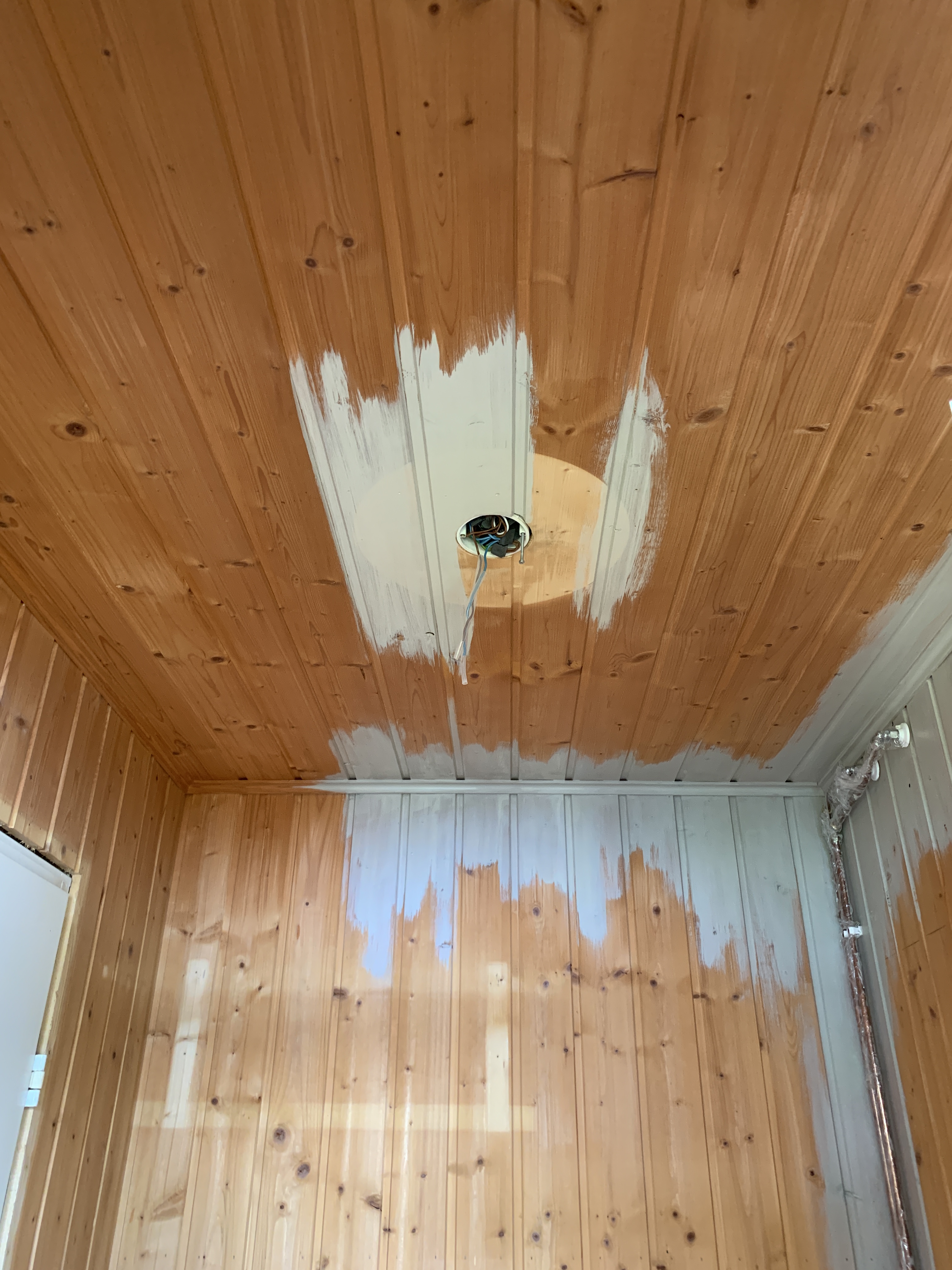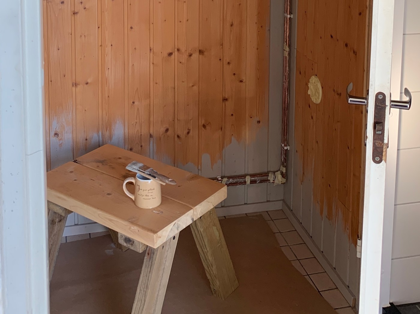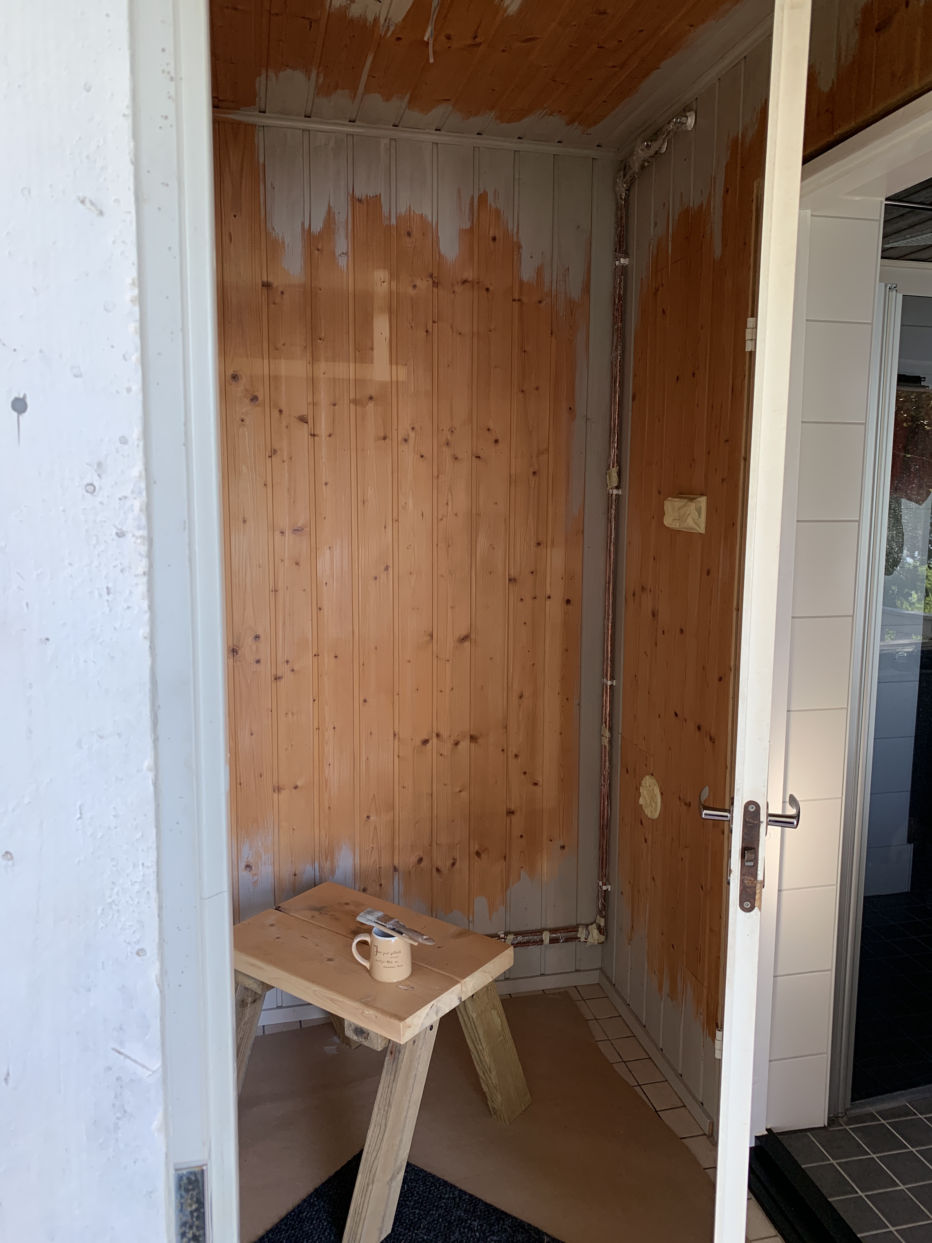 Ei se yhdessä päivässä tapahtunut vaikka ensin niin luulin. Listojen irroittelu ja maalaus, huonekalujen ja kynnyksien maalaus, paneelien pesu ja putkien suojaaminen vei oman aikansa. Itse maalaus ei vienyt kauaa hyvin levittyvällä Bloomin paneelivahalla. Läpikuultavalla vahalla sai yllättävän siistin ja raikkaan lopputuloksen. Olemme suht tyytyväisiä!