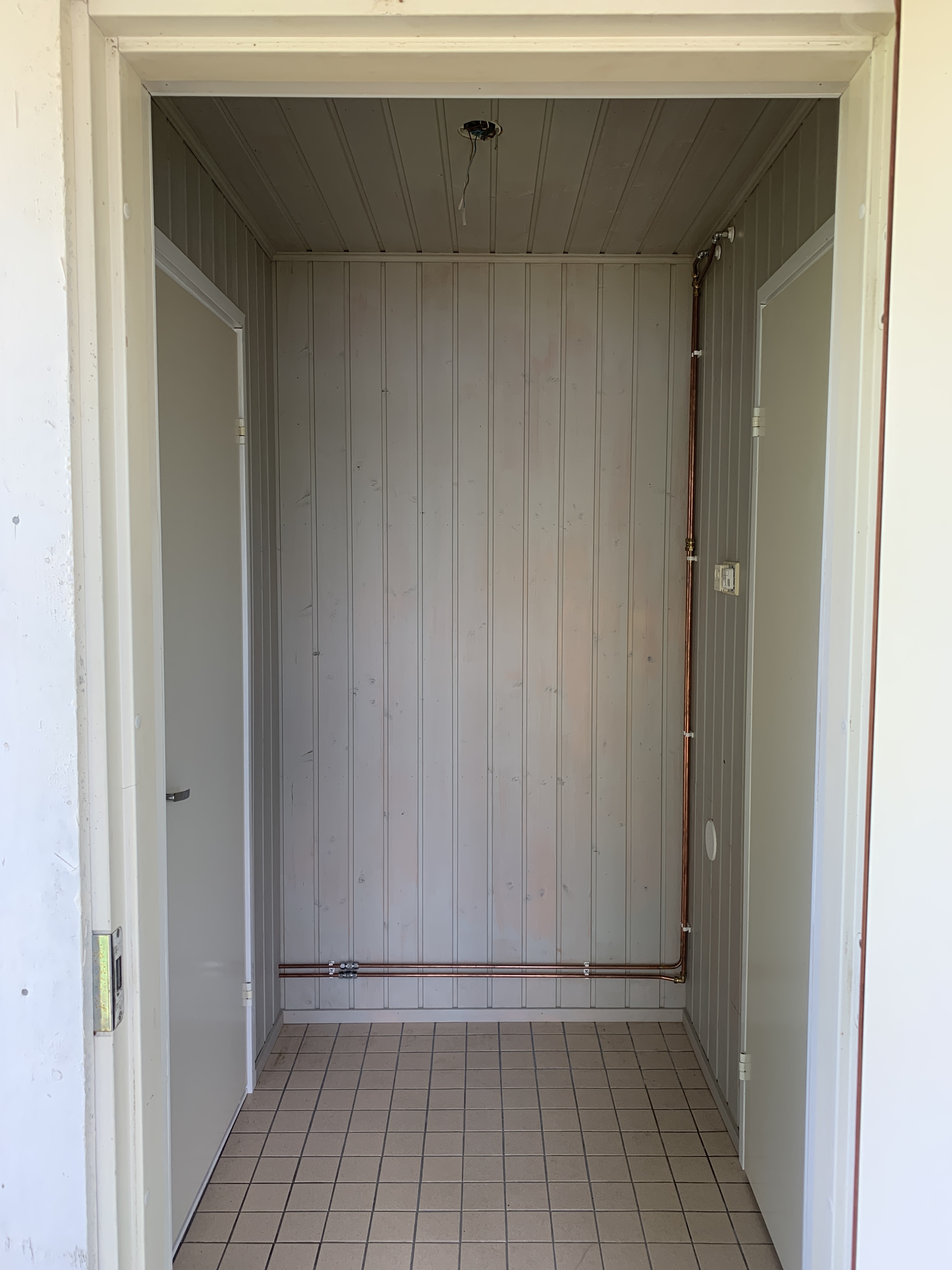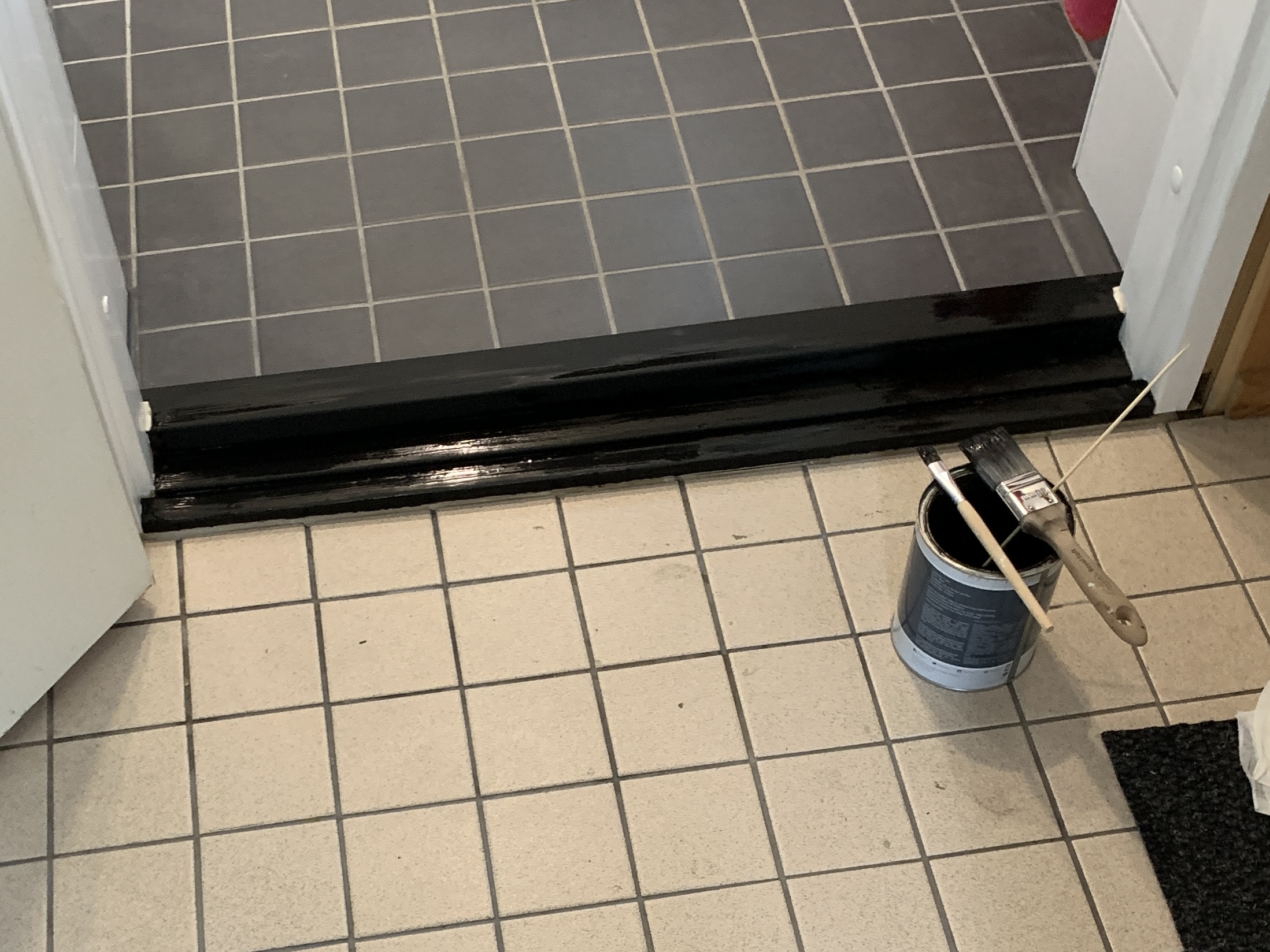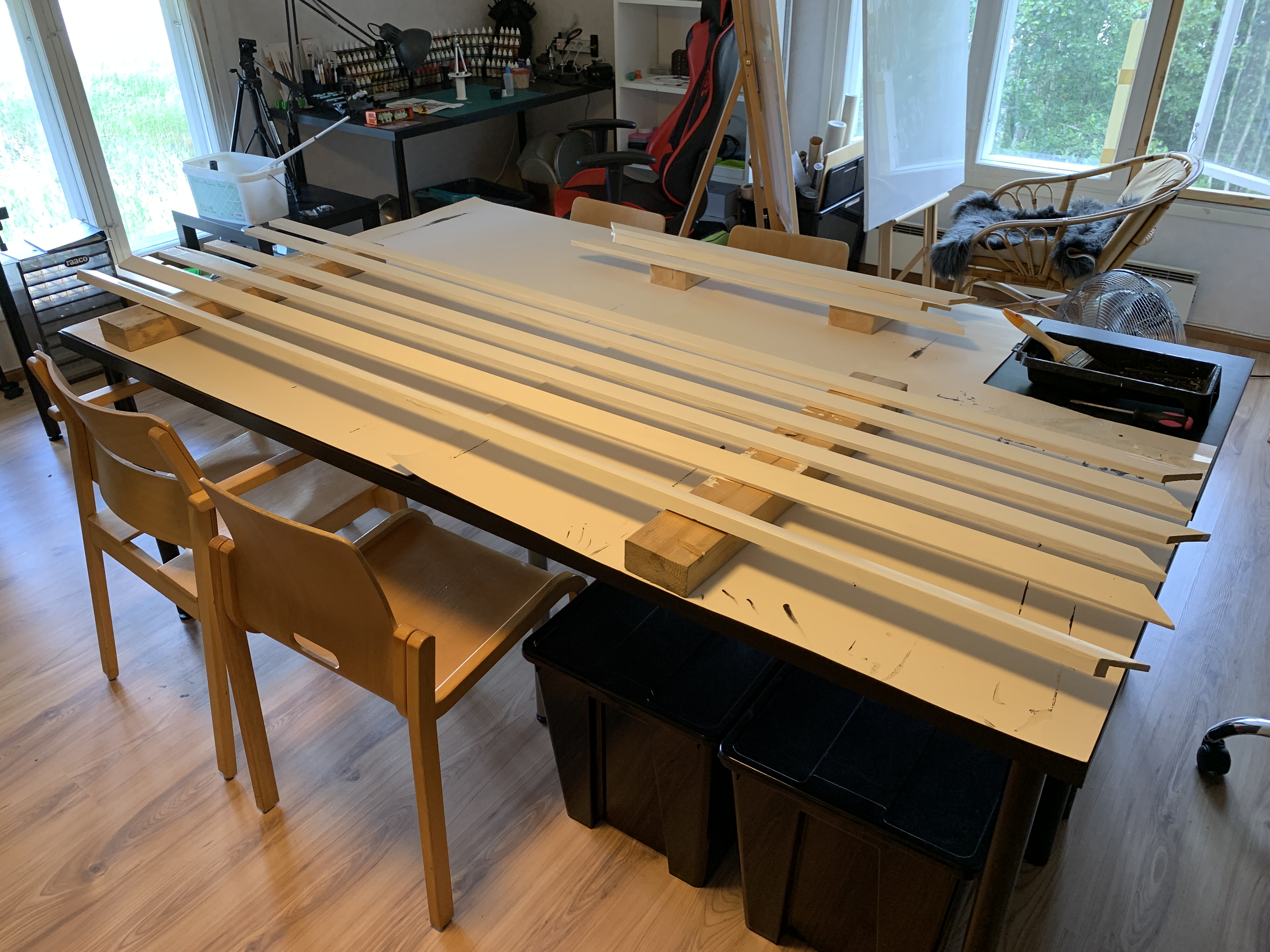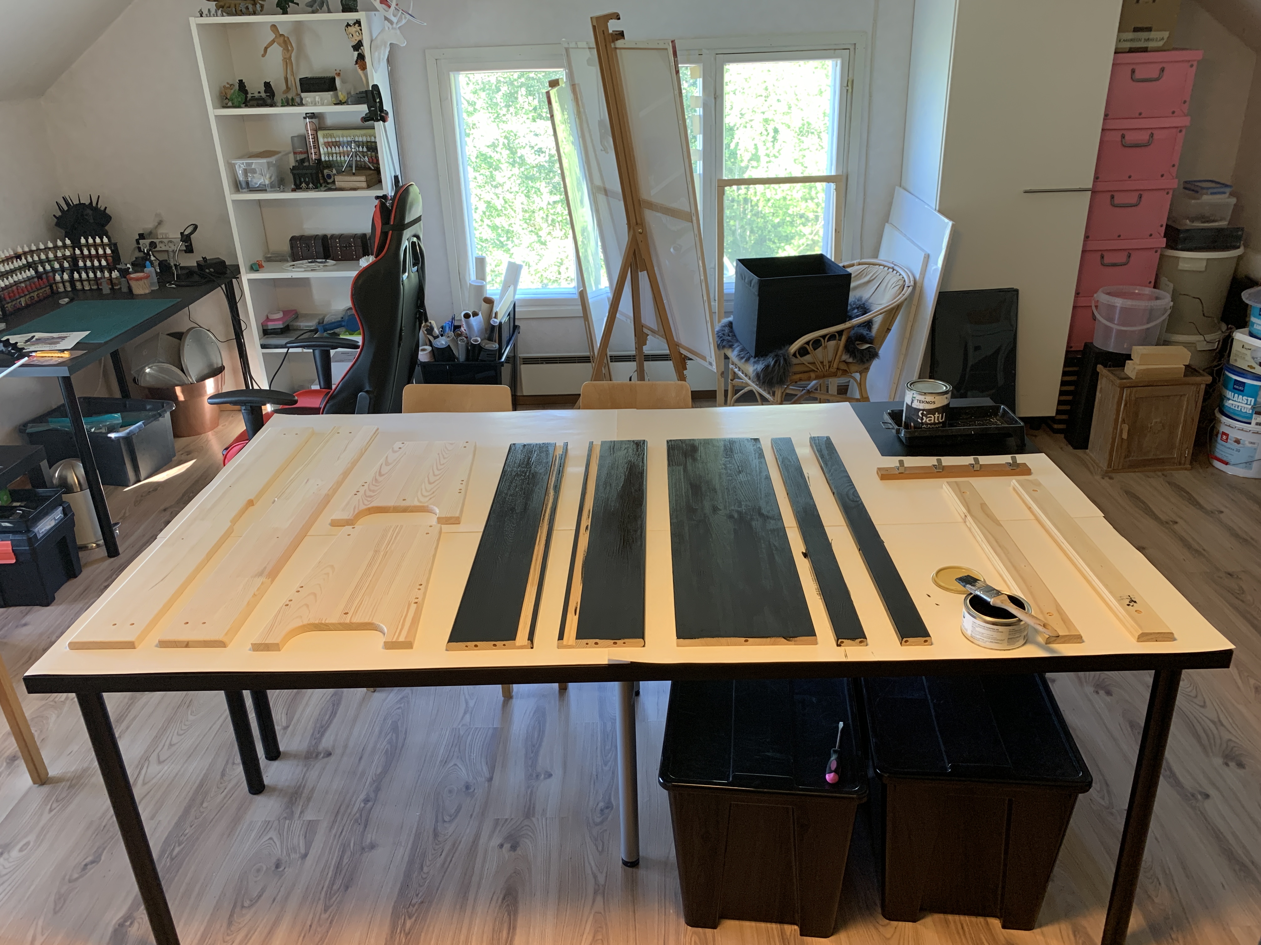 Ei se yhdessä päivässä tapahtunut vaikka ensin niin luulin. Listojen irroittelu ja maalaus, huonekalujen ja kynnyksien maalaus, paneelien pesu ja putkien suojaaminen vei oman aikansa. Itse maalaus ei vienyt kauaa hyvin levittyvällä Bloomin paneelivahalla. Läpikuultavalla vahalla sai yllättävän siistin ja raikkaan lopputuloksen. Olemme suht tyytyväisiä!