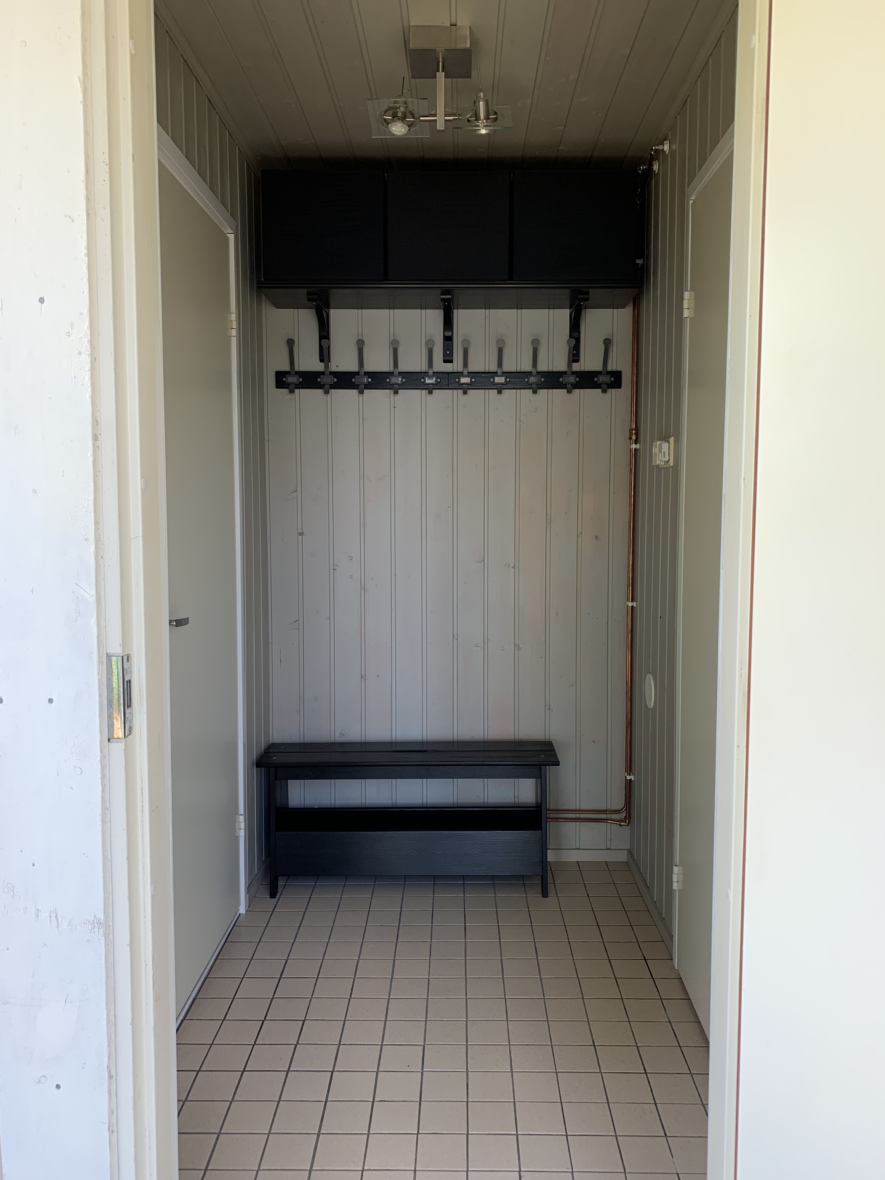 Koko paneelinen saunaeteinen sai muodonmuutoksen maalilla, muutamalla uudella huonekalulla ja vanhalla valaisimella.