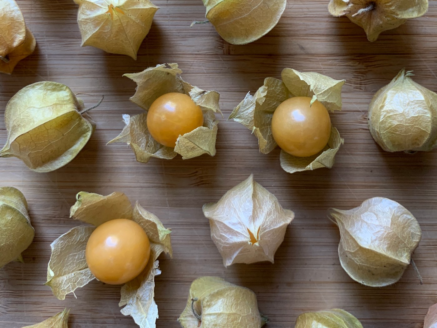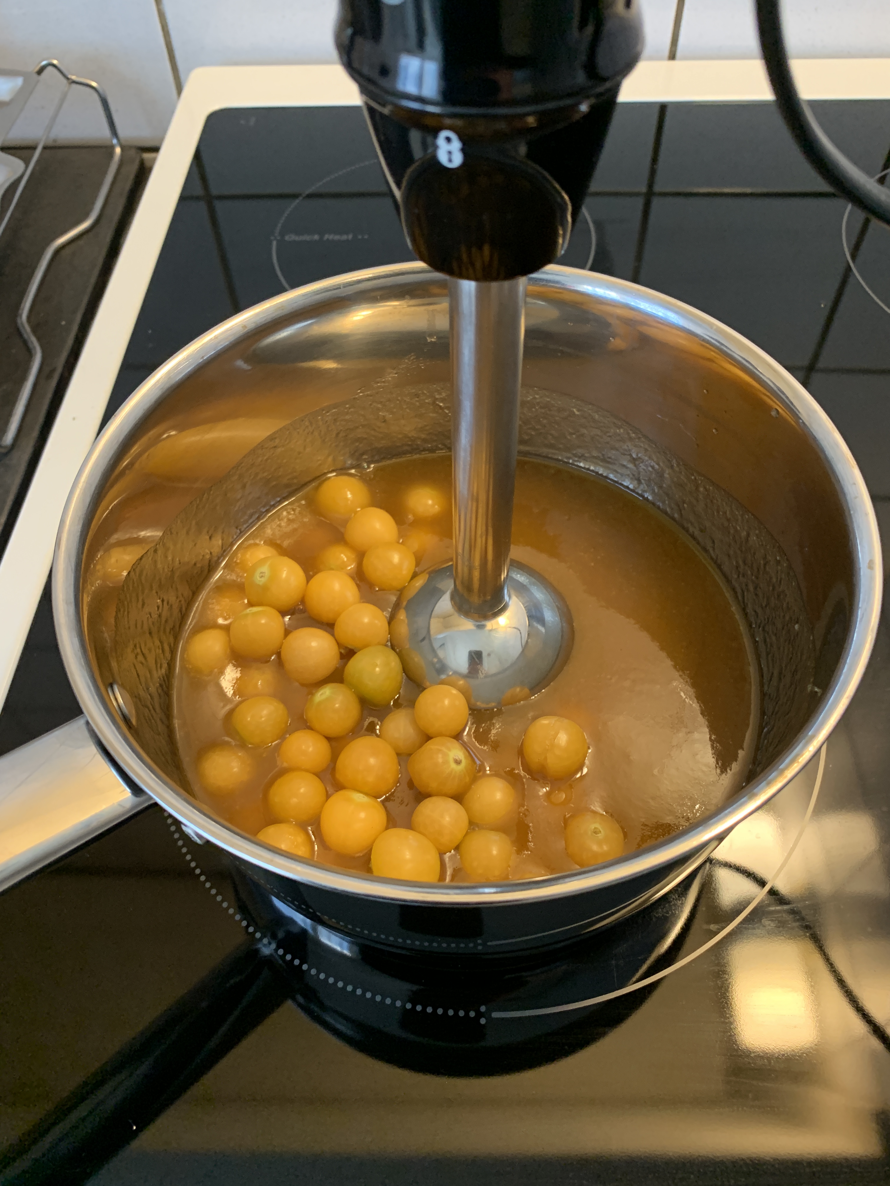 Ota lyhtyä muistuttava verhiö pois ananaskirsikoista. Pese ja soseuta ananaskirsikat niin että kuoretkin soseutuvat. Voit siivilöidä soseen vielä isoreikäisellä siivilällä tarvittaessa.