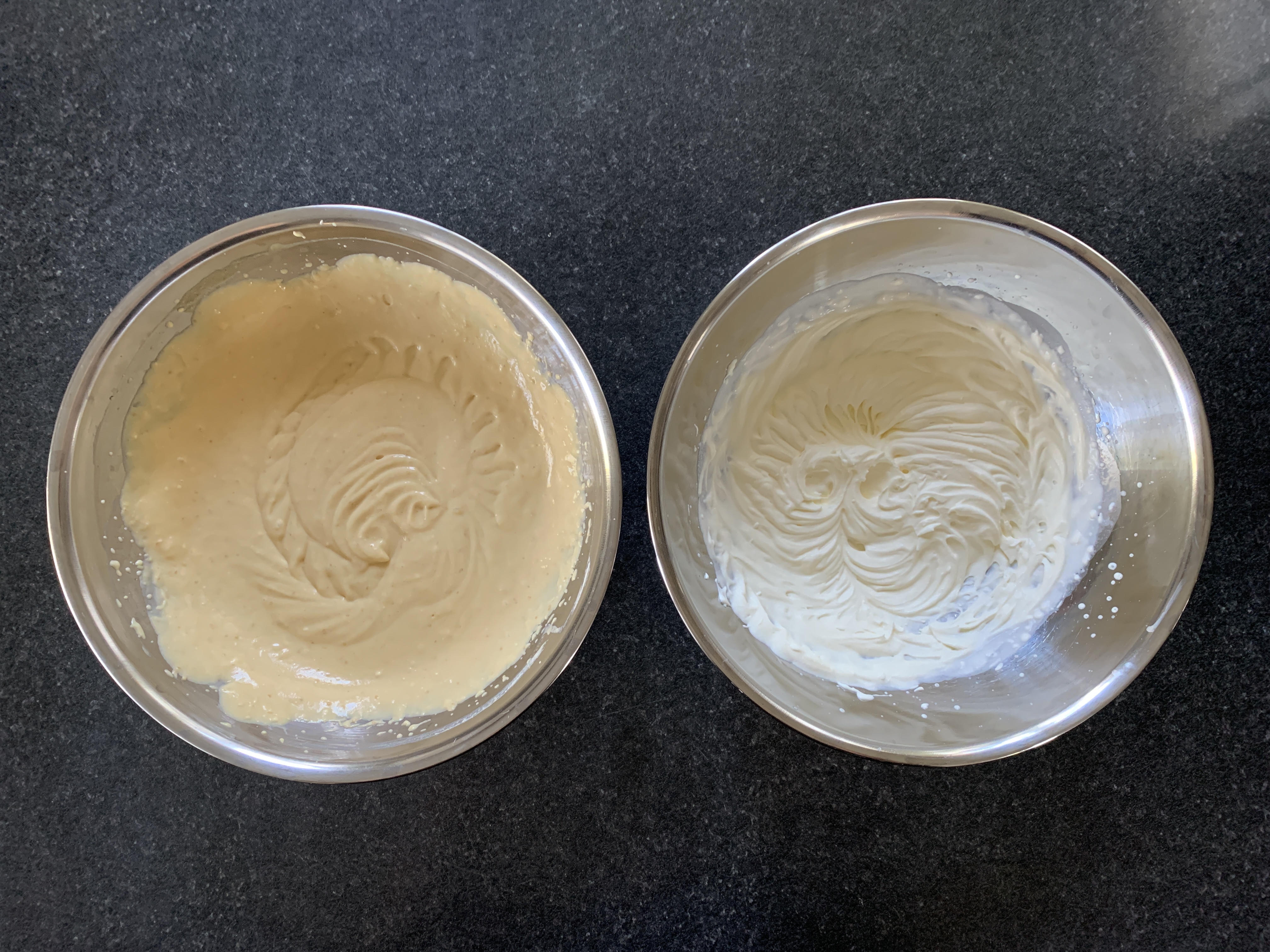 Sekoita sähkövatkaimella tuorejuusto ja hedelmäsoseet. Vatkaa vispikerma toisessa kulhossa.