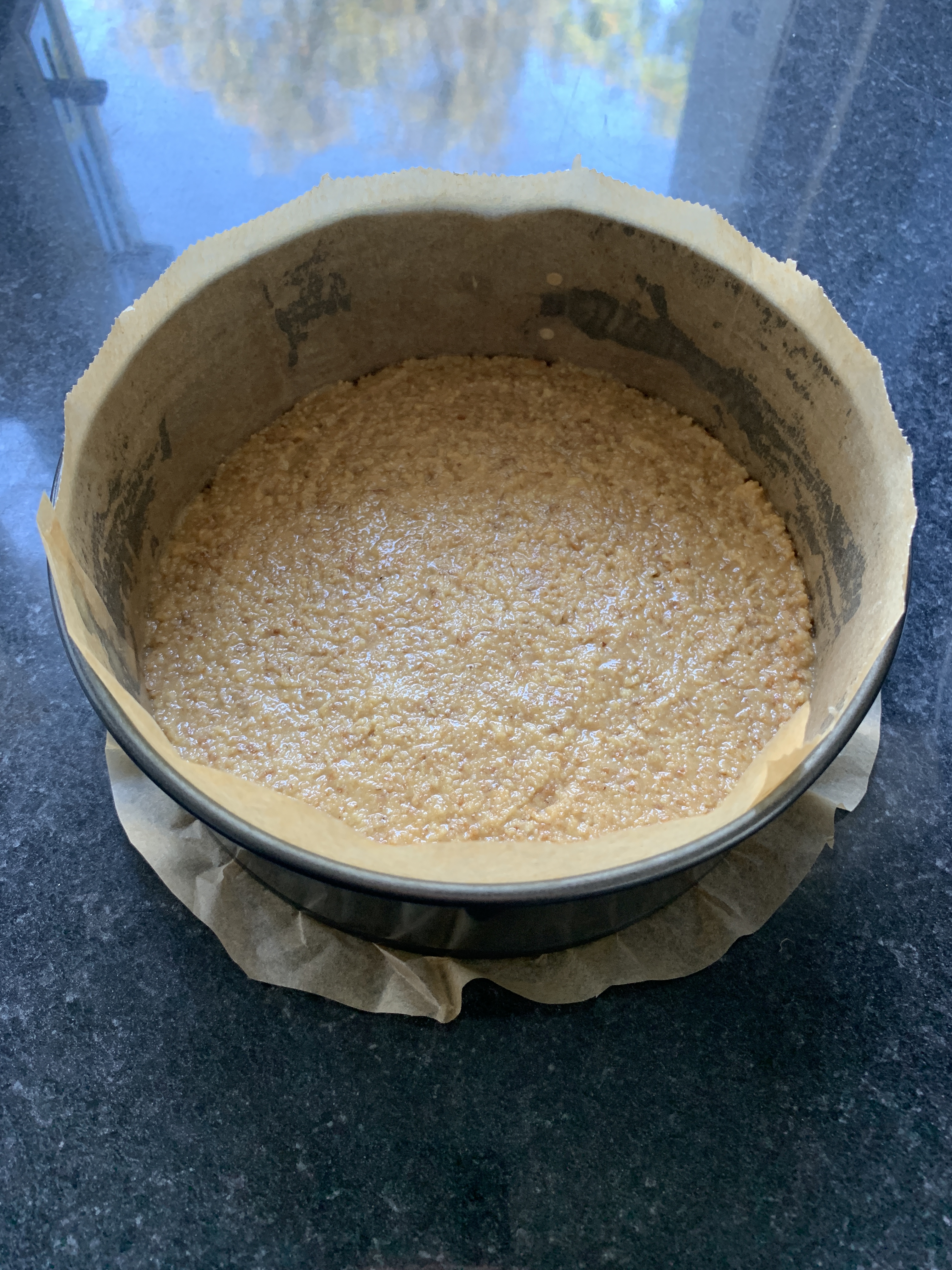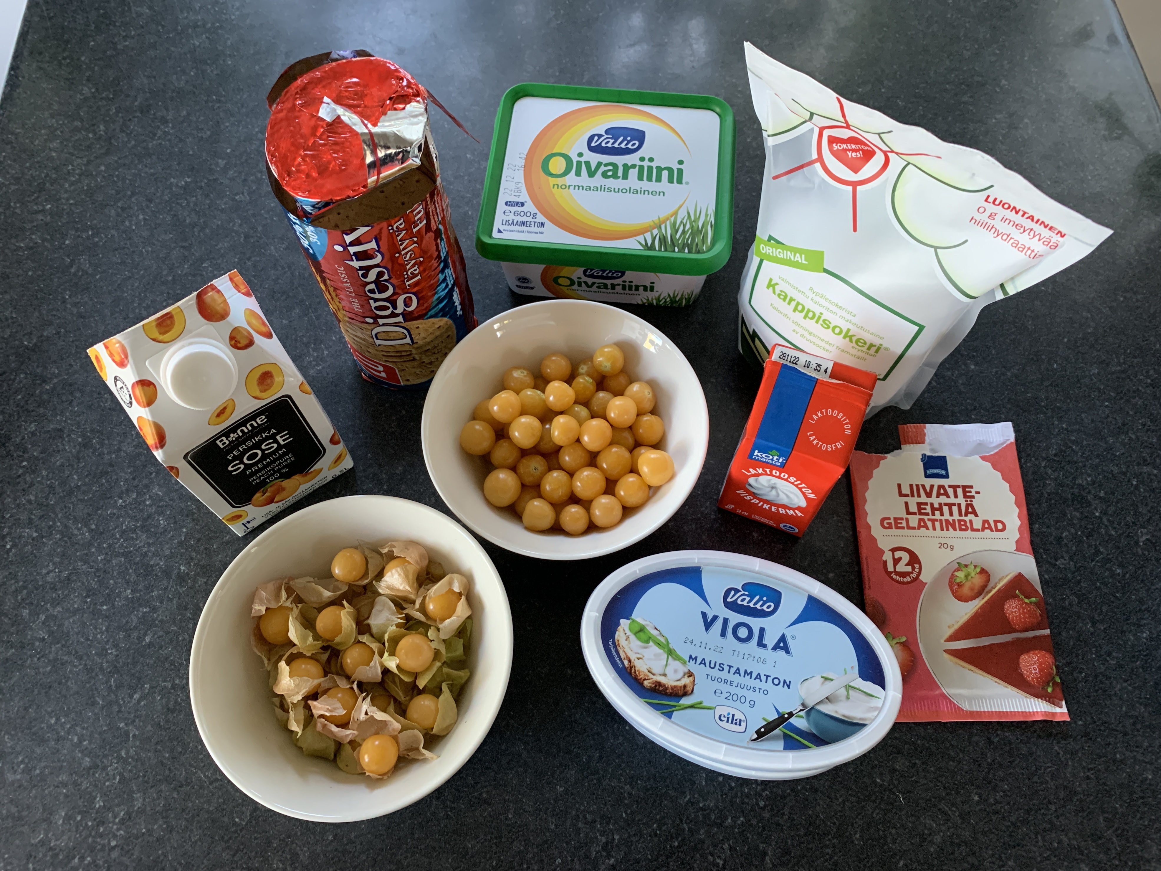 Murskaa keksit ja sekoita joukkoon sulatettu voi. Painele seos leivinpaperilla vuorattuun irtopohjavuokaan (Ø 18 cm). Laita vuoka jääkaappiin.