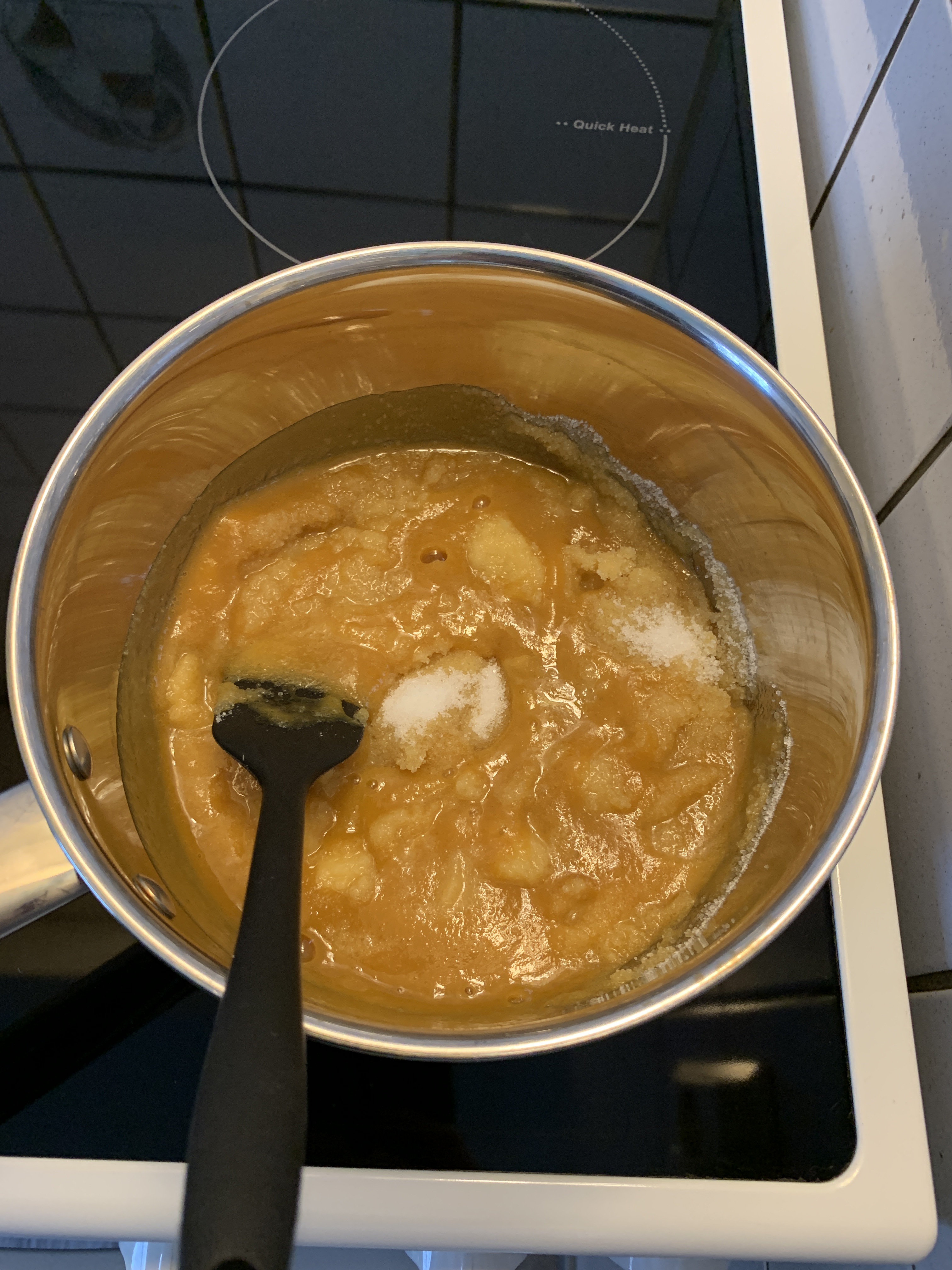 Kuumenna persikkasose ja karppisokeri kattilassa niin että karppisokeri liukenee soseeseen. Näin karppisokeri ei jää narskumaan hampaisiin.