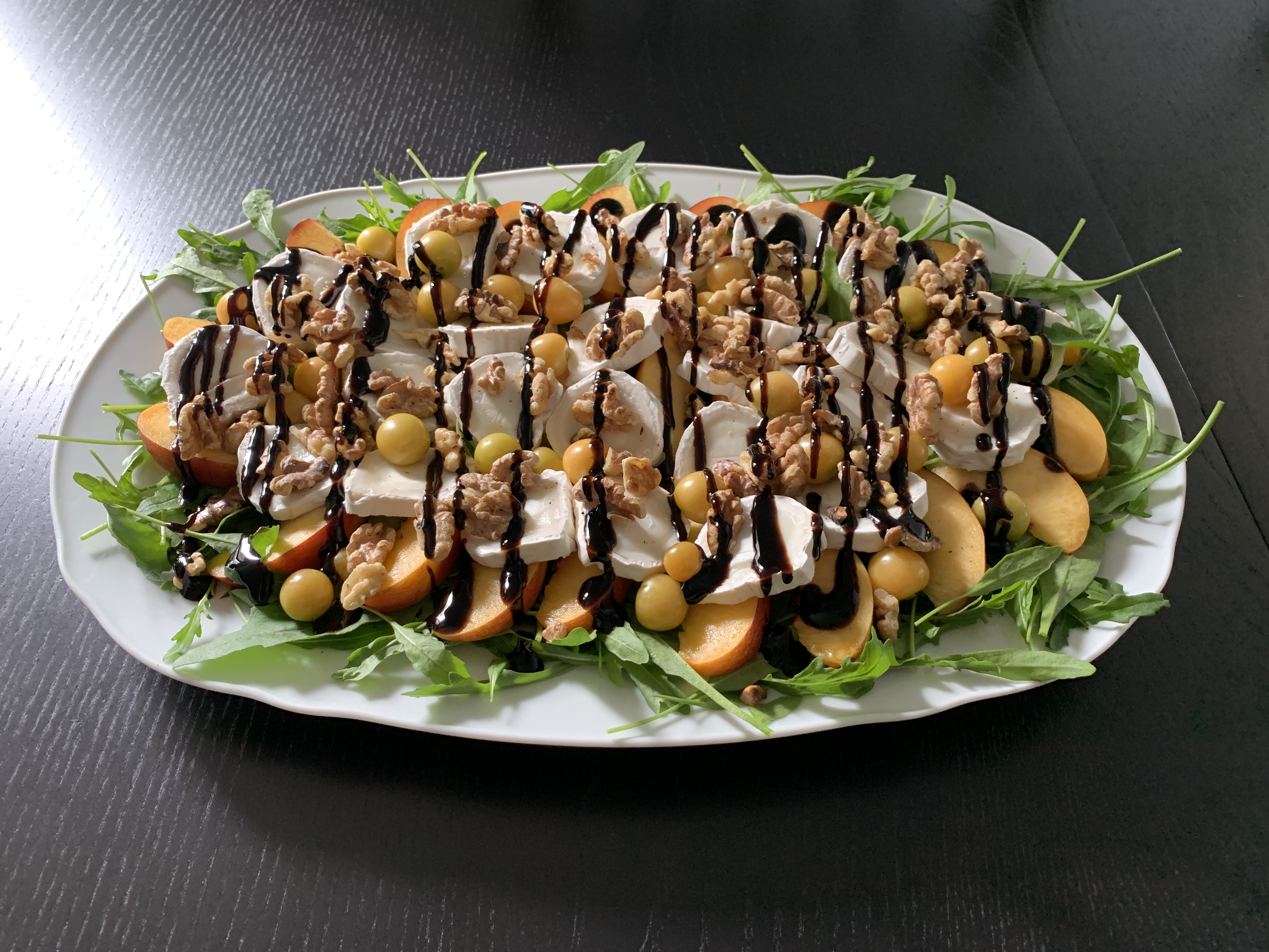 Pese ja lohkoa nektariinit. Pese ja kuivaa rucola ja ananaskirsikat. Pilko vuohenjuusto ja paahda saksanpähkinät kevyesti. Kokoa salaatti ja lisää balsamico.