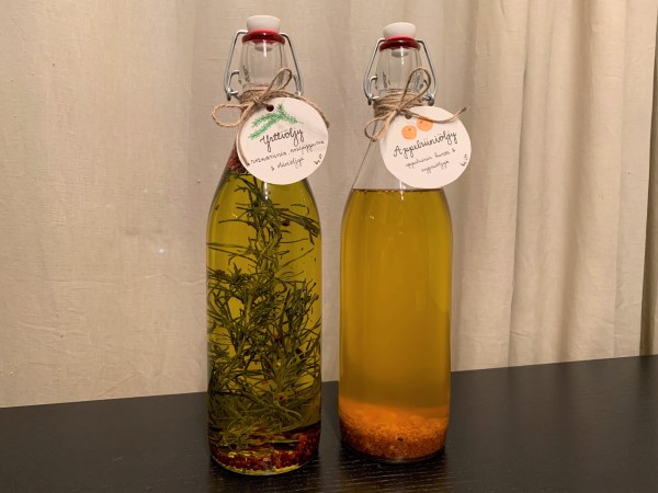 Appelsiiniöljy 9 luomu appelsiinin kuori9 dl rypsiöljyä Vuole hyvin pestyistä luomu appelsiineista oranssi kuori ohuina suikaleina niin ettei mukaan tule valkoista kuorta. Kuivaa kuoret rapeiksi miedolla lämmöllä uunissa, pyöräytä kuoret hienoksi tehosekoittimessa ja kaada pullon pohjalle. Öljy on valmista käytettäväksi jo muutamassa päivässä, mutta maustuu tietenkin enemmän vanhetessaan. Säilyy paremmin pimeässä ja viileässä. Yrttiöljy 3... Continue Reading →